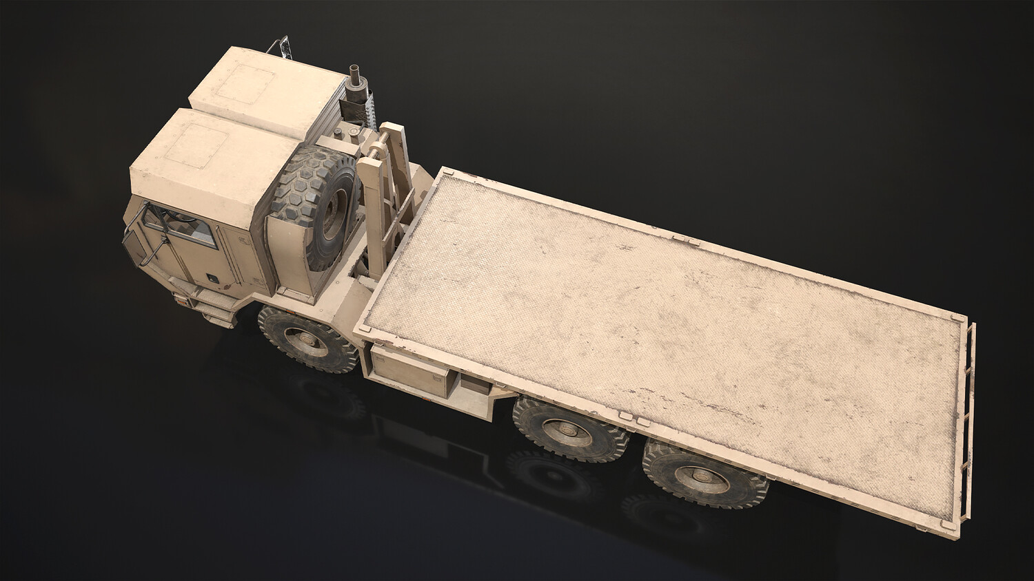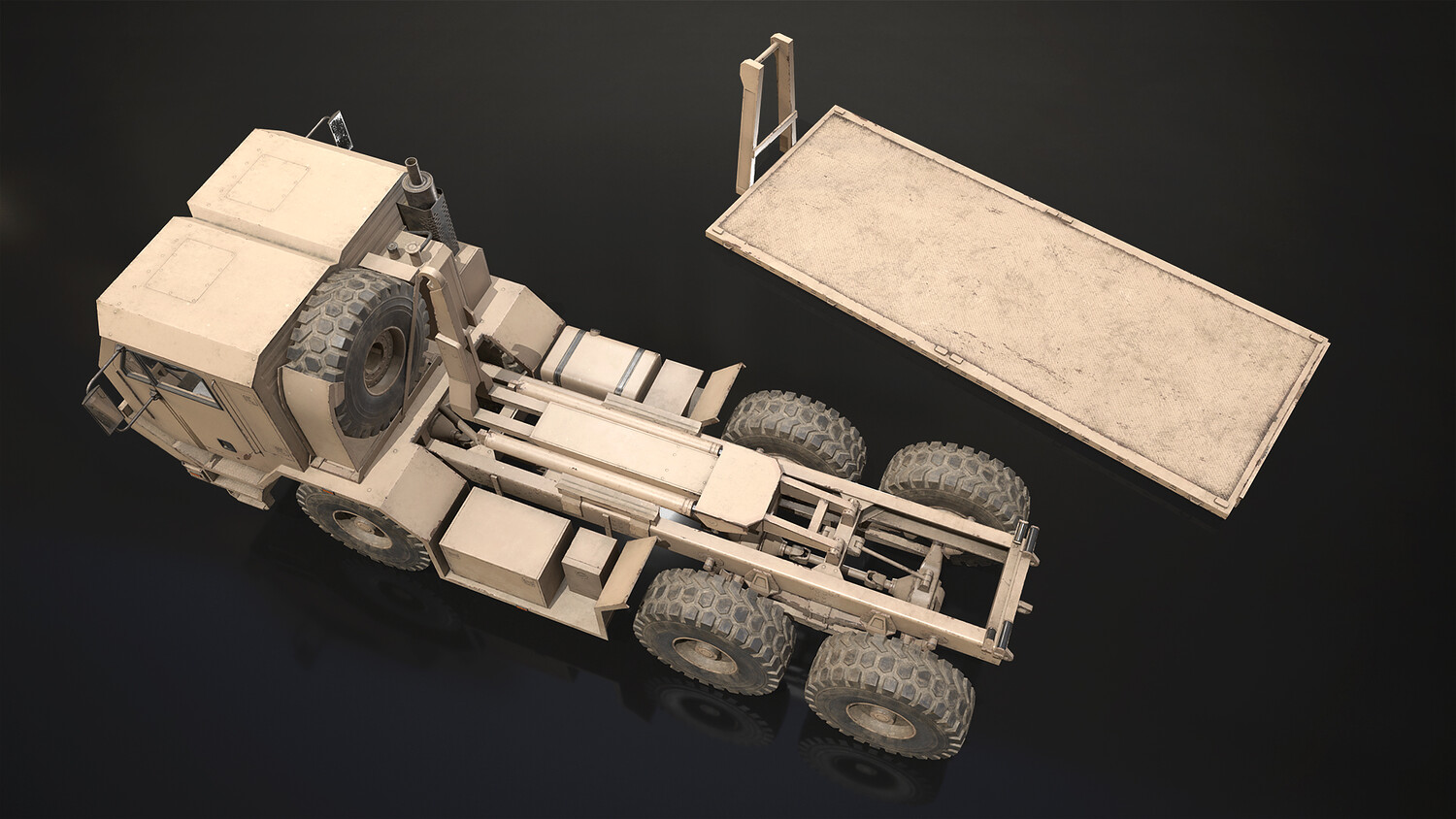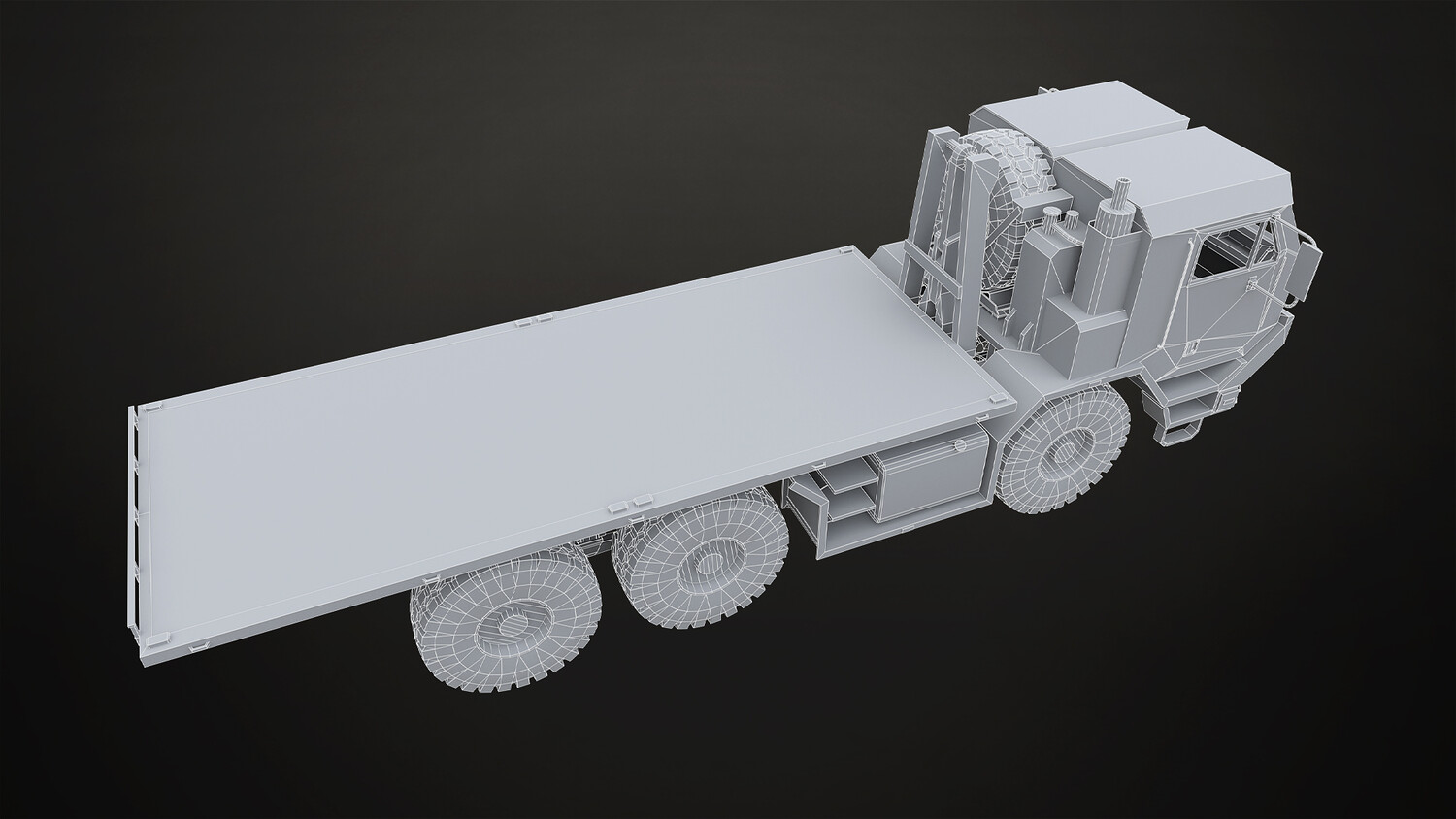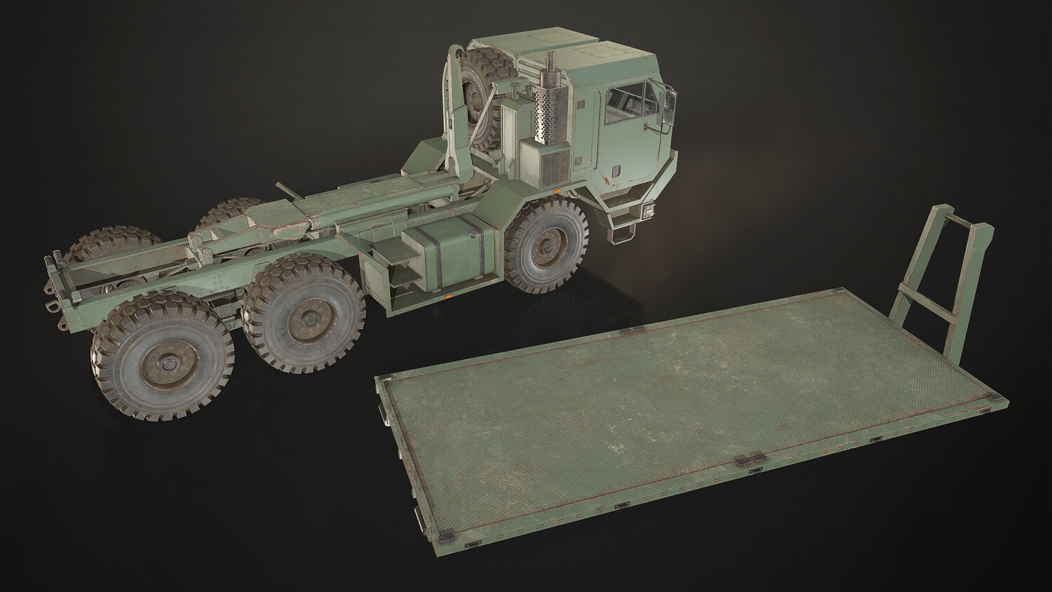 - All doors, wheels, steering wheel and shifter are separate objects and can be easily rigged/animated. Flatbed parts such as bed, arm and hydraulic cylinders also separated, ready to rig/animate (model NOT animated). It can all be detached if desired to use only truck chassis.