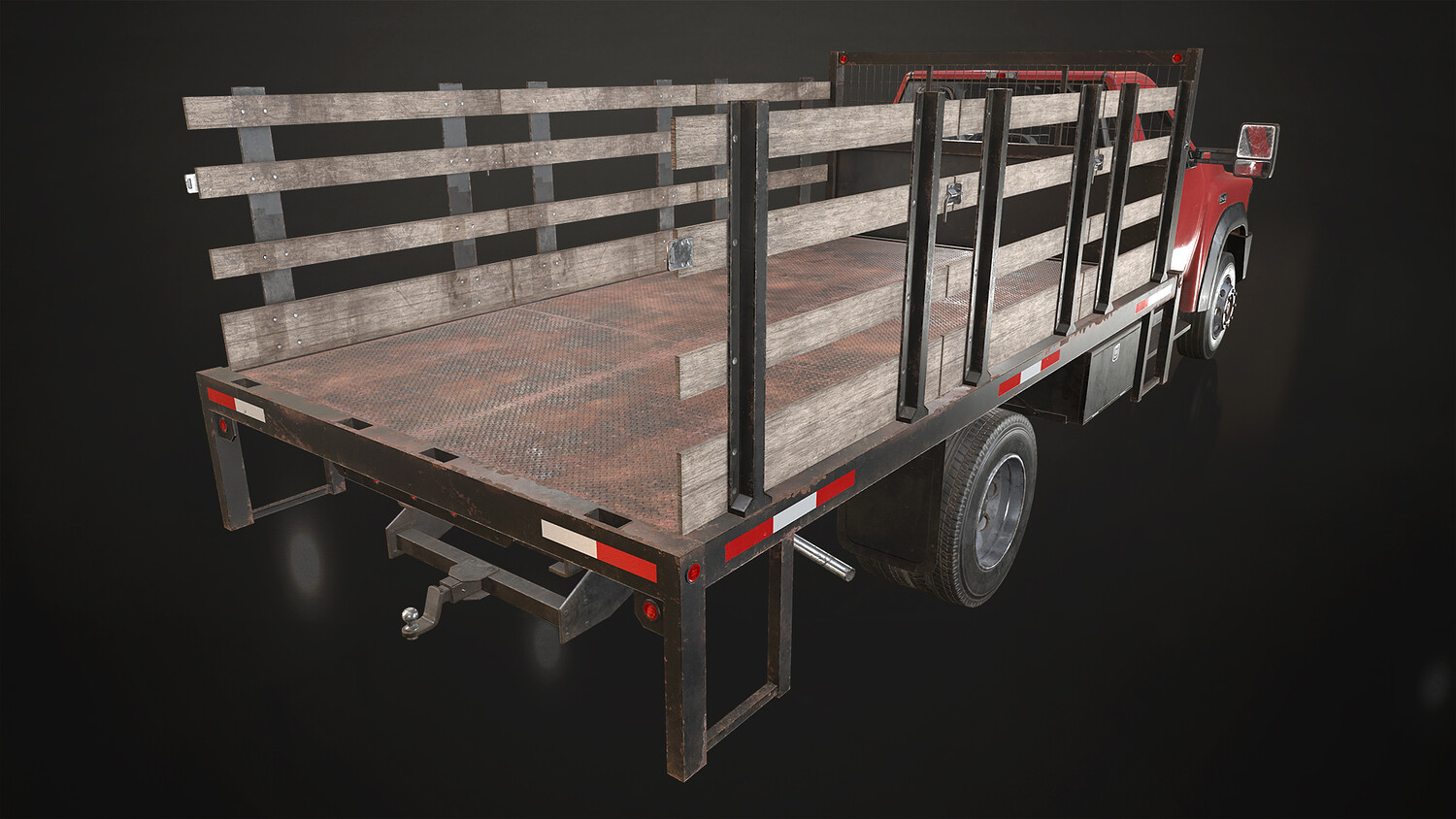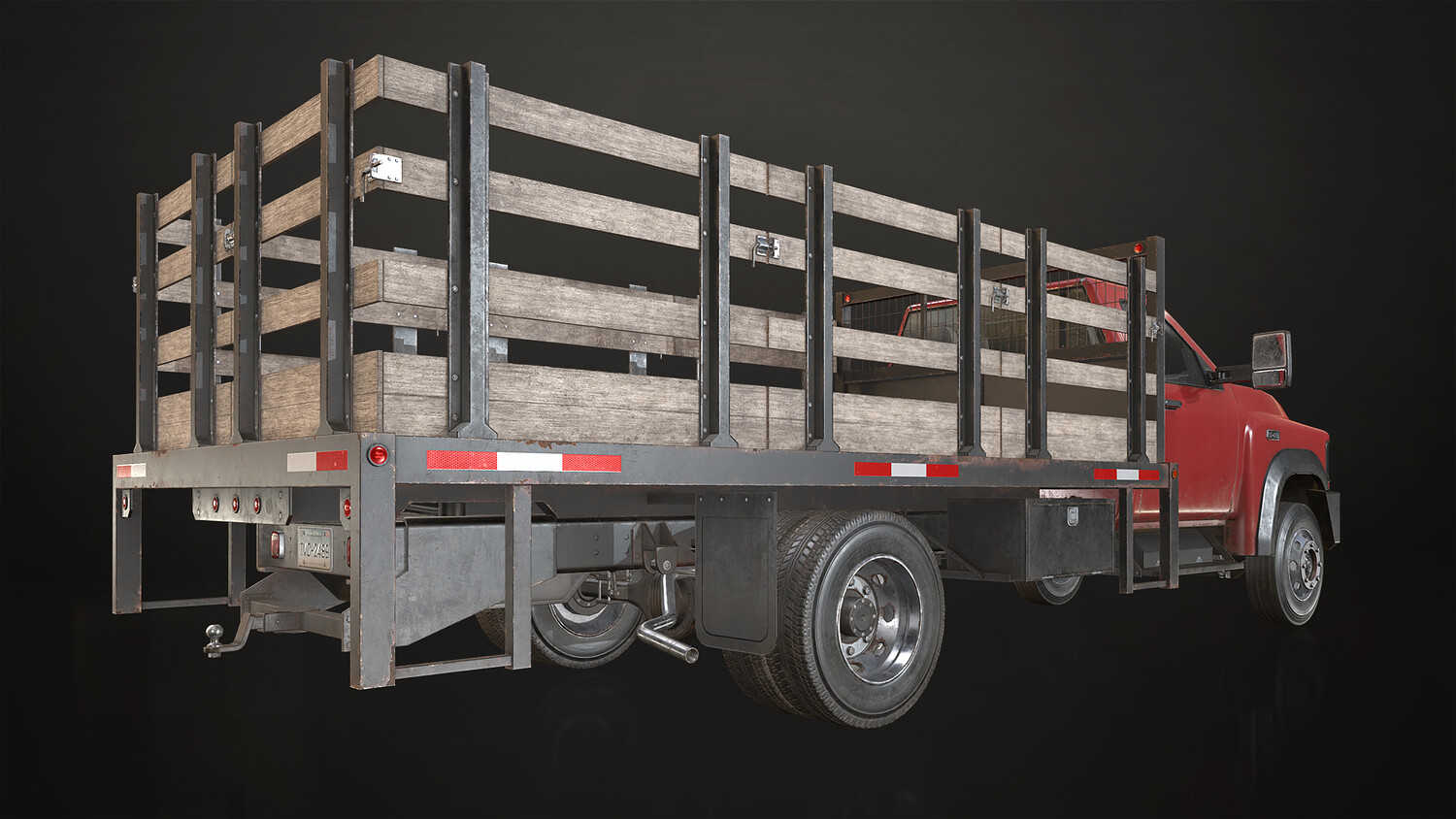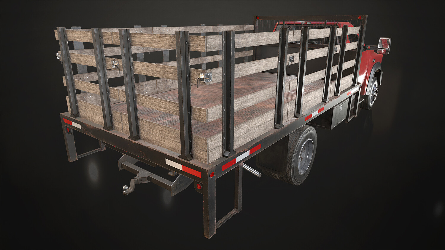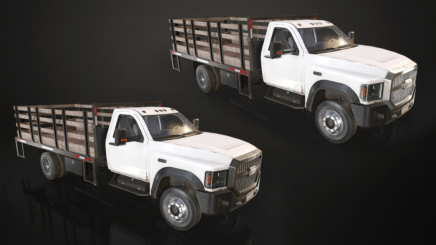 The package includes a truck base with multiple visual configurations, built with realistic proportions and optimized geometry. The stake bed module features removable wooden side and rear panels (stake) as separate meshes, allowing it to be used as a fully enclosed stake bed or a flatbed. Module can also be detached to use chassis individually.