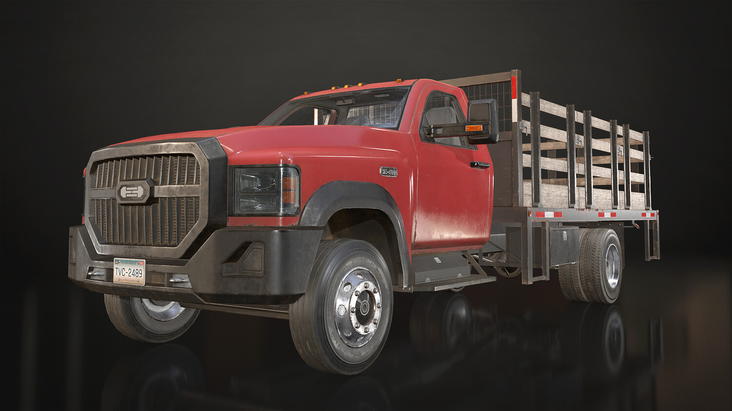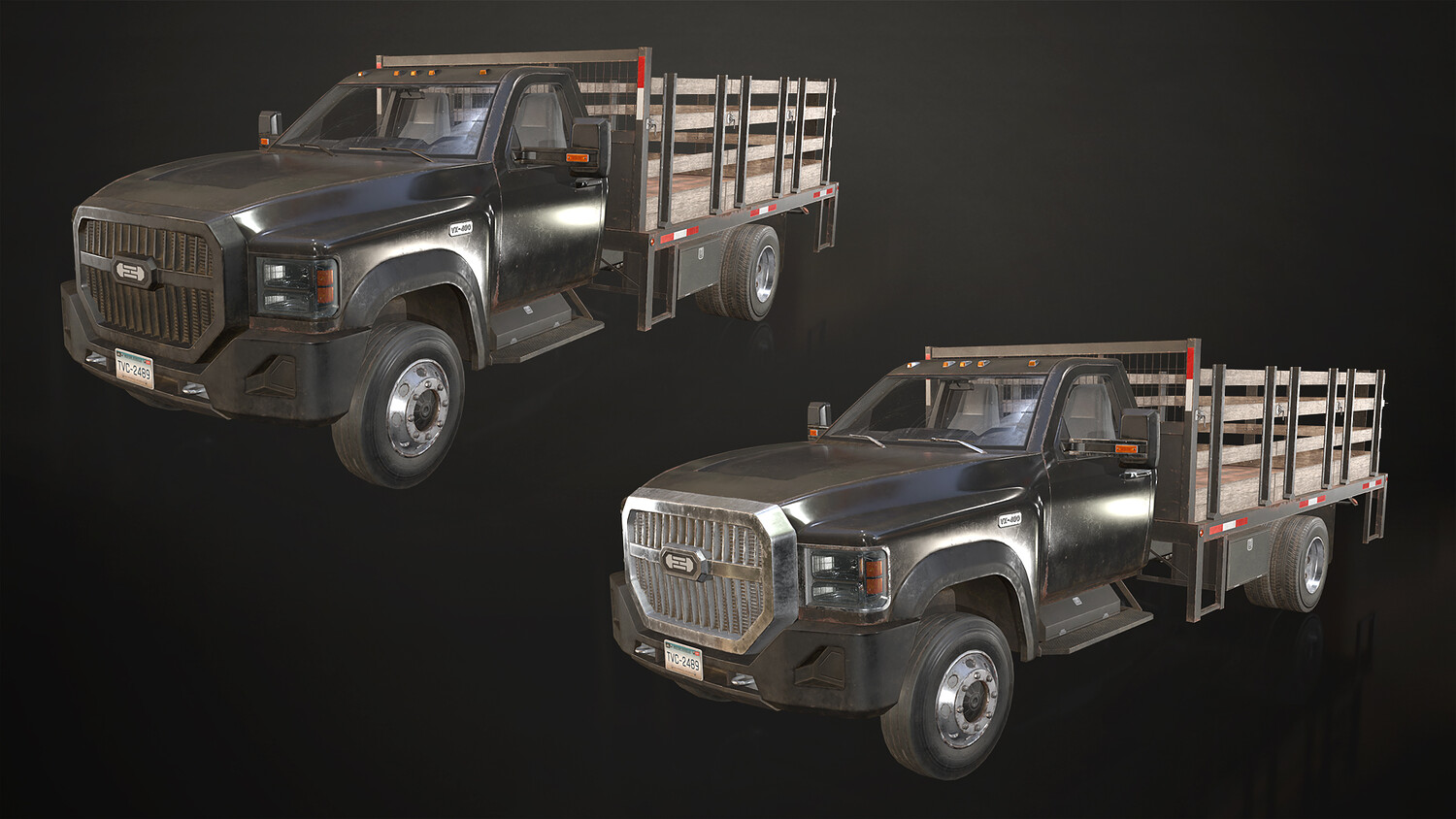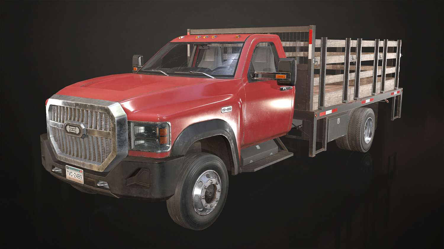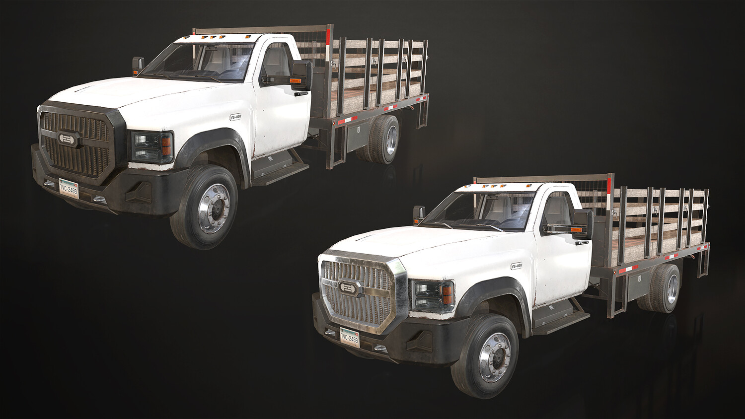 The package includes a truck base with multiple visual configurations, built with realistic proportions and optimized geometry. The stake bed module features removable wooden side and rear panels (stake) as separate meshes, allowing it to be used as a fully enclosed stake bed or a flatbed. Module can also be detached to use chassis individually.