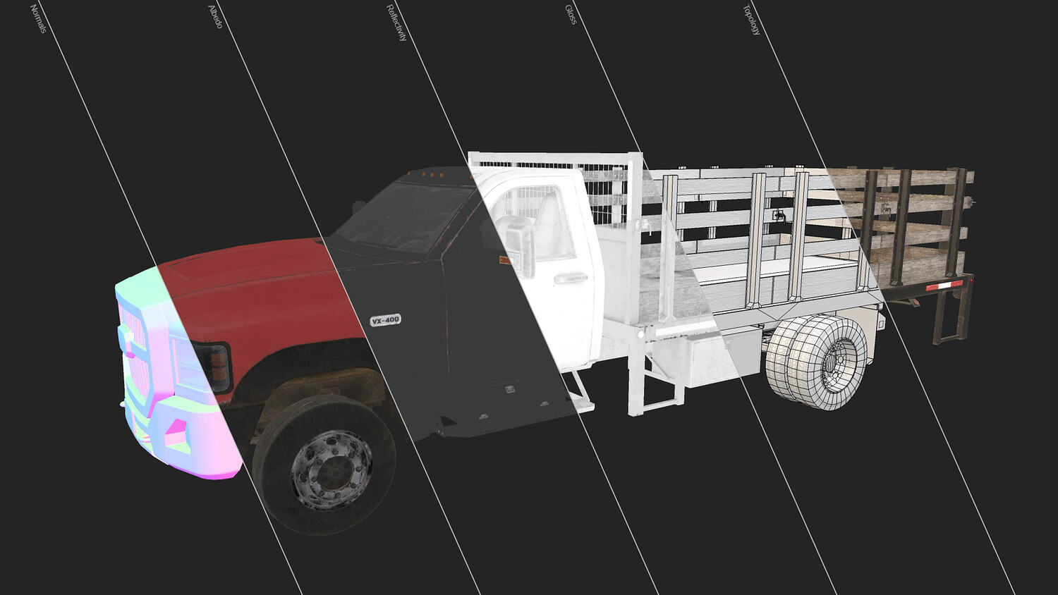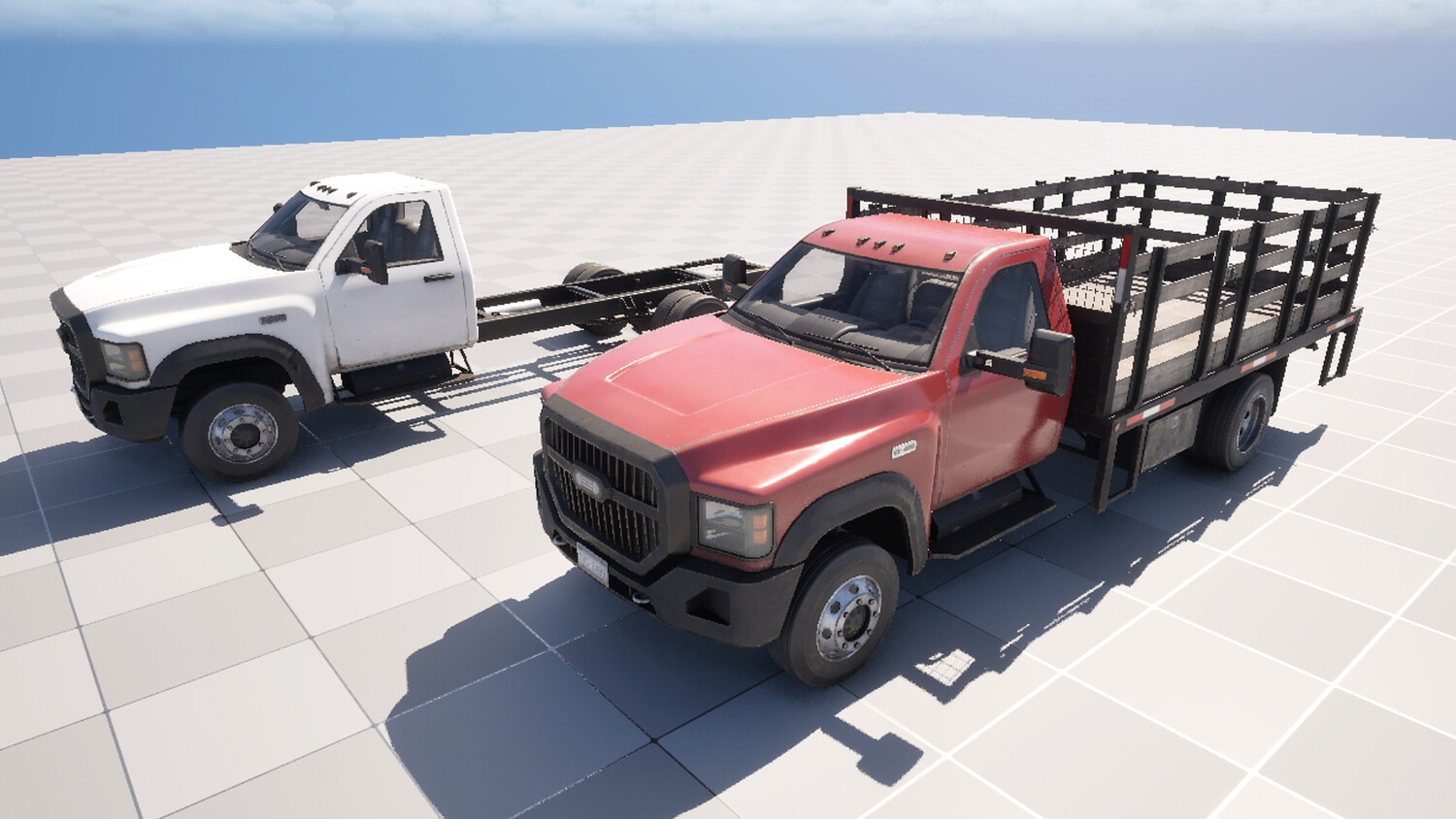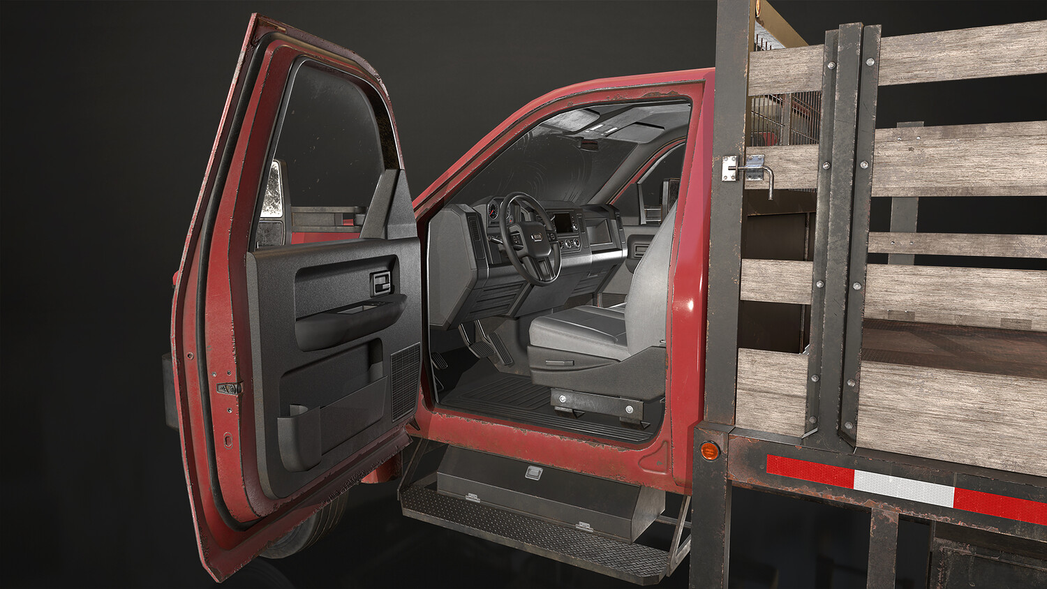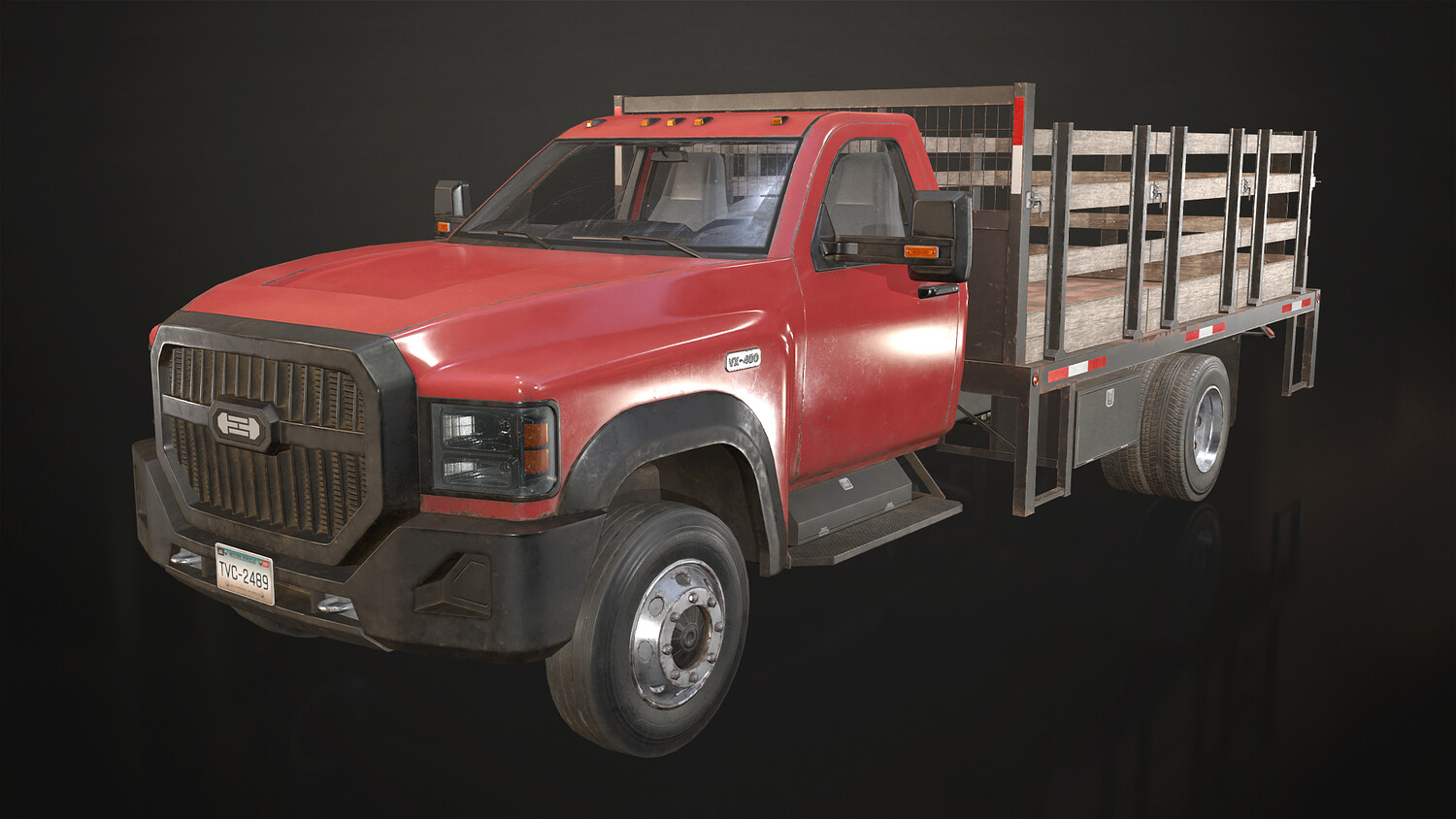 The package includes a truck base with multiple visual configurations, built with realistic proportions and optimized geometry. The stake bed module features removable wooden side and rear panels (stake) as separate meshes, allowing it to be used as a fully enclosed stake bed or a flatbed. Module can also be detached to use chassis individually.