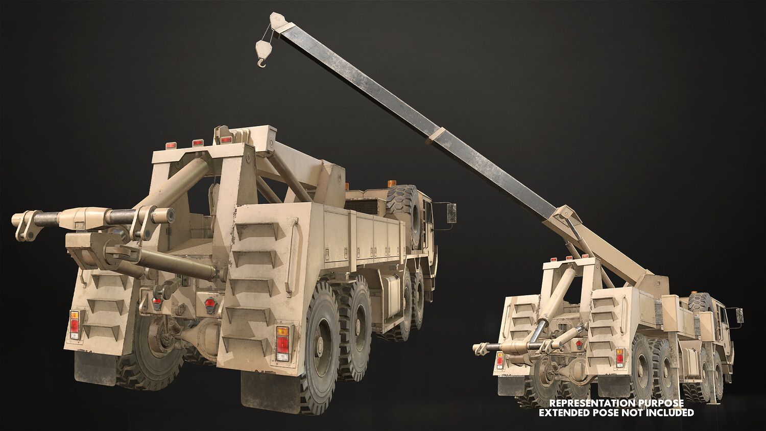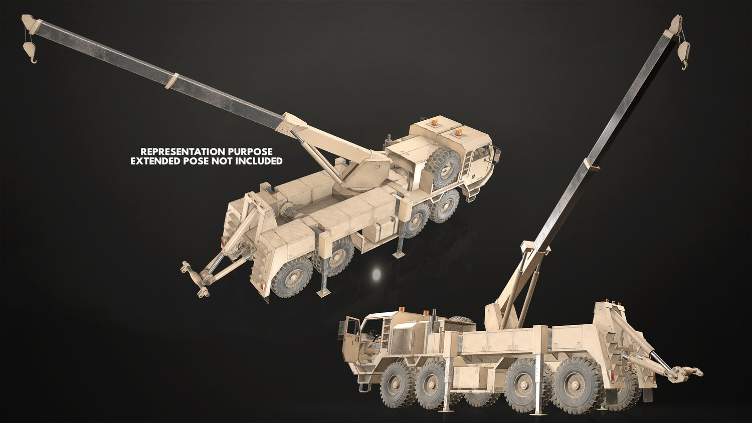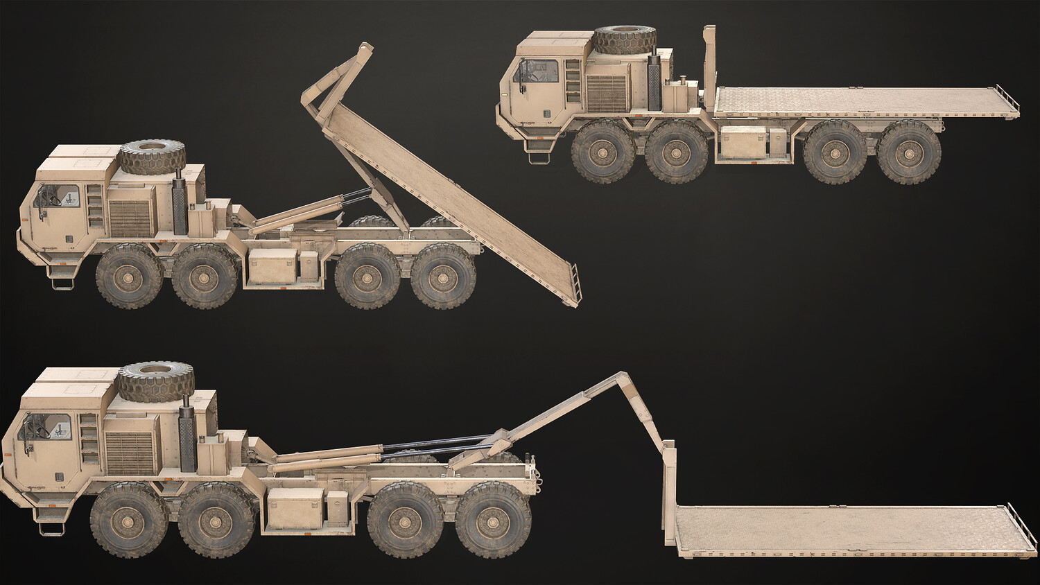 - All doors, wheels, steering wheel, shifter and fifth wheel are separate objects and can be easily rigged/animated. Wrecker parts (such as crane, tow, outriggers), Flatbed parts and Cargo parts (cover, structure, doors) are also separated, ready to rig/animate (models NOT animated). It can all be detached if desired to use only truck chassis.