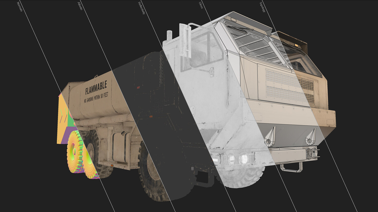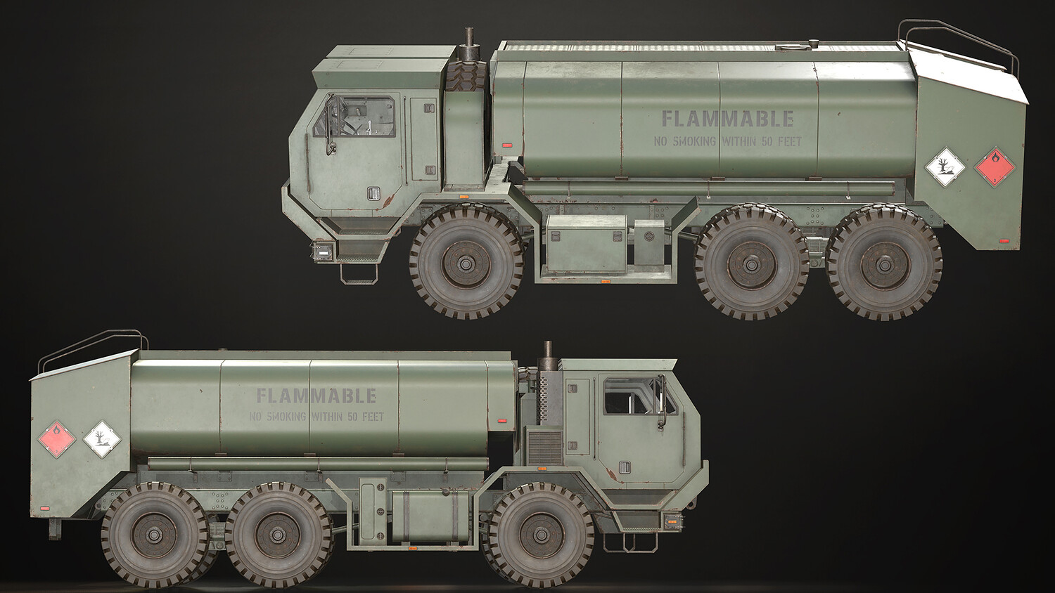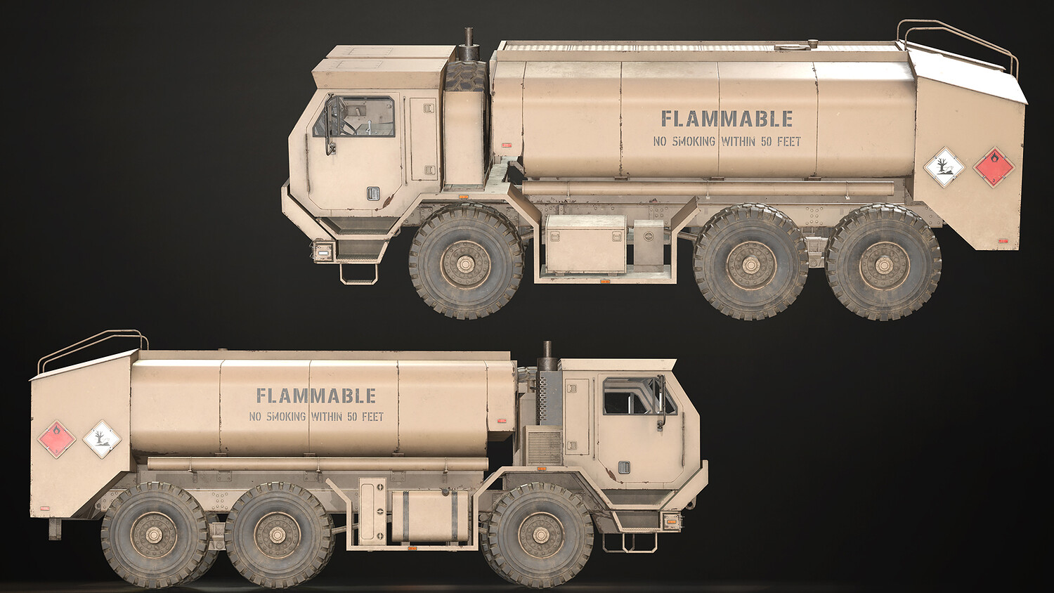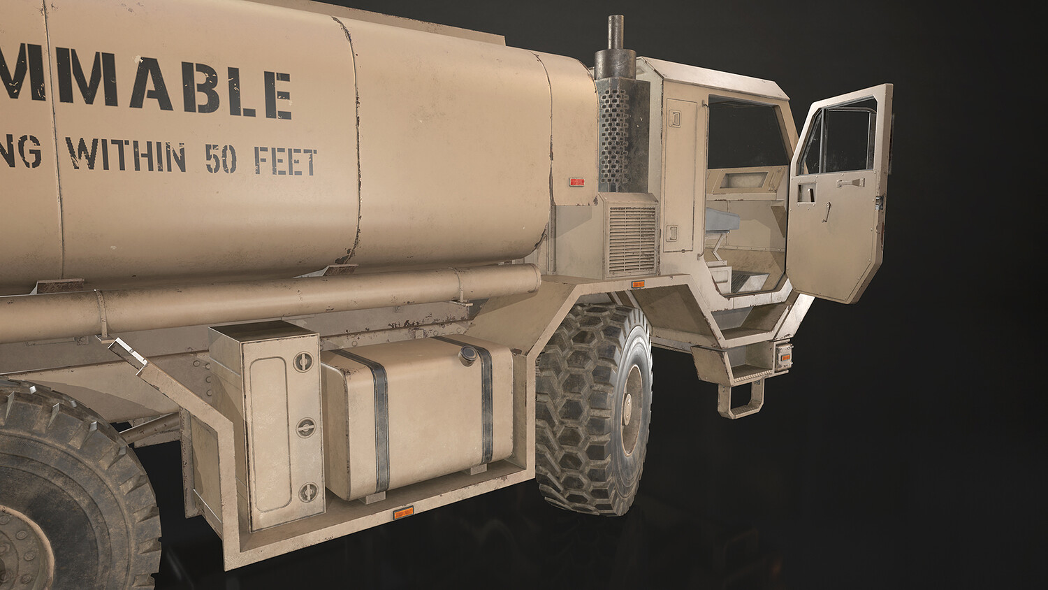 - All doors, wheels, steering wheel and shifters are separate objects and can be easily rigged/animated. Tanker can be detached if desired to use only truck chassis.