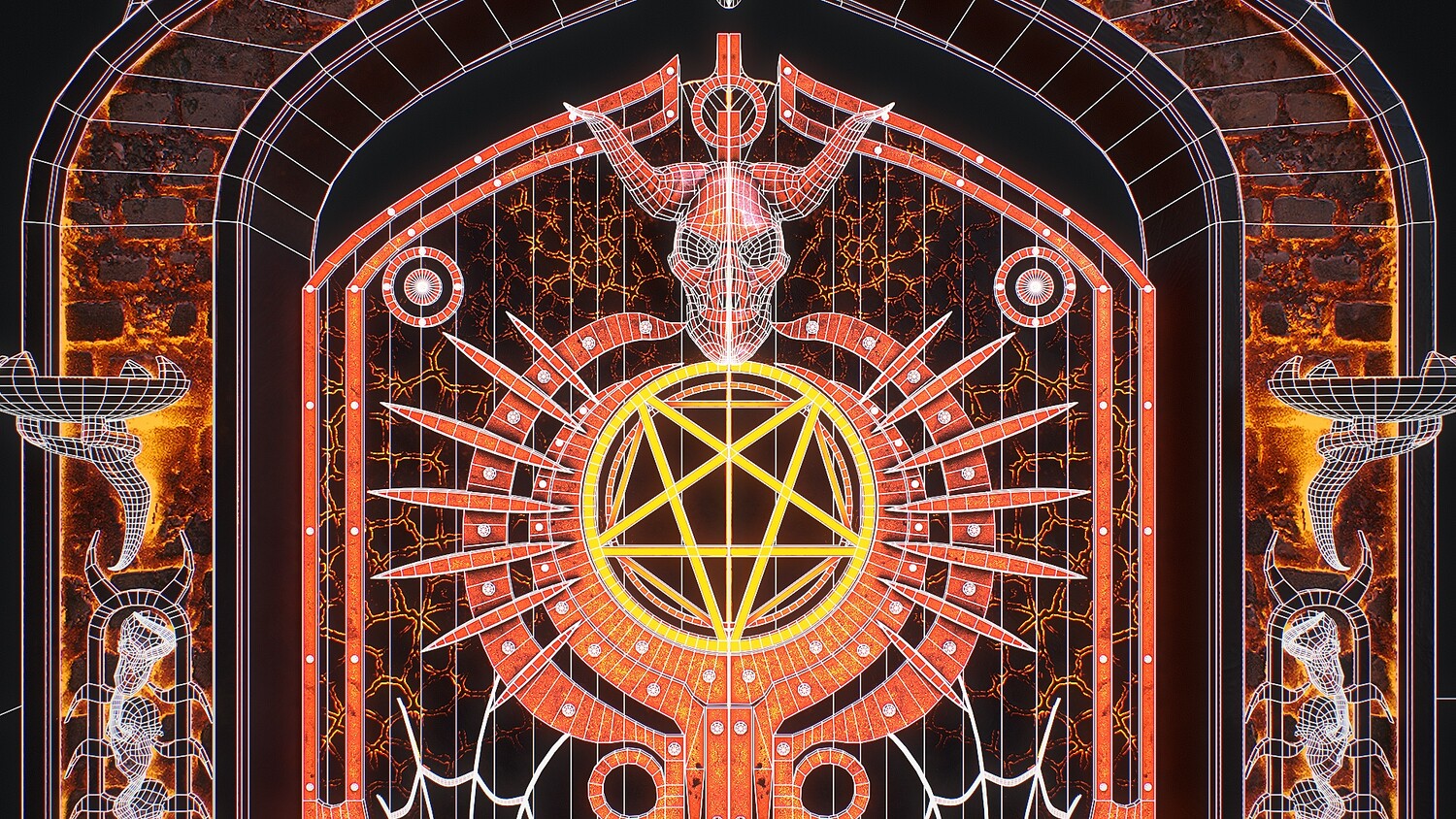 medieval, door, arch, stone, architecture, steps, ladder, old, plant, bush, magic, lights, flame, decoration, modular, brick, dirt, castle, gates, road, lantern, pentacle, devil, essence,