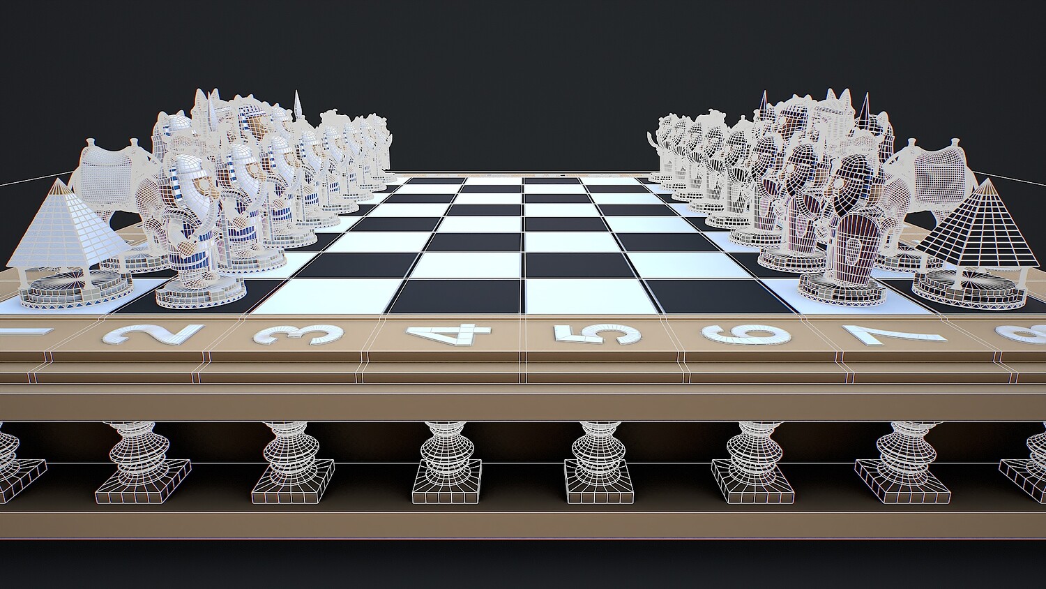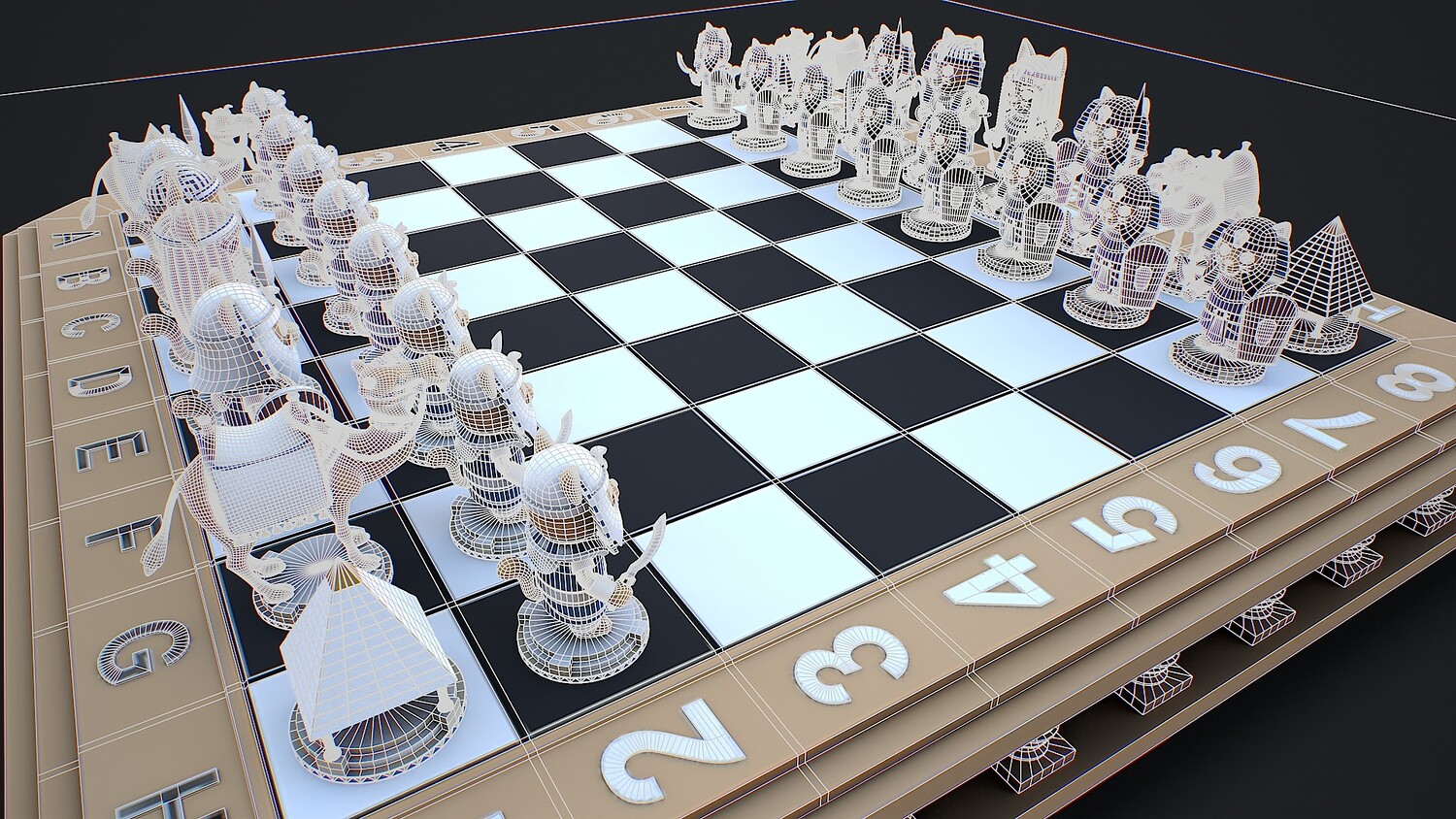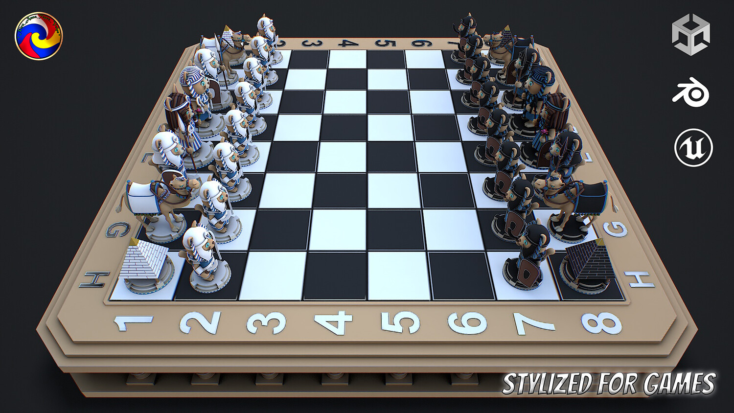 Hello. This is a high definition quality polygon of a Chess Pharaohs game ready 3D Model with PBR textures. Extremely detailed and realistic. Executed in a stylized gaming style. Suitable for movie prop, architectural visualizations, advertising renders, games, VR, AR and other. The archive includes Obj and FBX, Marmoset scene, Blender scene, HDRI, textures for the PBR: Base color, Metallic, Mixed AO, NormalOpenGL, Roughness. And also included in the archive textures for UE: BaseColor, Normal, OcclusionRoughnessMetallic. All textures are 2K resolution. The model contains 33 object: bishopwhiteblack, chessboard, kingwhiteblack, knightwhiteblack, pawnwhiteblack, queenwhiteblack, rookwhiteblack.