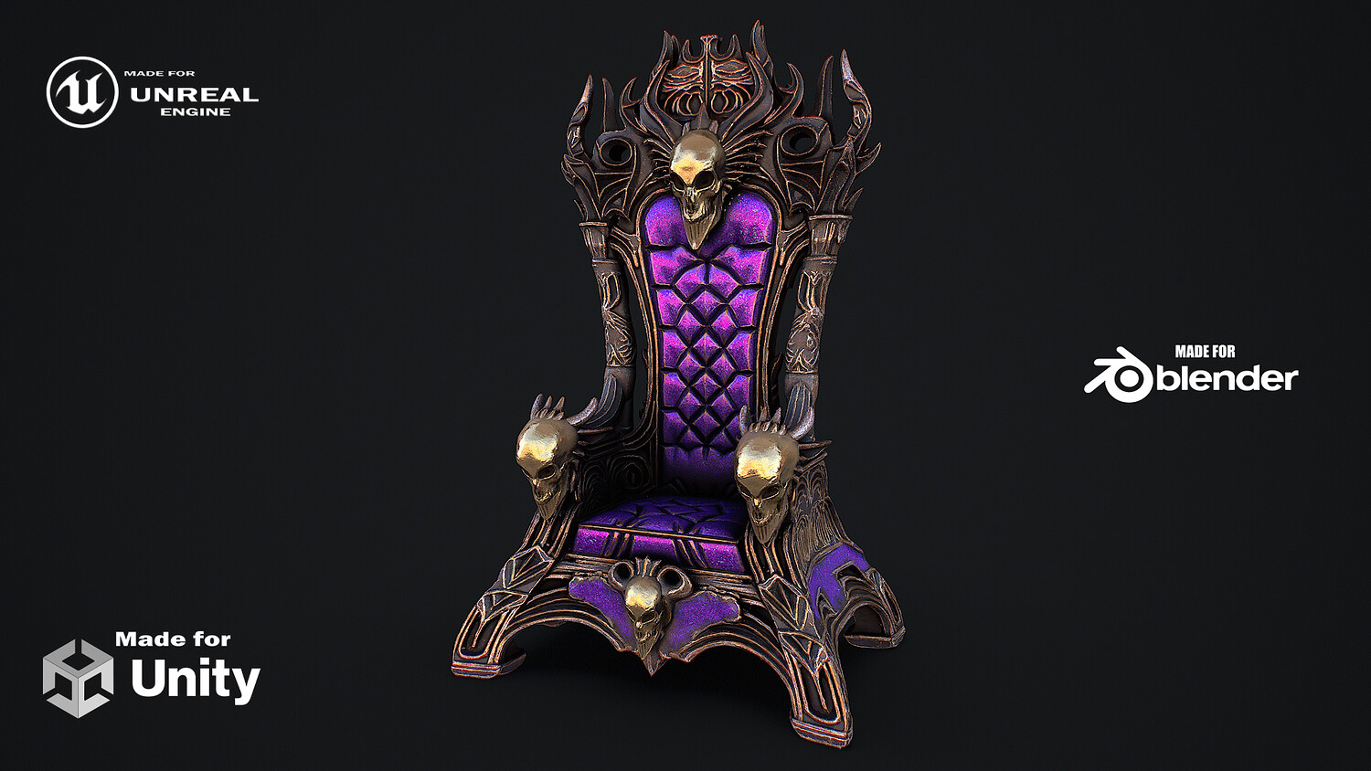 Hello. This is a high definition quality polygon of a Fantasy Throne 10 3D Model with PBR textures. Extremely detailed and realistic. Suitable for movie prop, architectural visualizations, advertising renders, games, VR, AR and other. The archive includes Obj and FBX, Marmoset scene, Blender scene, textures for the PBR: Base color, Metallic, Mixed AO, NormalOpenGL, Roughness. And also included in the archive textures for UE: BaseColor, Normal, OcclusionRoughnessMetallic. All textures are 4k resolution. The model contains 1 object: FantasyThrone_10.