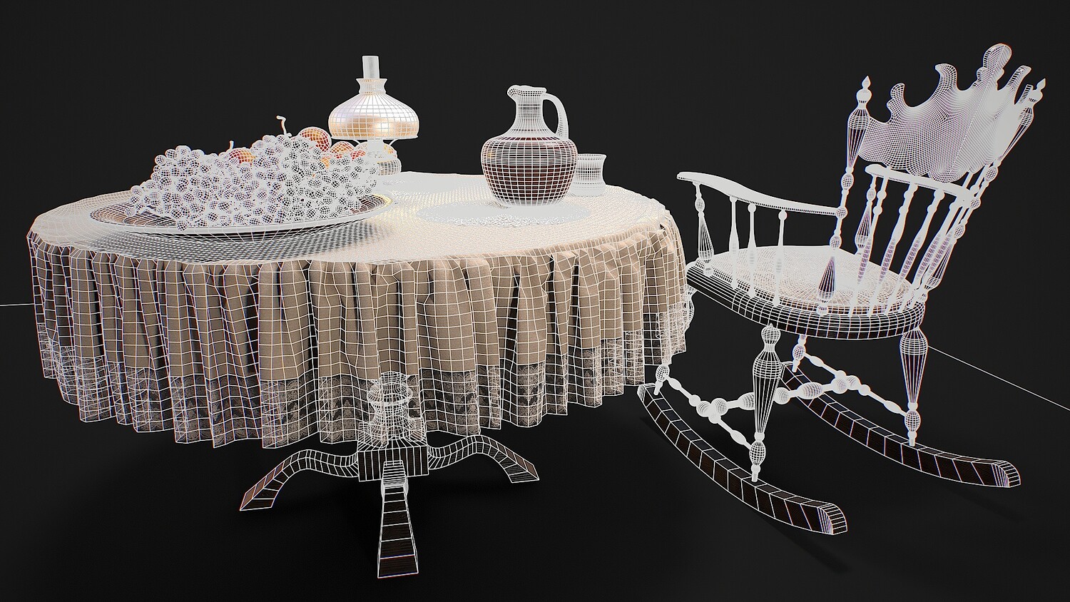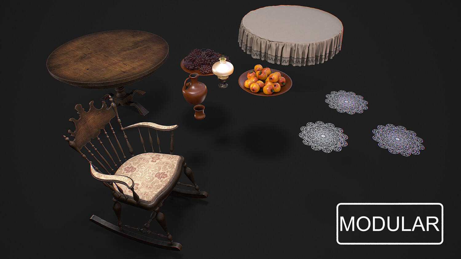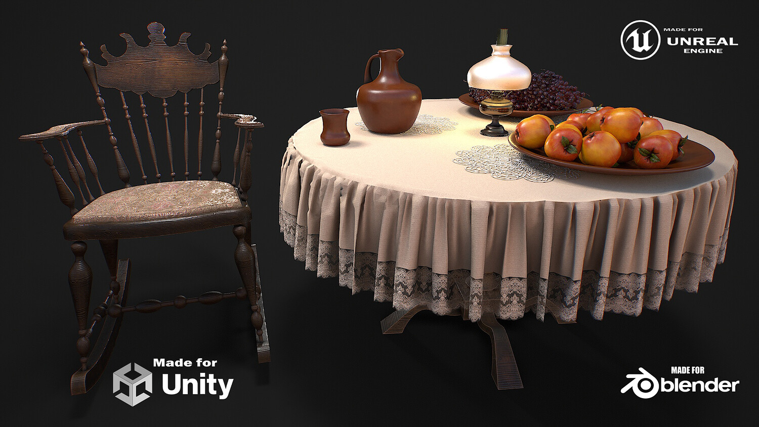 Hello. This is a high definition quality polygon of a Furniture set with dishes and fruits 3D Model with PBR textures. Extremely detailed and realistic. Suitable for movie prop, architectural visualizations, advertising renders, games, VR, AR and other. The archive includes Obj and FBX, Marmoset scene, Blender scene, textures for the PBR: Base color, Metallic, Mixed AO, Normal_OpenGL, Roughness. And also included in the archive textures for UE: BaseColor, Normal, OcclusionRoughnessMetallic. All textures are 4k resolution. The model contains 42 objects: apple-16, cup-1, doily-3, grape-15, jug-1, oil lamp-1, plate-2, rocking chair-1, table-1, tablecloth-1.
