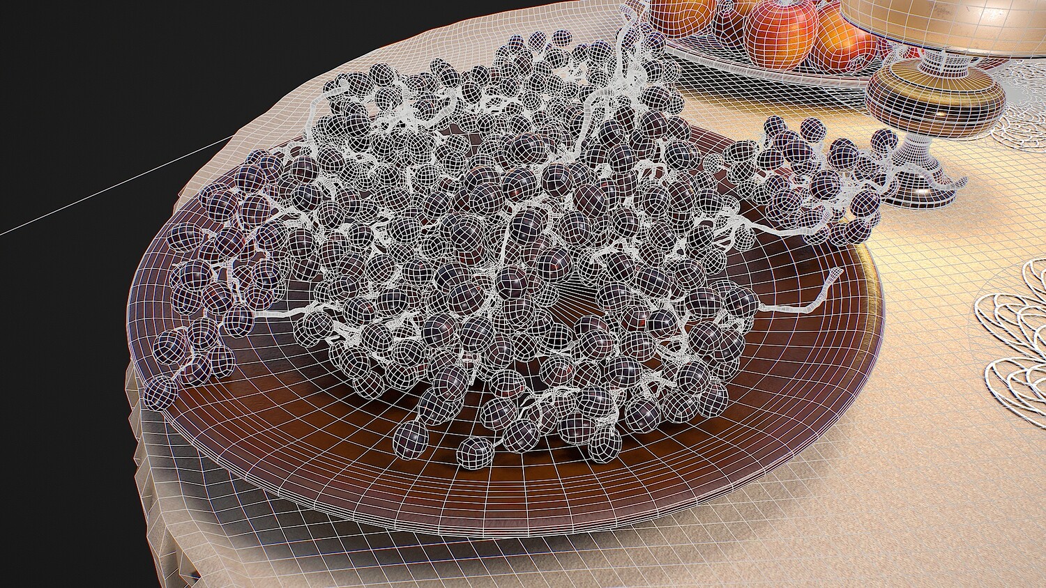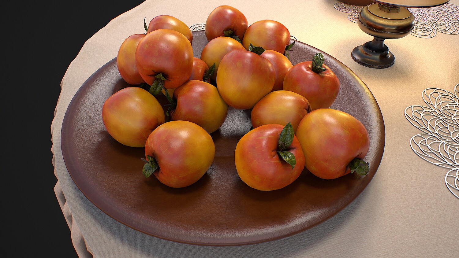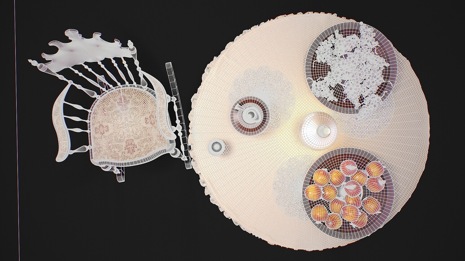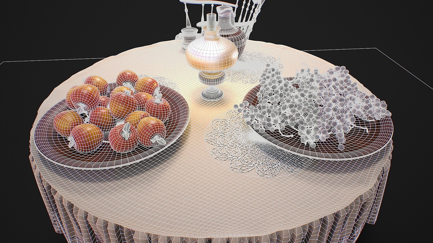 Hello. This is a high definition quality polygon of a Furniture set with dishes and fruits 3D Model with PBR textures. Extremely detailed and realistic. Suitable for movie prop, architectural visualizations, advertising renders, games, VR, AR and other. The archive includes Obj and FBX, Marmoset scene, Blender scene, textures for the PBR: Base color, Metallic, Mixed AO, Normal_OpenGL, Roughness. And also included in the archive textures for UE: BaseColor, Normal, OcclusionRoughnessMetallic. All textures are 4k resolution. The model contains 42 objects: apple-16, cup-1, doily-3, grape-15, jug-1, oil lamp-1, plate-2, rocking chair-1, table-1, tablecloth-1.