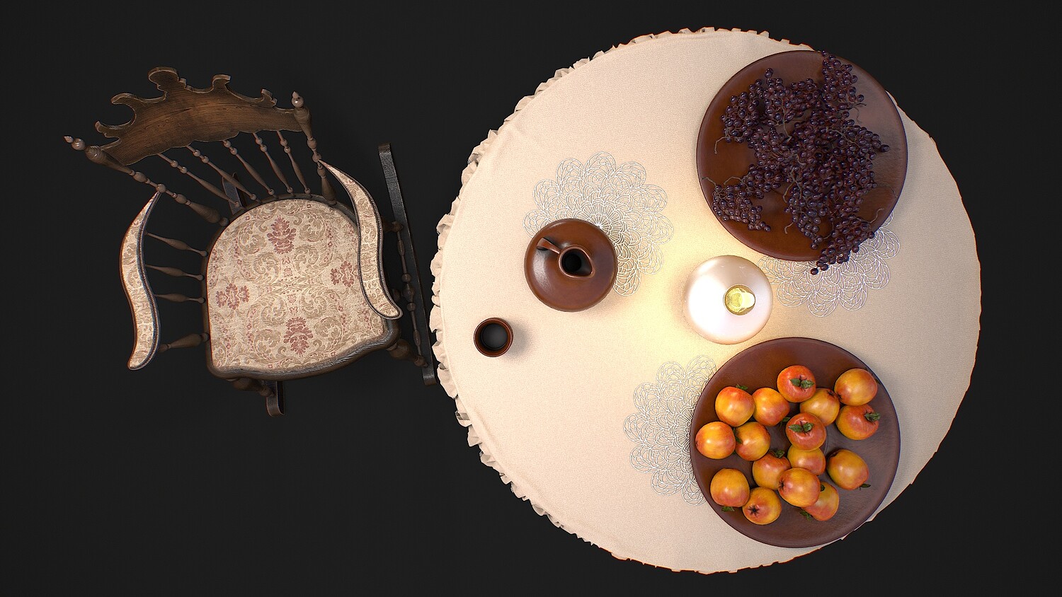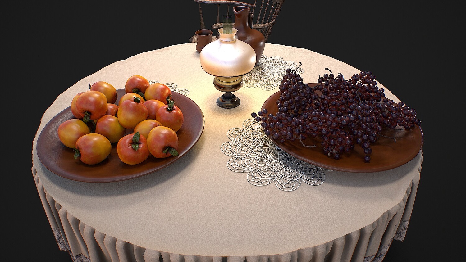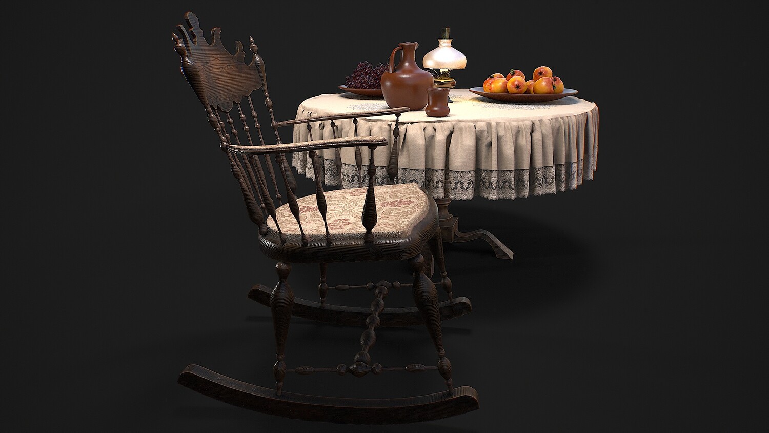 furniture, set, dishes, fruits, rocking, chair, table, tablecloth, jug, cup, plate, doily, apple, grape, lamp, oil, village, interior, decoration, food, drink,