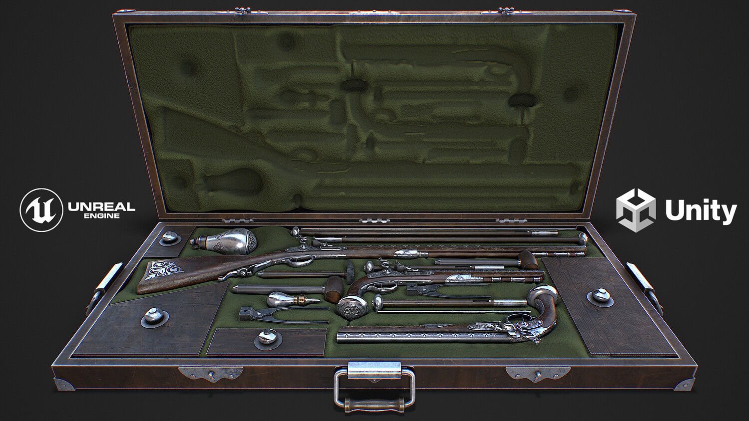 Hello. This is a high definition quality polygon of a Flintlock Gun Case 3D Model with PBR textures. Extremely detailed and realistic. Suitable for movie prop, architectural visualizations, advertising renders, games, VR, AR and other. The archive includes Obj and FBX, Marmoset scene, textures for the Unity: Base color, Metallic, Mixed AO, NormalOpenGL, Roughness. And also included in the archive textures for UE: BaseColor, Normal, OcclusionRoughnessMetallic. All textures are 4k resolution. The number of materials corresponds to the number of main objects in the scene. There are 28 materials in the scene: BulletCastingTool, fabric, Flintlockguncasebottom, Flintlockguncasetop, Flintlockmusket, Flintlockmusketramrod, Flintlockpistol, Flintlockpistolramrod, Flintlockpistolshelfflint, Flintlockpistolspring, Flintlockpistoltrigger, leadbullet, lid, lidrectangle, lidrectangle002, lidrectangle001, metalhammer, metalramrod, Flintlockmuskettrigger, oiler, powderbag, powderflask, ramrodnozzle, wooden_hammer. The model contains 317 objects.
