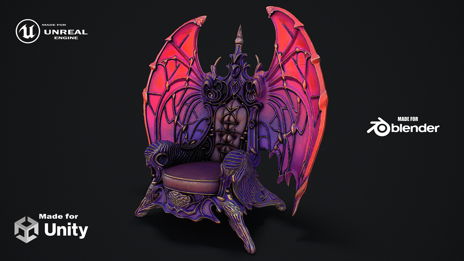 Hello. This is a high definition quality polygon of a Fantasy Throne 8 3D Model with PBR textures. Extremely detailed and realistic. Suitable for movie prop, architectural visualizations, advertising renders, games, VR, AR and other. The archive includes Obj and FBX, Marmoset scene, Blender scene, textures for the PBR: Base color, Metallic, Mixed AO, NormalOpenGL, Roughness. And also included in the archive textures for UE: BaseColor, Normal, OcclusionRoughnessMetallic. All textures are 4k resolution. The model contains 1 object: FantasyThrone_8.