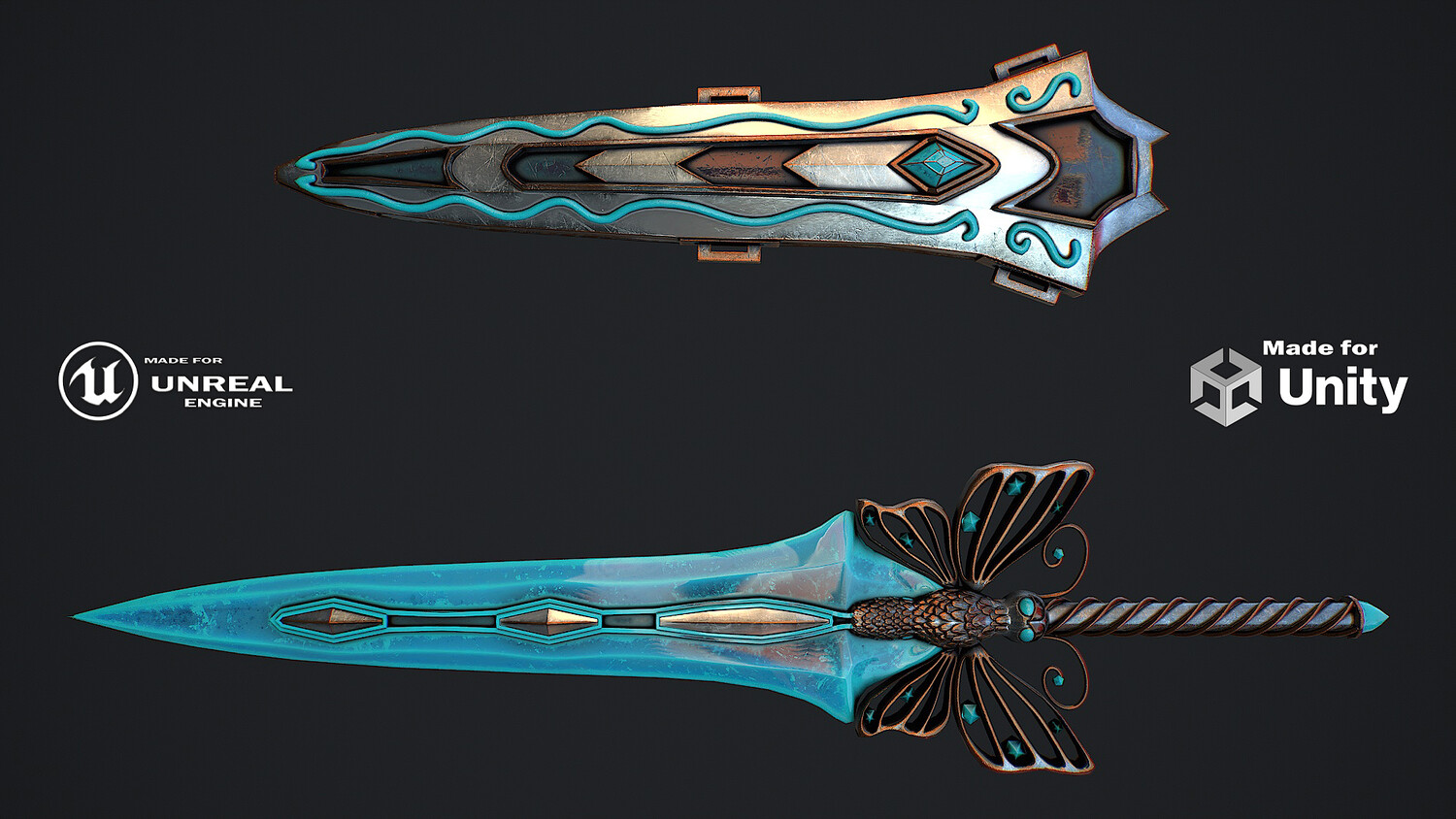Hello. This is a high definition quality polygon of a Sword butterfly with scabbard 3D Model with PBR textures. Extremely detailed and realistic. Suitable for movie prop, architectural visualizations, advertising renders, games, VR, AR and other. The archive includes Obj and FBX, Marmoset scene, textures for the Unity: Base color, Metallic, Mixed AO, NormalOpenGL, Roughness. And also included in the archive textures for UE: BaseColor, Normal, OcclusionRoughnessMetallic. All textures are 4k resolution. The number of materials corresponds to the number of main objects in the scene. There are 2 materials in the scene: scabbardbatterfly, sword_butterfly. The model contains 2 objects.