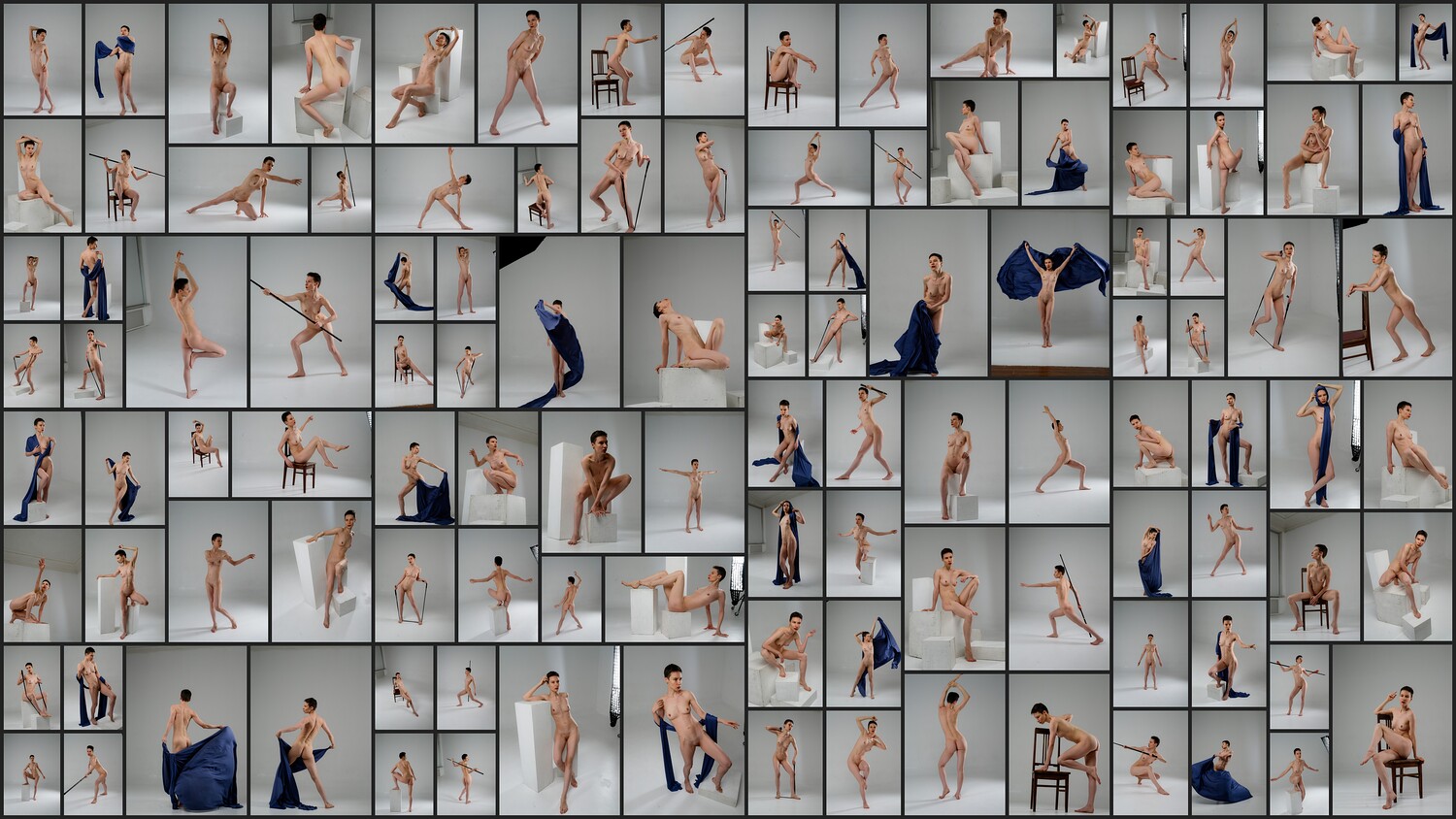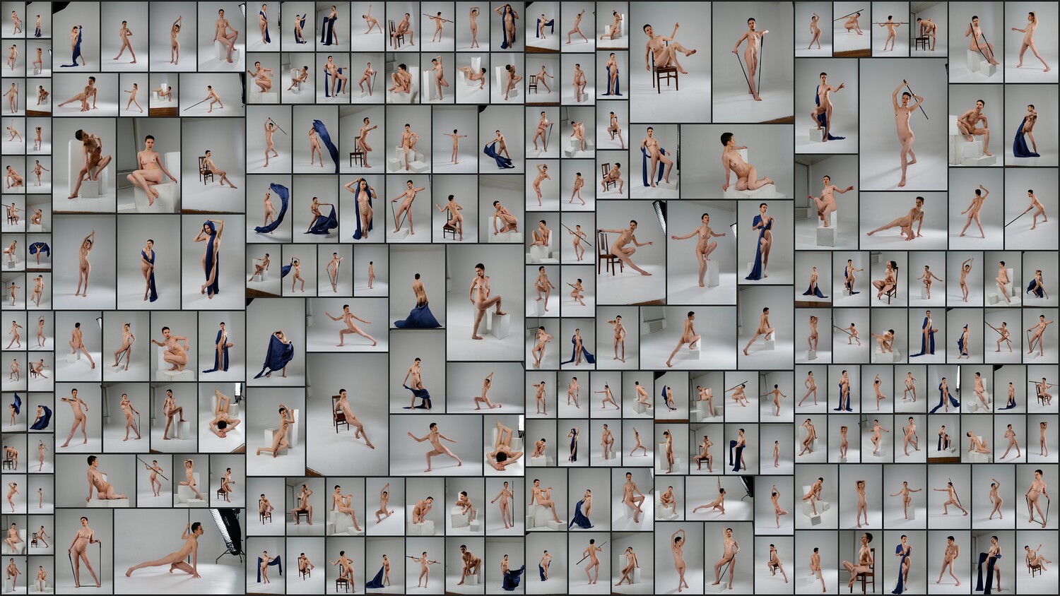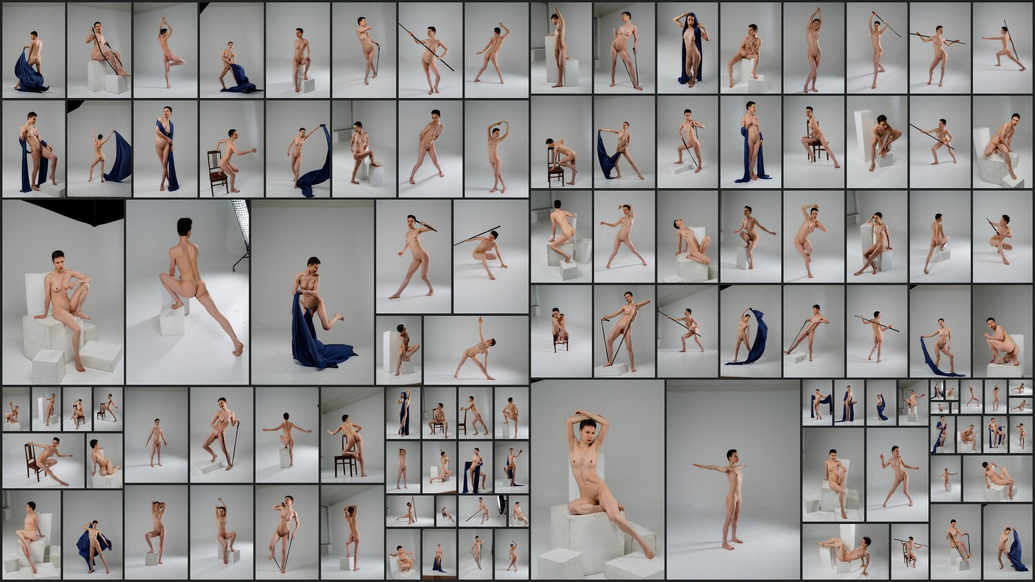 This photo reference pack includes over 1100 high-resolution images featuring a nude female model in a wide range of sketching poses. The collection captures both static and dynamic positions from multiple angles, providing an excellent base for studying anatomy, gesture, and form. The model interacts with various props, including wooden boxes of different shapes, a staff, a fitness band, and fabric, helping artists understand movement and tension in realistic contexts. Lighting is set to highlight the form and structure of the body, making the pack ideal for concept artists, illustrators, sculptors, and anyone practicing figure drawing.