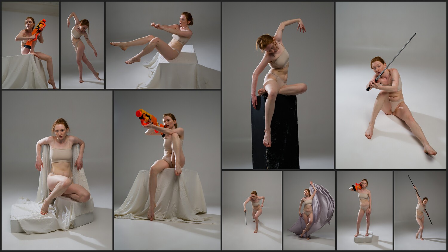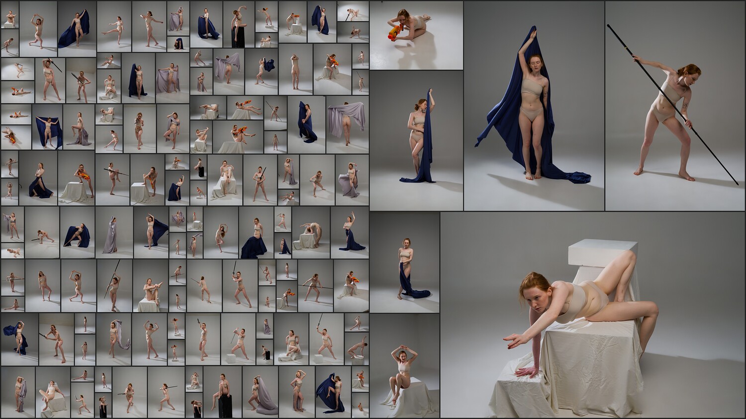 The set includes poses with a sword, a large stylized blaster, a staff, and flowing silk fabric in two colors — adding variety and helping to understand movement, balance, and the interaction between the body and props. Lighting is carefully chosen to emphasize the form, and each image is crafted to serve as an inspiring tool for artists, sculptors, illustrators, and 3D creators.
