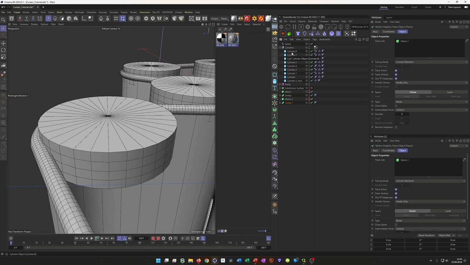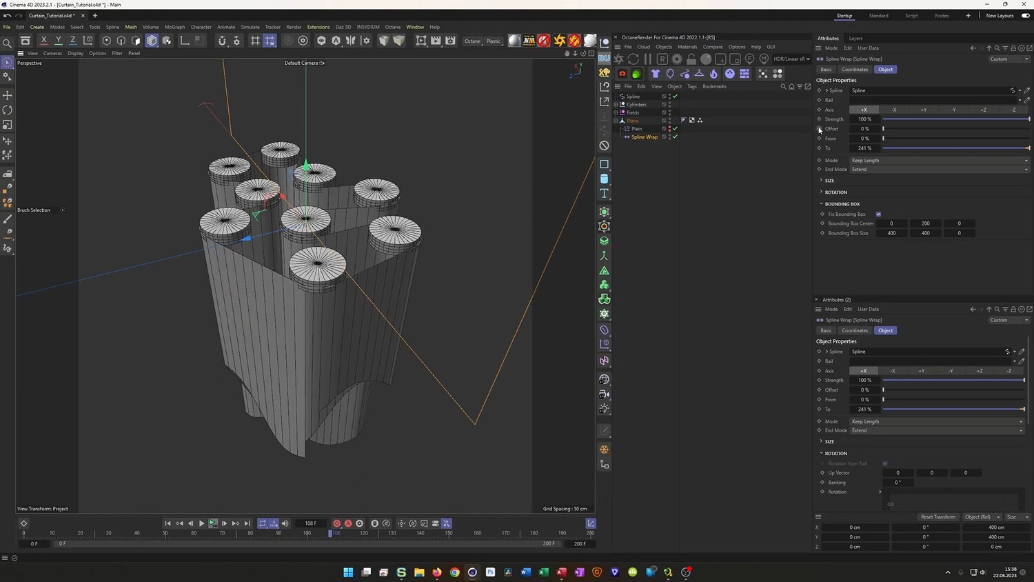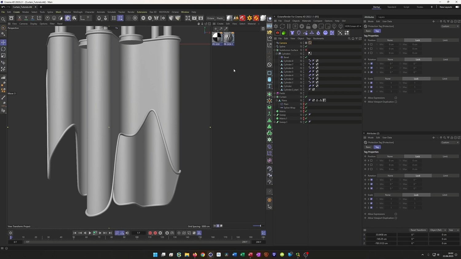 In this tutorial, we will explore how to create a detailed 3D simulation of a hanging mesh cloth draped over cylindrical dowels. The workflow moves away from complex matrix methods and focuses on using efficient deformers and simulation tags. You will learn how to shape the fabric using fields, create a perfectly tightened path using rope physics, and animate the entire structure so the cloth flows naturally while the cylinders rotate in synchronization. Finally, we touch upon texturing techniques to achieve a semi-transparent, realistic fabric look.