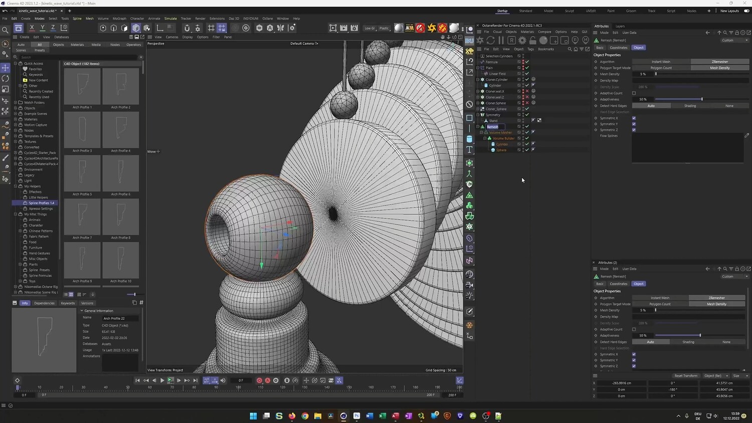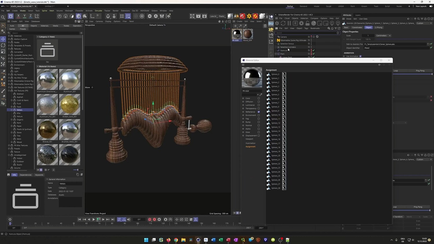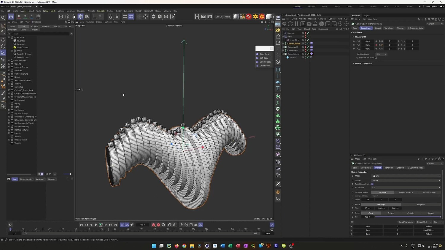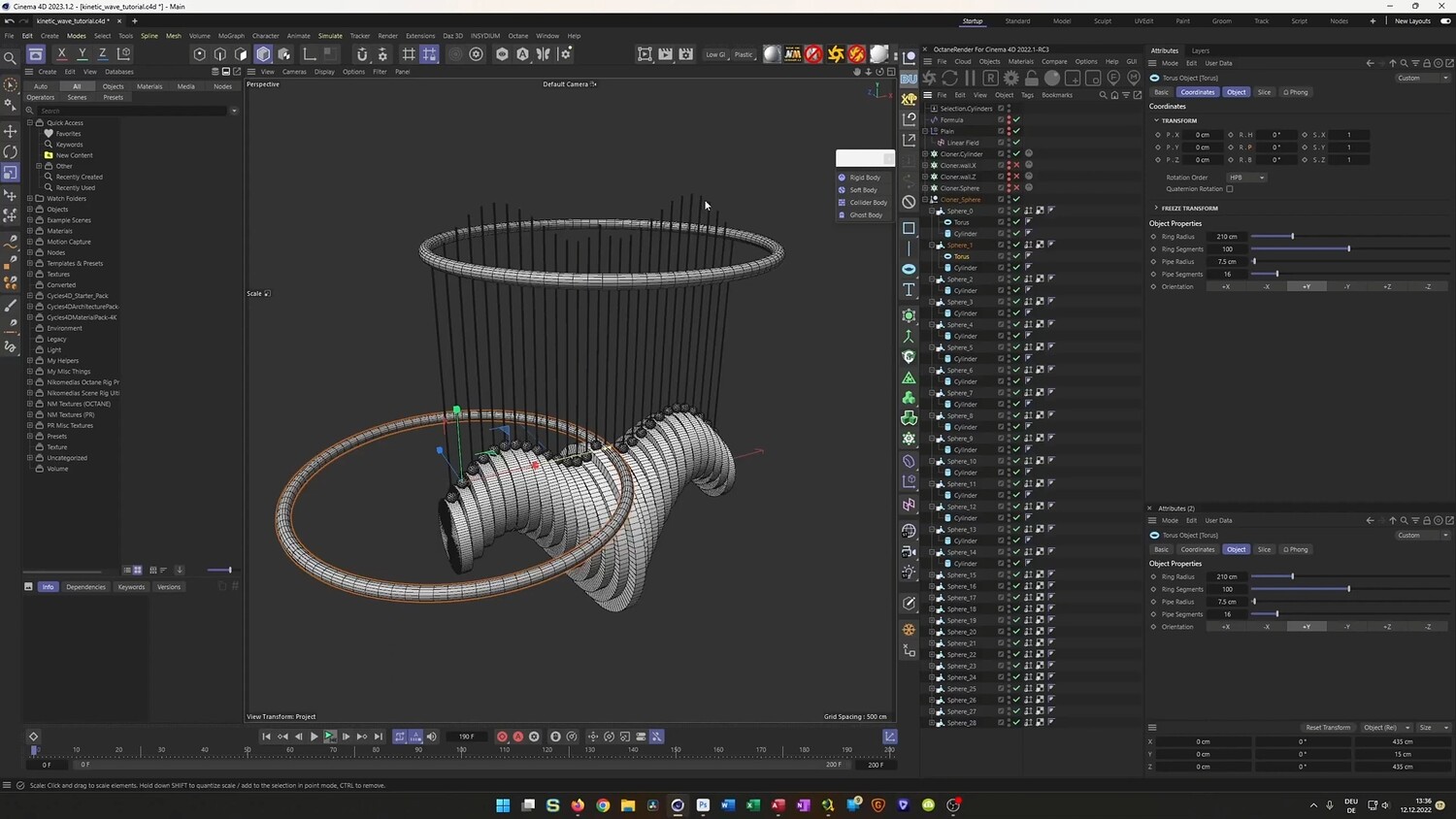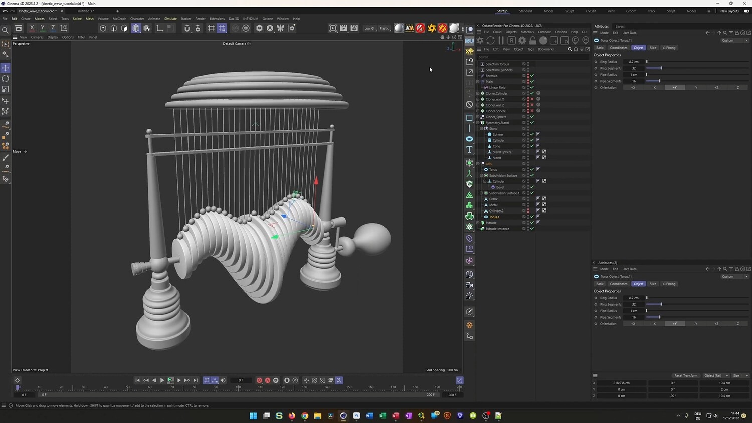 What you will learn: - How to use Cloners and the Formula Effector to create perfectly looping wave animations. - Setting up Rigid Body Dynamics to balance spheres on rotating cylinders. - Using invisible collider walls to constrain dynamic objects and prevent them from falling. - Baking dynamic simulations to Alembic files for optimized performance and stability. - utilizing XPresso to automatically position and scale connecting rods between moving parts. - Modeling organic shapes for the base using Splines, Lathe objects, and Volume Builders. - Techniques for UV mapping and applying realistic wood and metal textures.