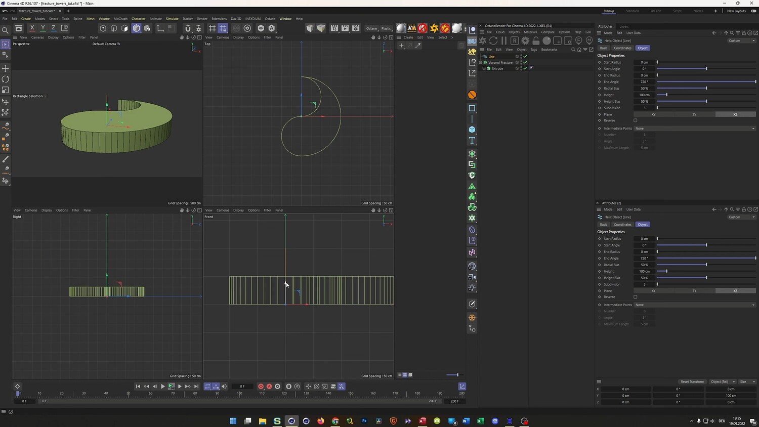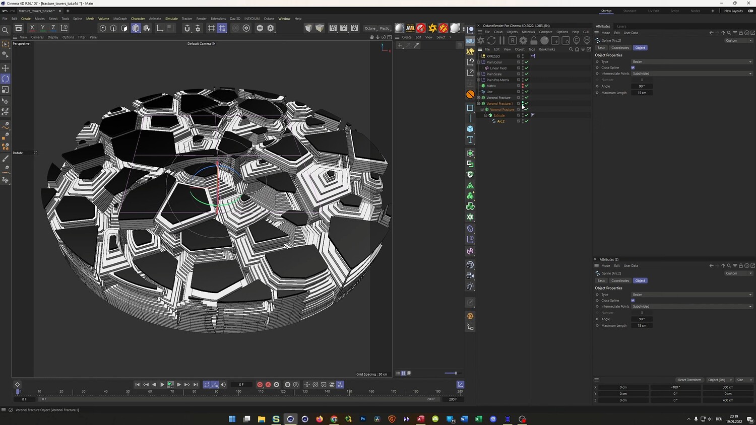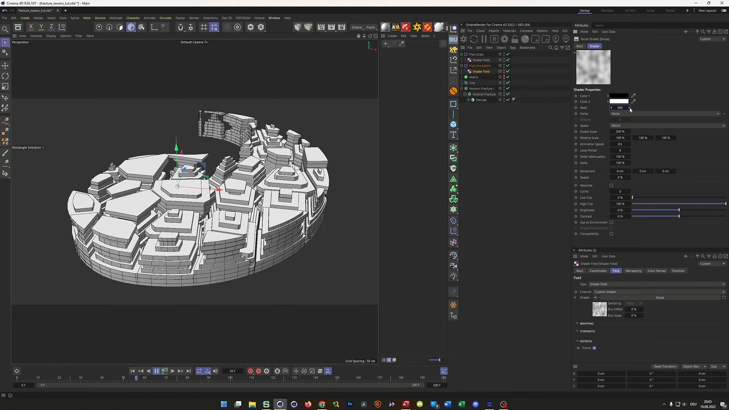 In this tutorial, we recreate a client project featuring abstract, hexagonal towers arranged in a Yin Yang formation. The lesson focuses on advanced Mograph techniques, utilizing Voronoi Fracture and Matrix objects to create stepped, geometric landscapes. You will learn how to set up a unique glitch-style animation where the structure changes randomly at specific frame intervals using Xpresso and a simple Python script. Finally, the video covers the texturing process in Octane Render, demonstrating how to create complex composite materials that differentiate between the metallic sides and rough tops of the geometry.