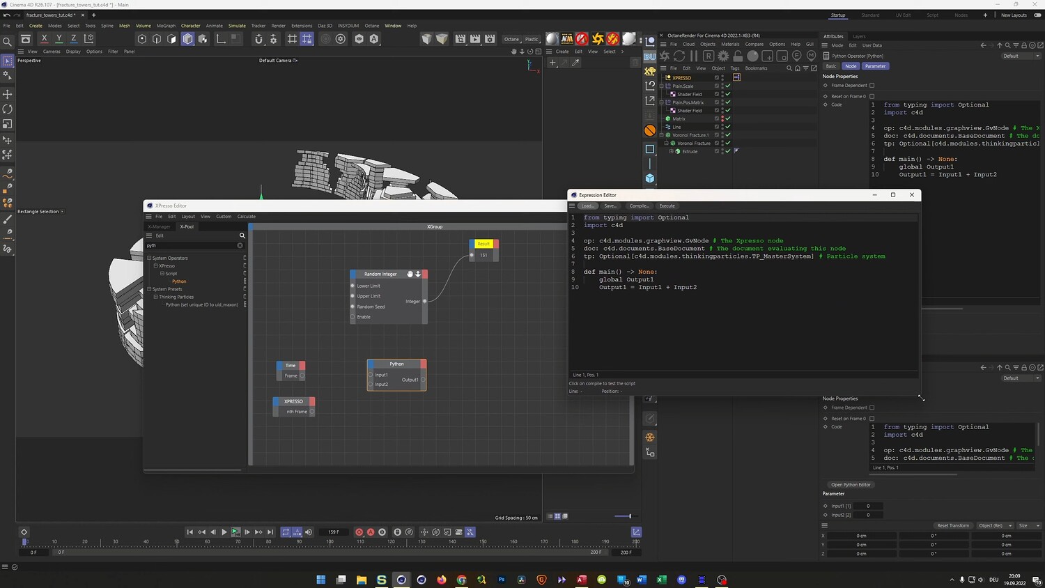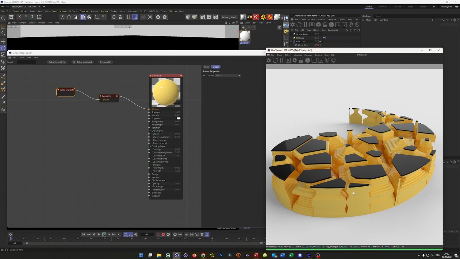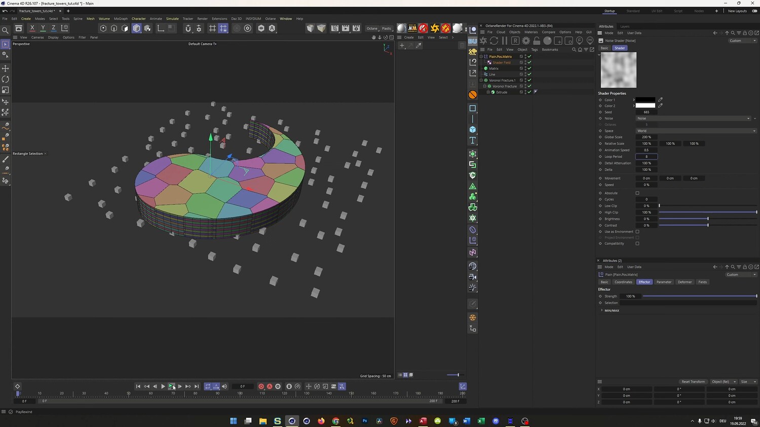 In this tutorial, we recreate a client project featuring abstract, hexagonal towers arranged in a Yin Yang formation. The lesson focuses on advanced Mograph techniques, utilizing Voronoi Fracture and Matrix objects to create stepped, geometric landscapes. You will learn how to set up a unique glitch-style animation where the structure changes randomly at specific frame intervals using Xpresso and a simple Python script. Finally, the video covers the texturing process in Octane Render, demonstrating how to create complex composite materials that differentiate between the metallic sides and rough tops of the geometry.