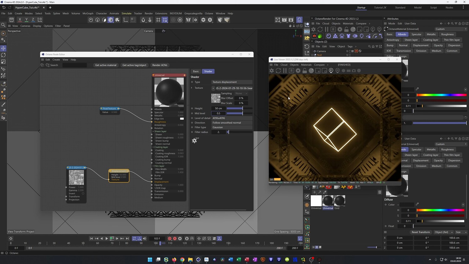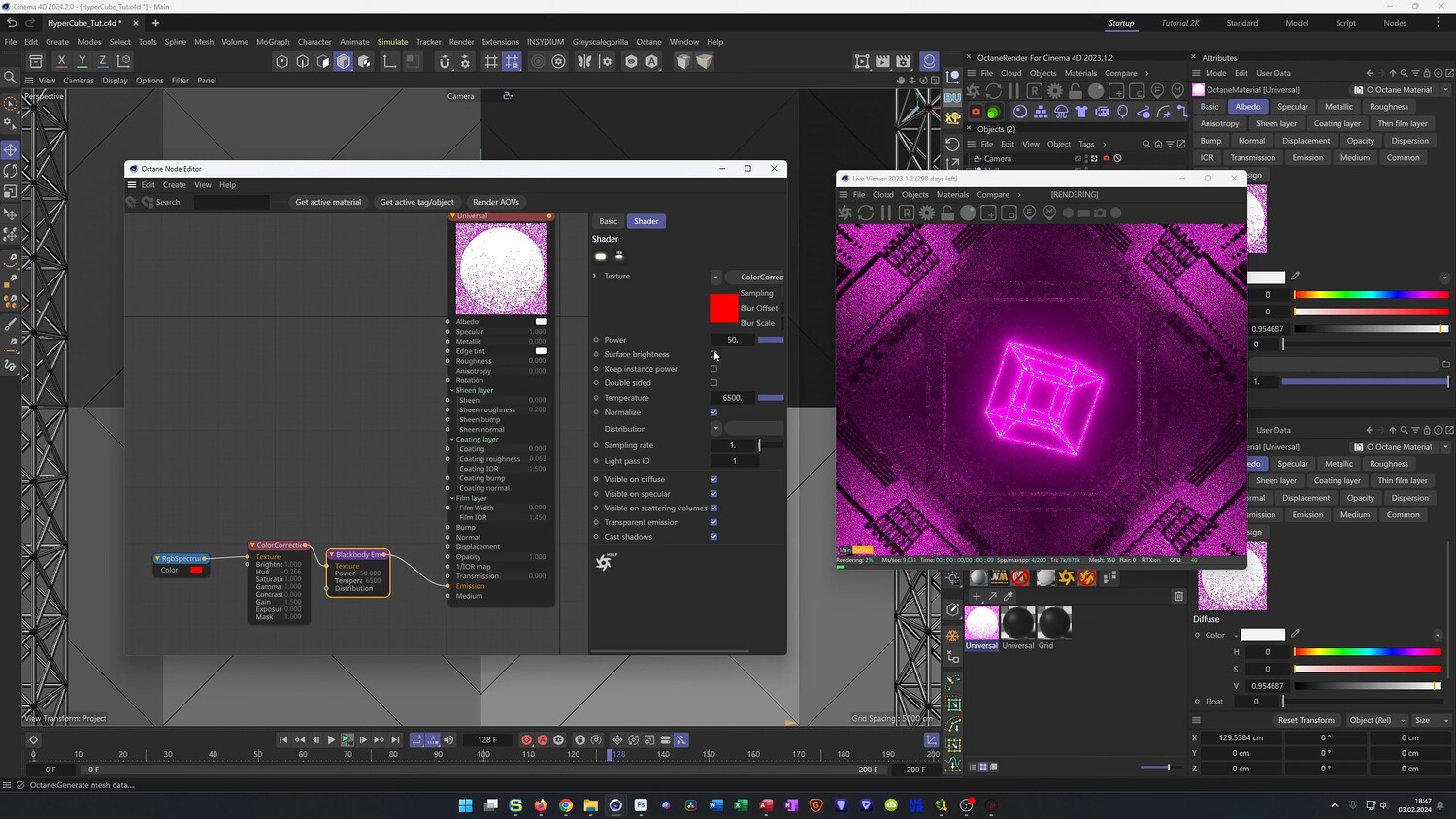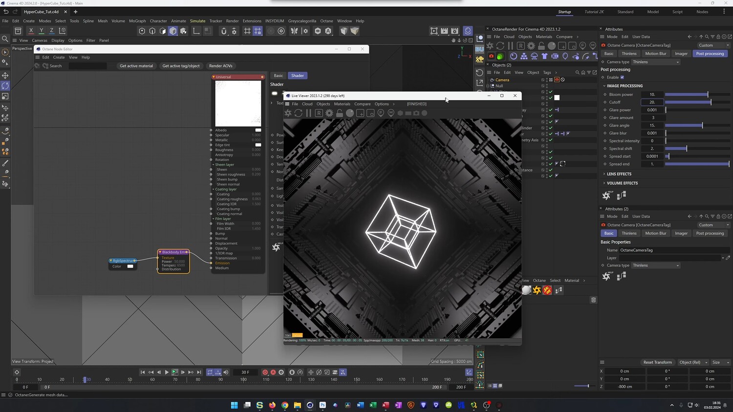 In this tutorial, we dive into Cinema 4D to create a mesmerizing sci-fi animation featuring a glowing Hypercube (tesseract). You will walk through the process of building the complex wireframe geometry using the Thicken generator and Atom Arrays. We will specifically focus on using simple Xpresso setups to automate the connections between the inner and outer cubes, ensuring the geometry stays intact during animation. Finally, we will build a seamless looping tunnel environment using displacement maps and render the scene using OctaneRender for that neon sci-fi look.