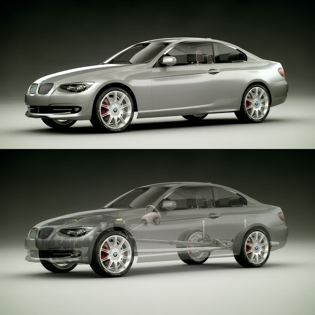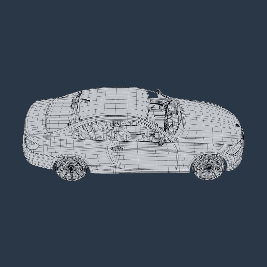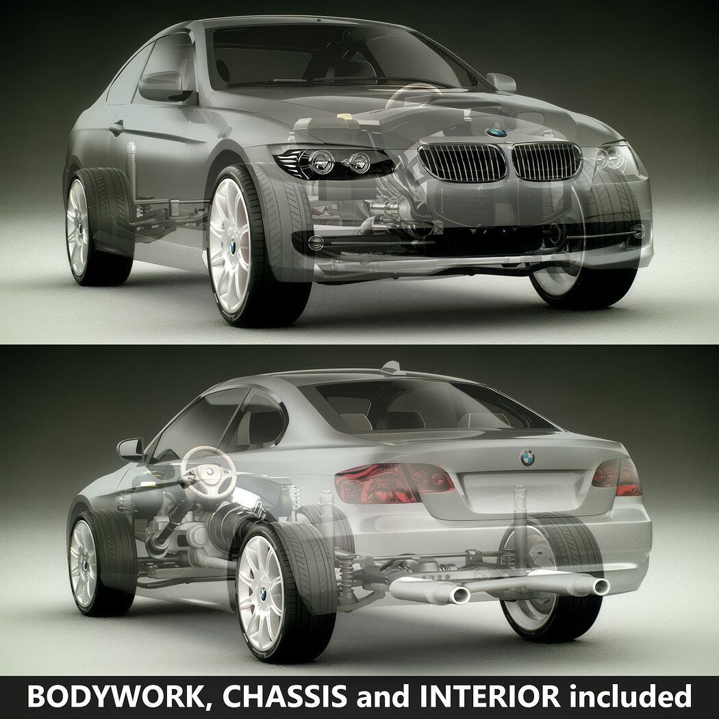 Realistic, detailed and accurate BMW 3 Series Coupe including interior, chassis, engine, wheels, rims and brakes, gearbox, exhaust system, front and rear suspension, steering wheel and transmission.