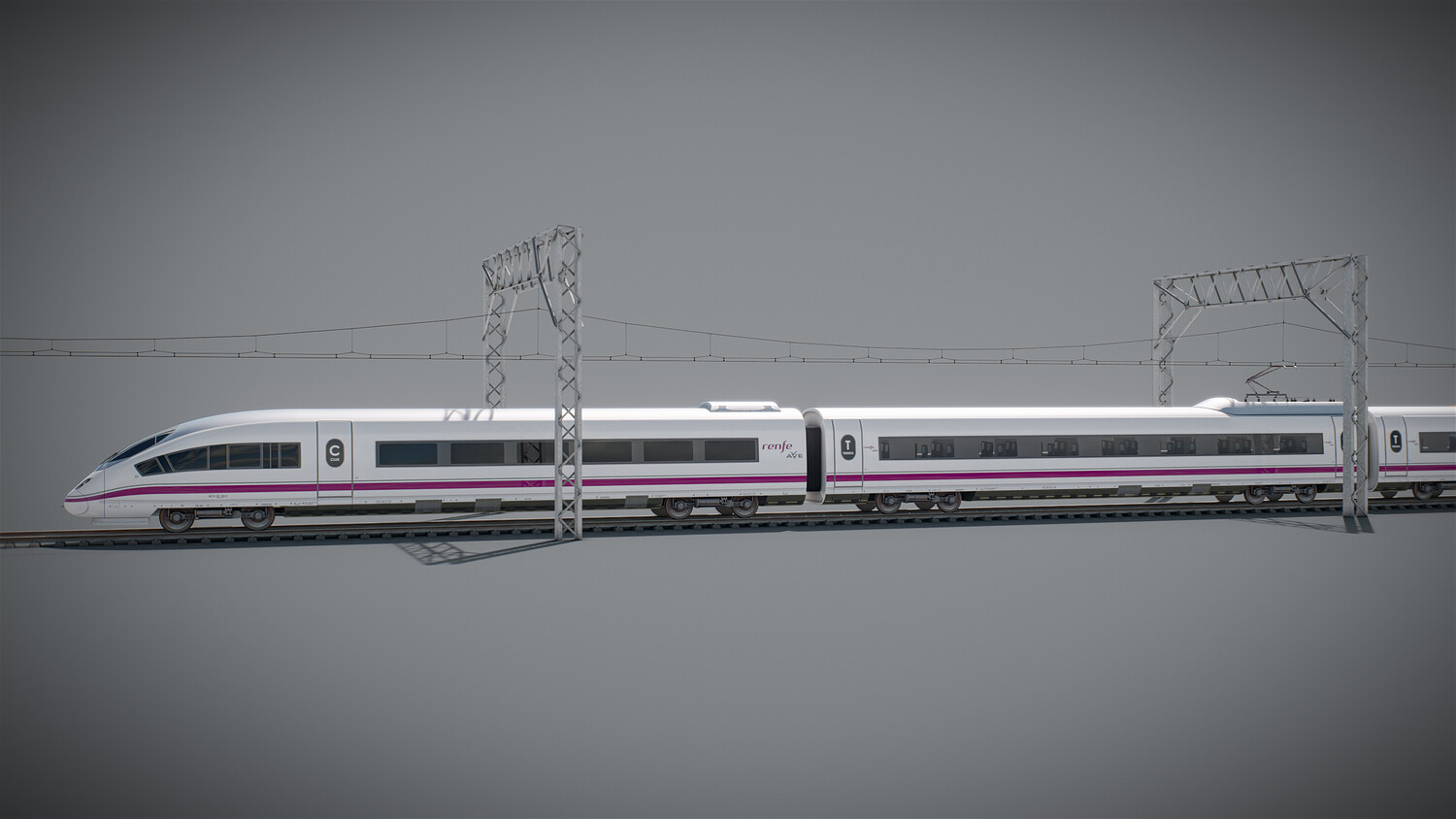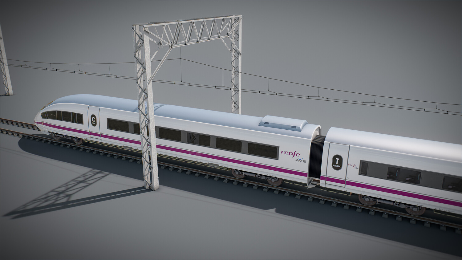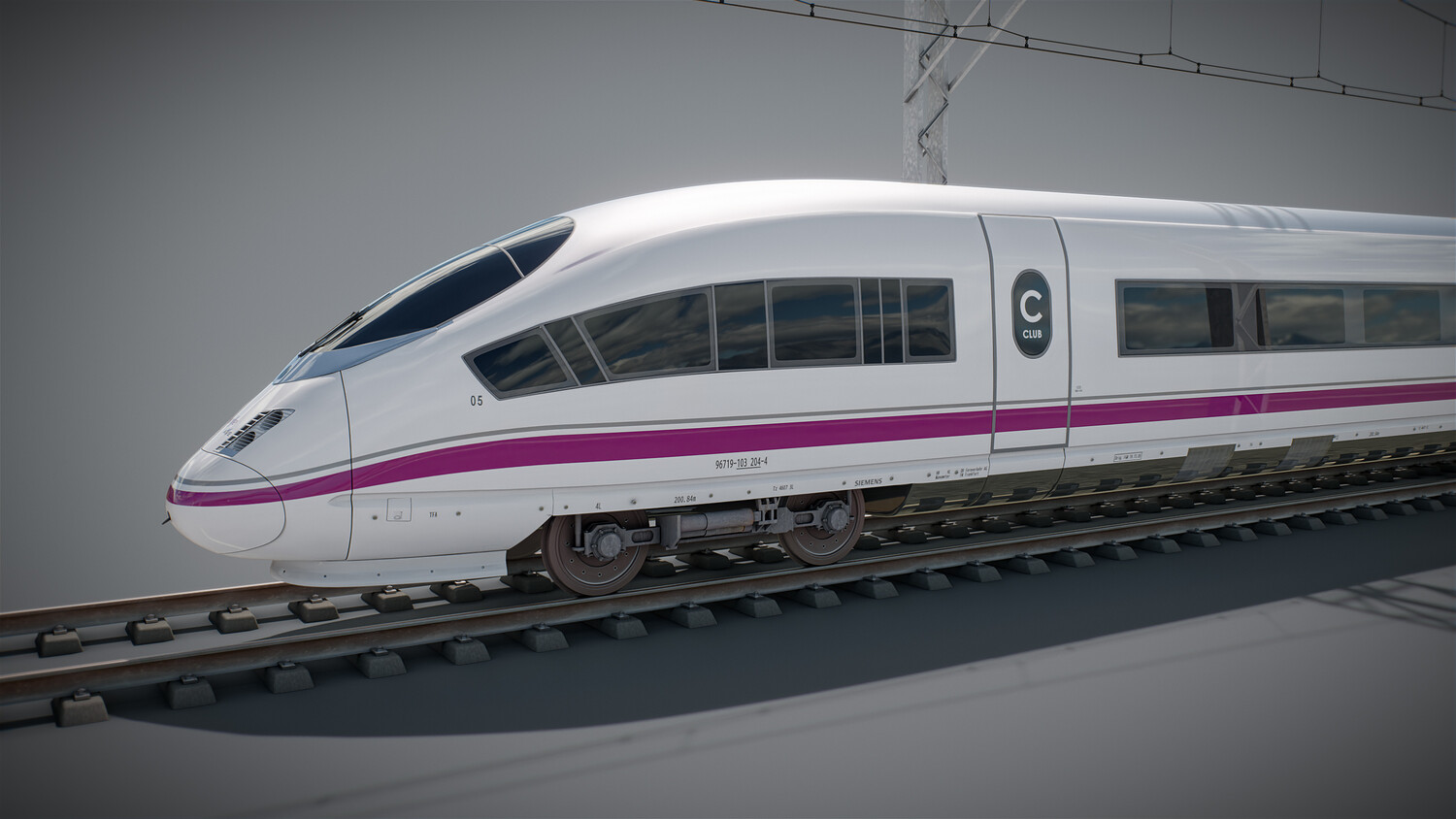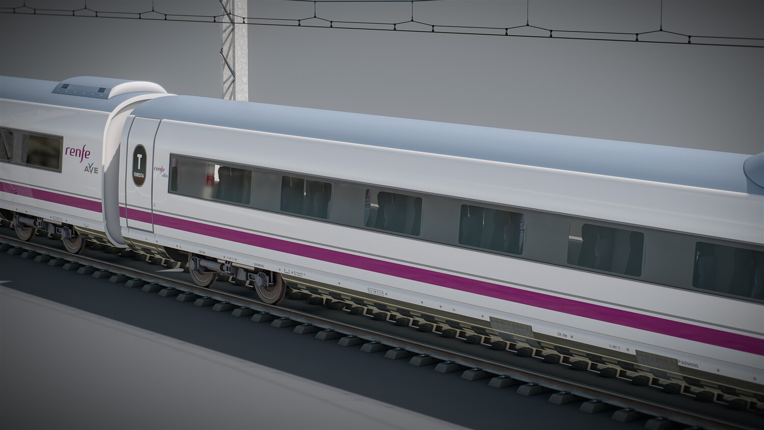 Realistic, detailed and textured Spanish AVE Siemens Velaro high speed trains with Interior, Railway Track and Catenary included in multiple 3D formats.