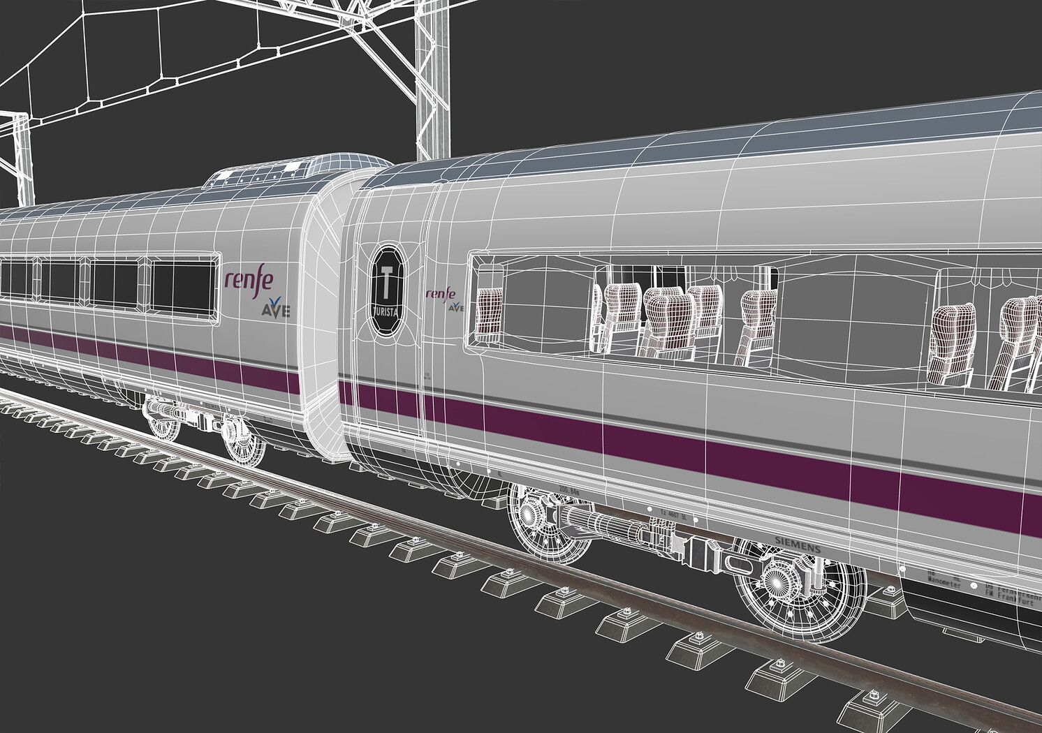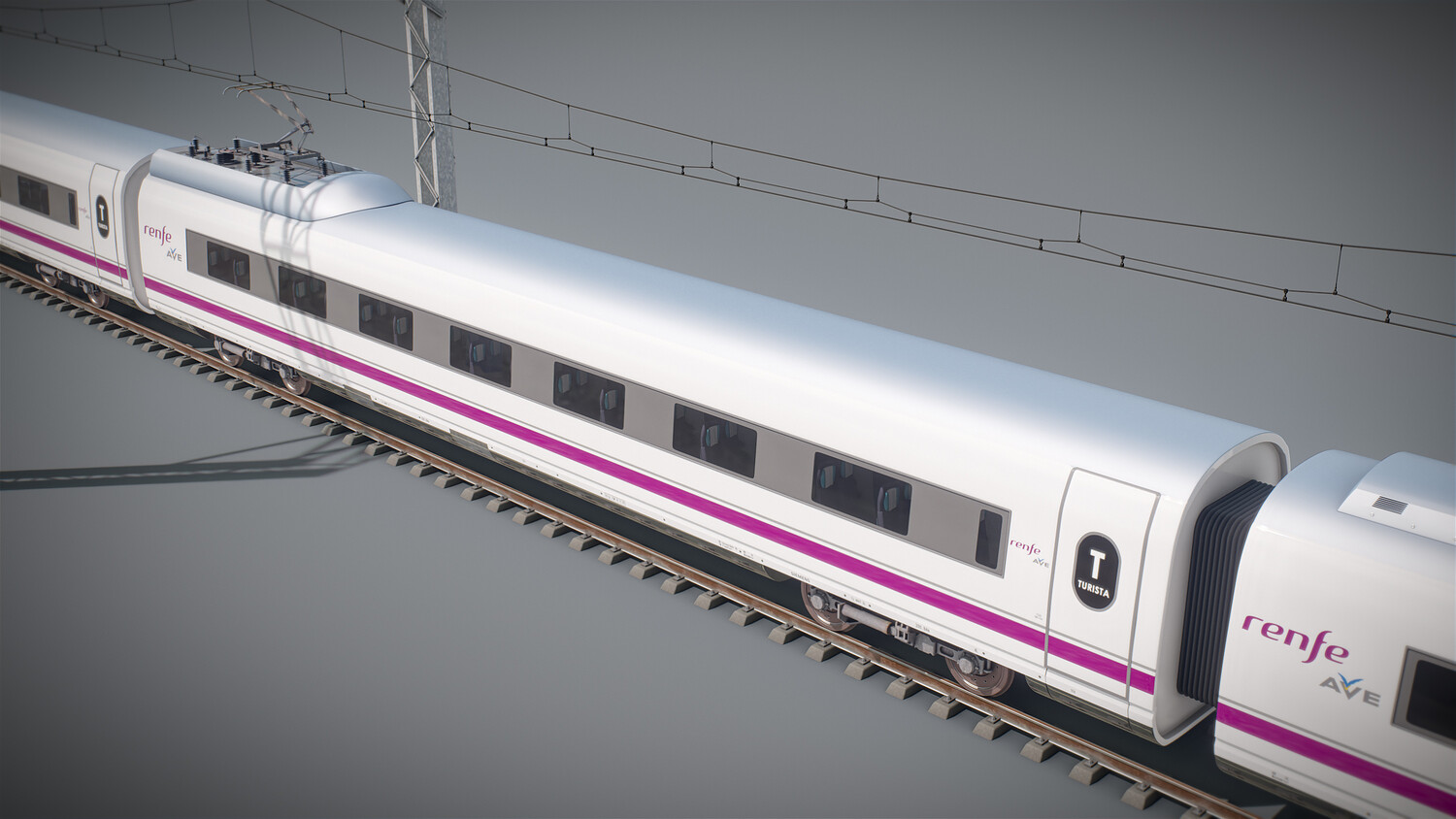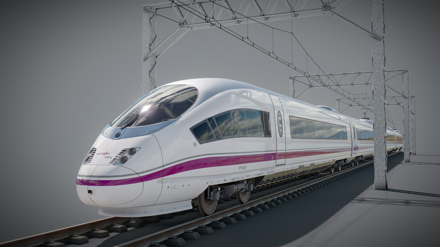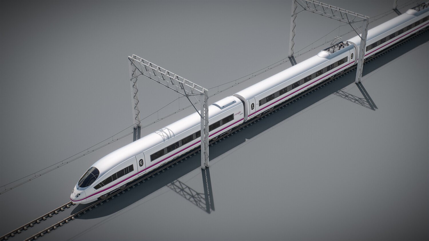 Realistic, detailed and textured Spanish AVE Siemens Velaro high speed trains with Interior, Railway Track and Catenary included in multiple 3D formats.