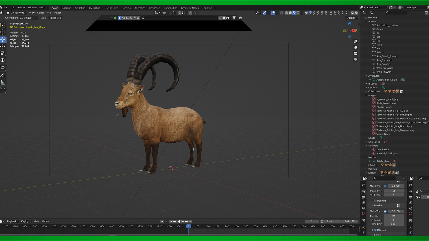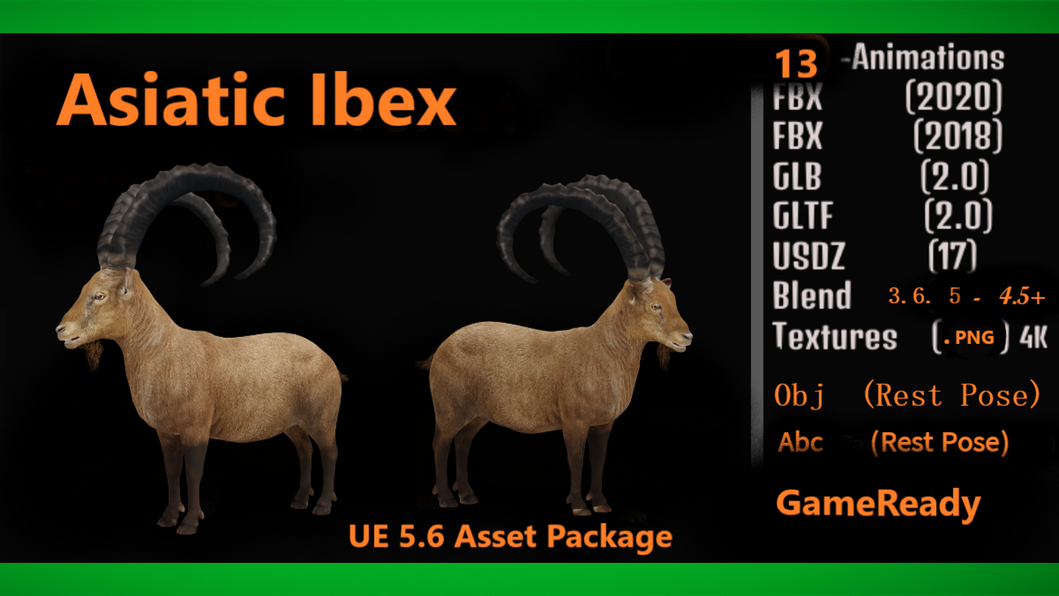 Vertices-19162 Faces-14941 Edges-33361 Triangles-28267 The Siberian ibex, also known using regionalized names including Altai ibex, Asian ibex, Central Asian ibex, Gobi ibex, Himalayan ibex, Mongolian ibex, Tian Shan ibex, is a polytypic species of ibex, a wild relative of goats and sheep. .3D Asiatic Ibex Realistic Animal Model By Nyilonelycompany (nyc).Thank you.