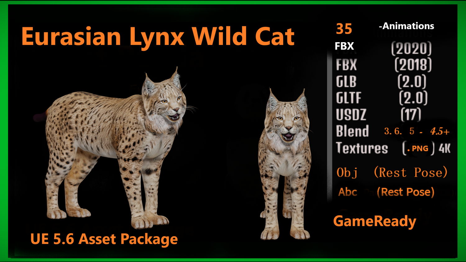 Number of Unique Meshes1 Vertex Count: 33251 Collision: No LODs: (No) Number of LODs: (No) Rigged: (Yes) Rigged to Epic or MetaHumans Skeleton: (No) If rigged to the Epic or MetaHumans skeleton, IK bones are included: (No) Number of Characters: 1 Vertex Counts of Characters: 33251 Animated: (Yes) Number of Animations:35 Animation Types : (In-place)/Root Number of Materials: 1 Number of Material Instances: 0 Number of Textures: 5 Texture Resolutions: (4096) Supported Development Platforms: Windows: (Yes) Mac: (Yes) Documentation Link: Important/Additional Notes: You May Download the 3D Asset Model Via Fab Plugin For Any Unreal Engine Version. For Stable ,Review Pass Version -Verified Unreal Engine 5.6. Assets Package Vertices-33251 Faces-31457 Edges-64037 Triangles-55250 The Eurasian lynx is one of the four extant species within the medium-sized wild cat genus Lynx. It is widely distributed from Northern, Central and Eastern Europe to Central Asia and Siberia, the Tibetan Plateau and the Himalayas. It inhabits temperate and boreal forests up to an elevation of 5,500 m. .3D Eurasian Lynx wild Cat Realistic Animal Model By Nyilonelycompany (nyc).Thank you.