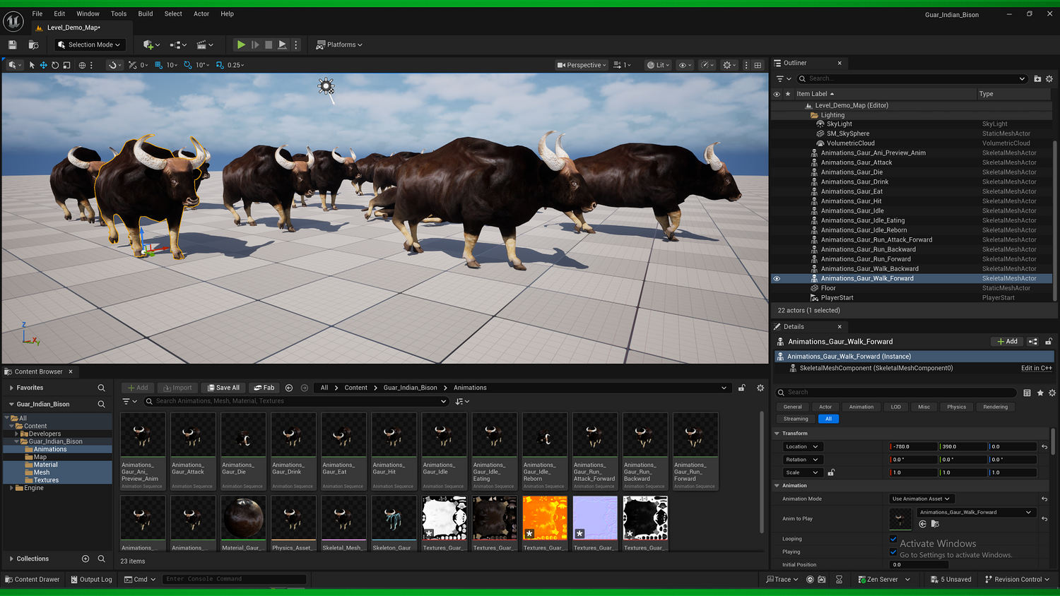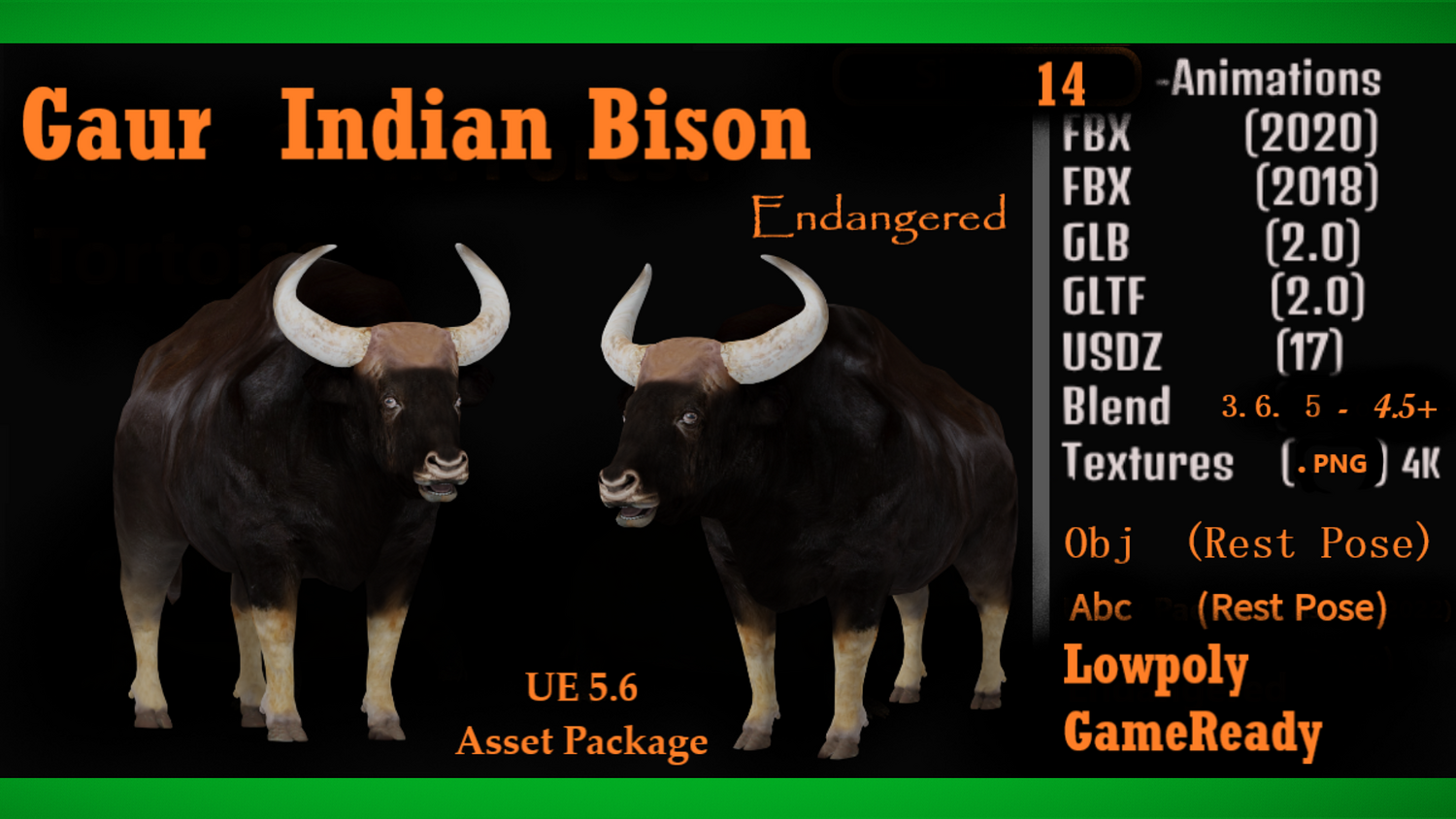 Number of Unique Meshes:1 Vertex Count: 5559 Collision: No LODs: (No) Number of LODs: (No) Rigged: (Yes) Rigged to Epic or MetaHumans Skeleton: (No) If rigged to the Epic or MetaHumans skeleton, IK bones are included: (No) Number of Characters:1 Vertex Counts of Characters: 5559 Animated: (Yes) Number of Animations: 14 Animation Types : (In-place) Number of Materials: 1 Number of Material Instances: 0 Number of Textures: 5 Texture Resolutions: (4096) Supported Development Platforms: Windows: (Yes) Mac: (Yes) Documentation Link: Important/Additional Notes: You May Download the 3D Asset Model Via Fab Plugin For Any Unreal Engine Version. For Stable ,Review Pass Version -Verified Unreal Engine 5.6.1 Assets Package Vertices-5559 Faces-5382 Edges-11234 Triangles-10938 The gaur is a large bovine native to the Indian Subcontinent and Southeast Asia, and has been listed as Vulnerable on the IUCN Red List since 1986. The global population was estimated at a maximum of 21,000 mature individuals in 2016, with the majority of those existing in India. .3D Gaur Indian Bison Realistic Animal Model By Nyilonelycompany (nyc).Thank you.