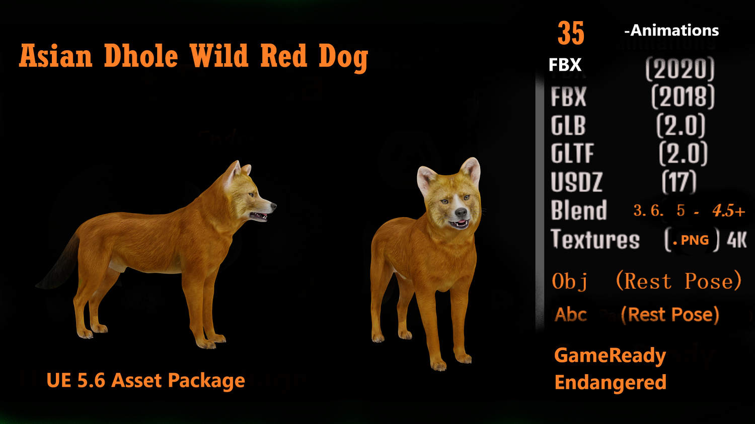 Vertices-27038 Faces-31074 Edges-58067 Triangles-53721 The dhole is a canid native to South, East and Southeast Asia. It is anatomically distinguished from members of the genus Canis in several aspects: its skull is convex rather than concave in profile, it lacks a third lower molar, and the upper molars possess only a single cusp as opposed to between two and four. .3D Dhole Asian Wild Red Dog Realistic Animal Model By Nyilonelycompany (nyc).Thank you.