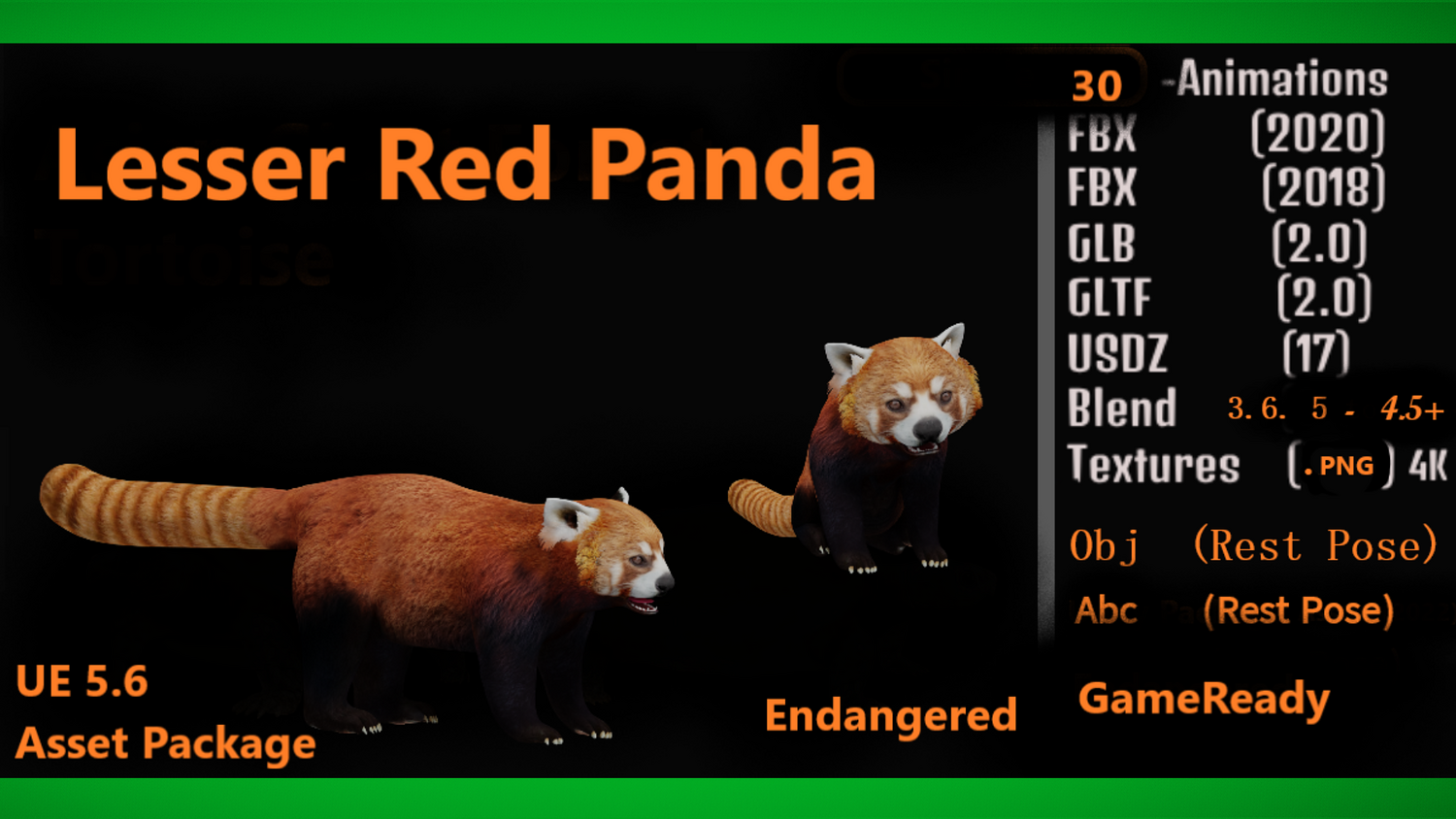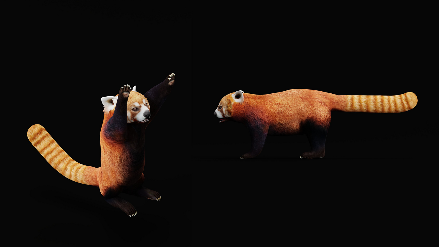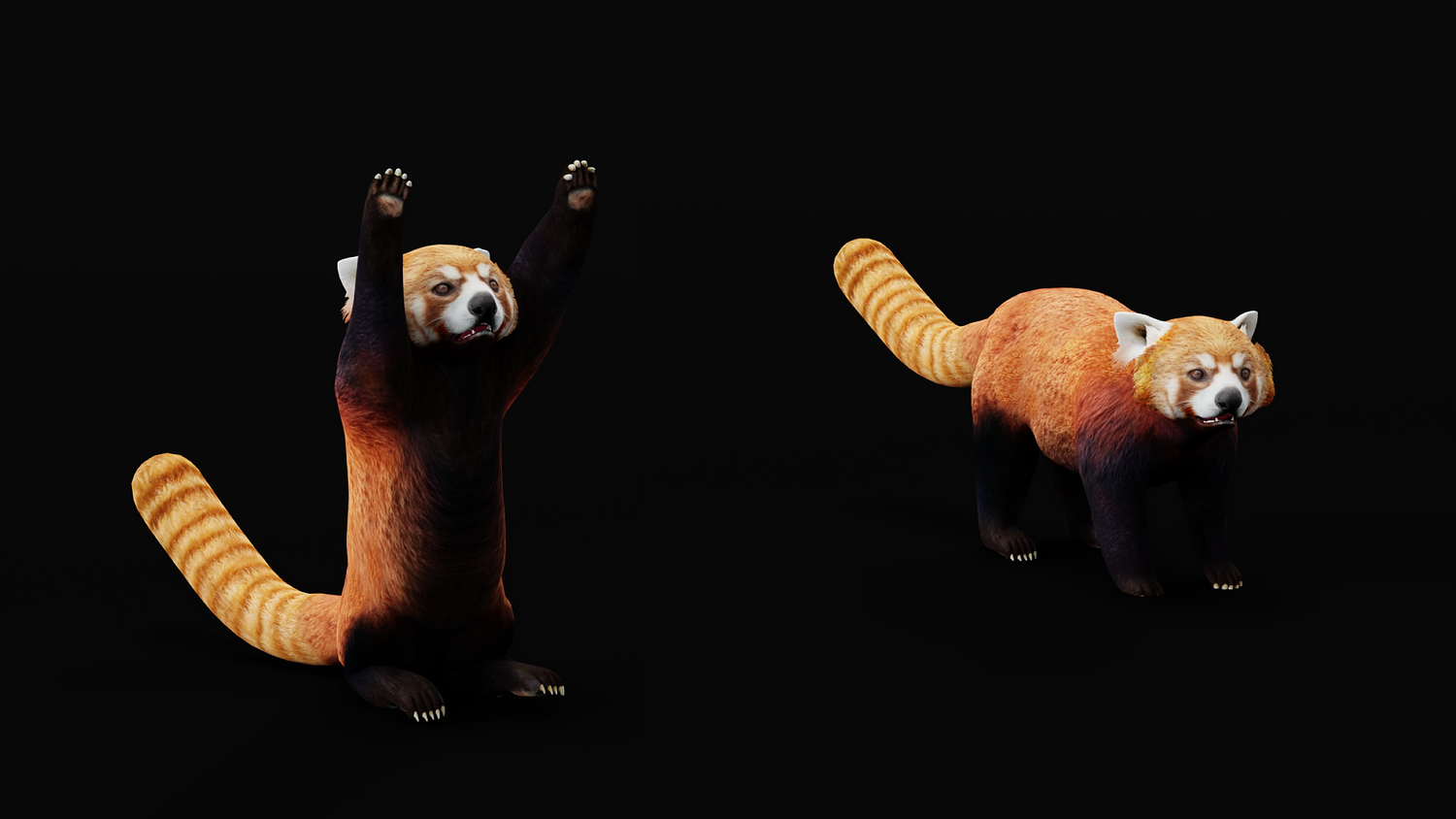 Vertices-18723 Faces-20320 Edges-38975 Triangles-34160 The red panda, also known as the lesser panda, is a small mammal native to the eastern Himalayas and southwestern China. It has dense reddish-brown fur with a black belly and legs, white-lined ears, a mostly white muzzle and a ringed tail. . .3D Red Panda Realistic Animal Model By Nyilonelycompany (nyc).Thank you.