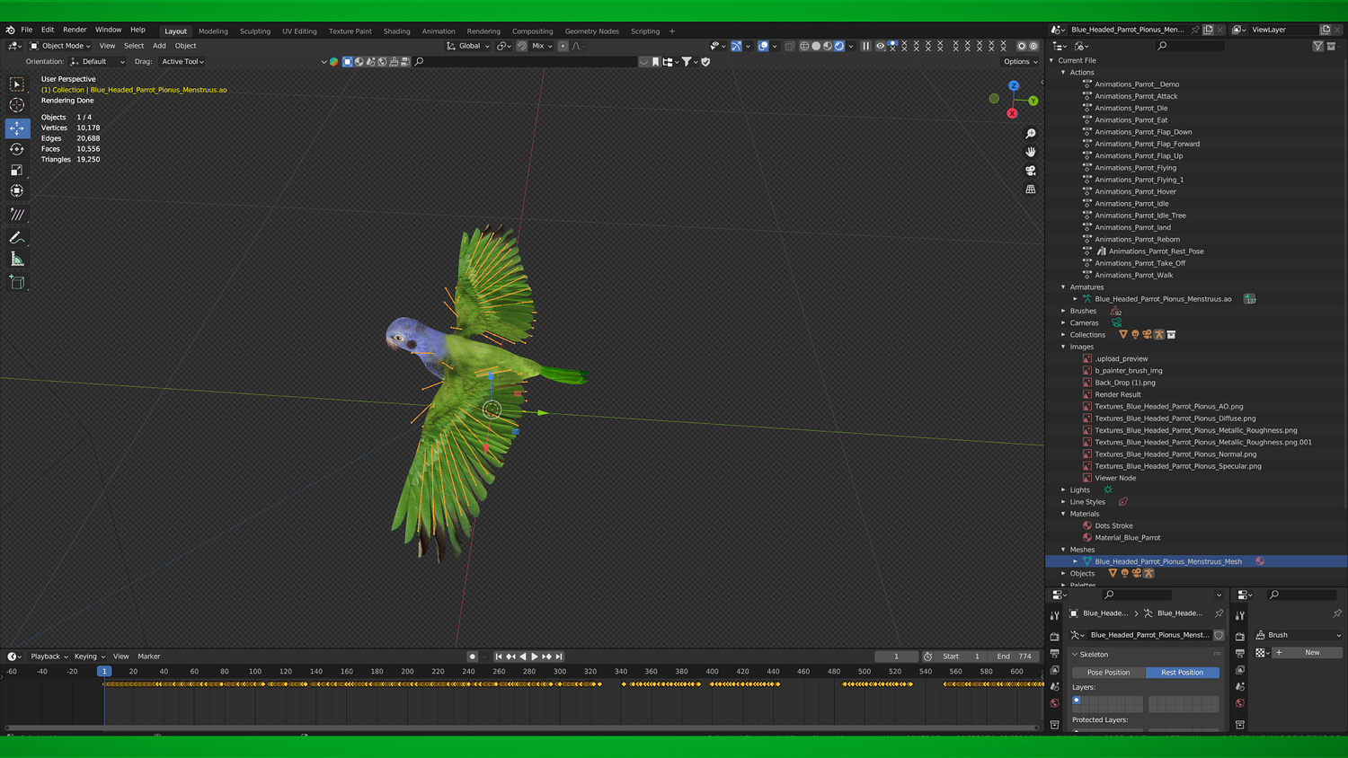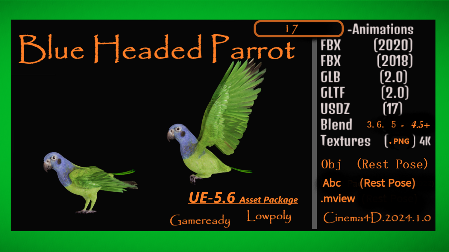 Blue-headed Pionus (Parrot) blue-headed parrot Pionus menstruus Animal Bird(Companion)Wildlife,Zoo,Pet,Cute Low-Poly Game Ready Fab Plugin Compatible (Unreal Engine) Subdivision Surface Ready 17 -Animations (30FPS) 4K PBR Textures Materials Unreal-Unity FBX Obj File (Rest Pose) Blend File(3.6.5 LTS/ 4.5 +) USDZ File(AR Ready).Real Scale Dimension (Xcode,Reality Composer,Keynote Ready) Alembic .abc (Rest Pose) Marmoset .mview Textures Files (.PNG) GLB/GLTF,Any importer .