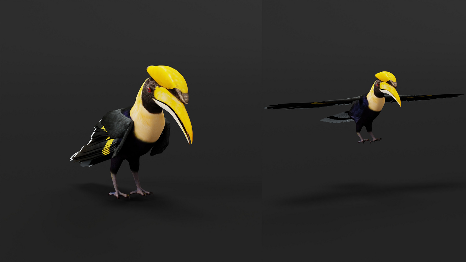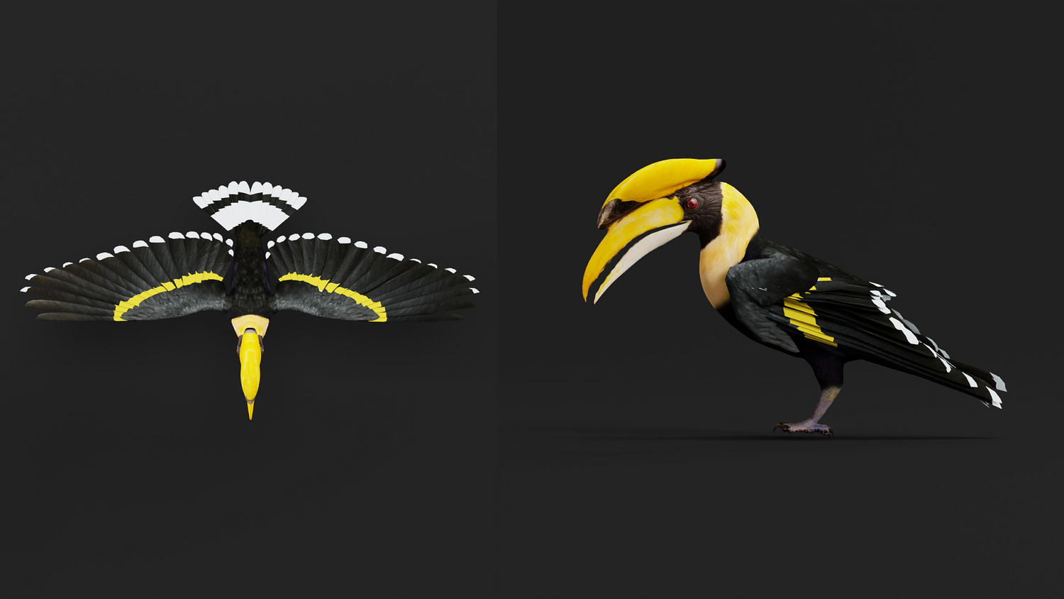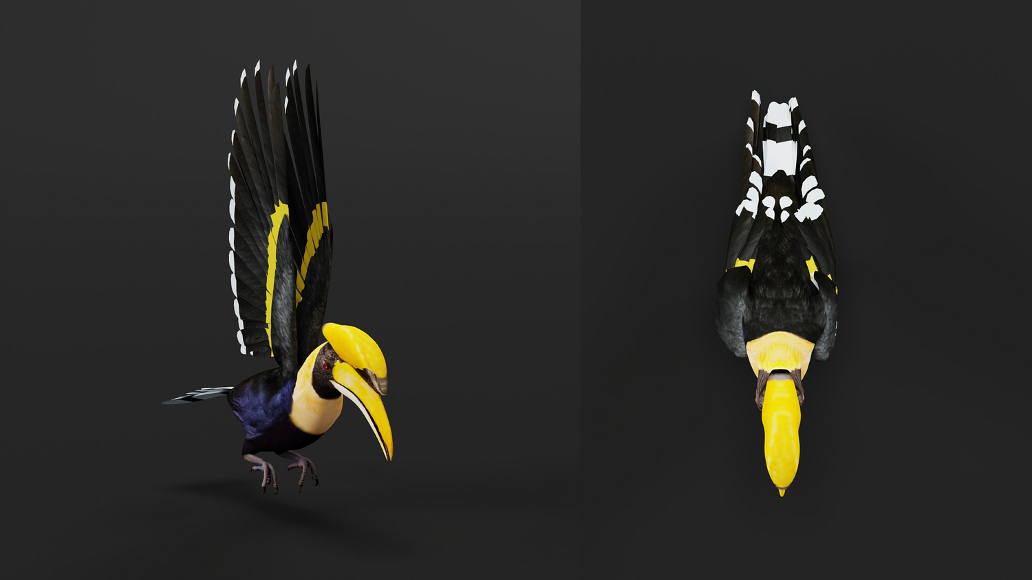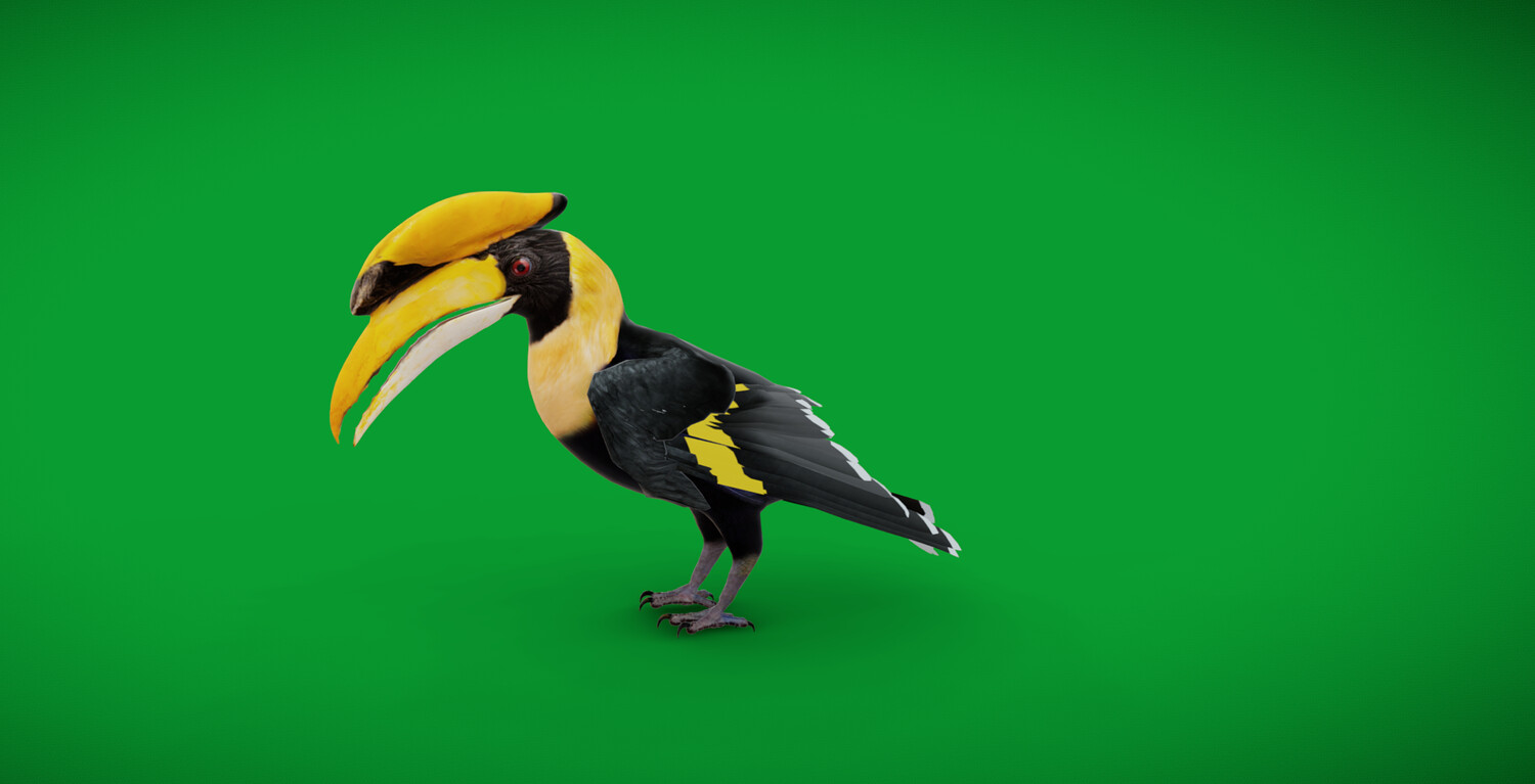 Vertices-13701 Faces-14859 Edges-28512 Triangles-26194 The great hornbill, also known as the concave-casqued hornbill, great Indian hornbill or great pied hornbill, is one of the larger members of the hornbill family. It occurs in the Indian subcontinent and Southeast Asia. It is predominantly frugivorous, but also preys on small mammals, reptiles, and birds... 3D Great Hornbill Bird Animal Model By Nyilonelycompany (nyc).Thank you.