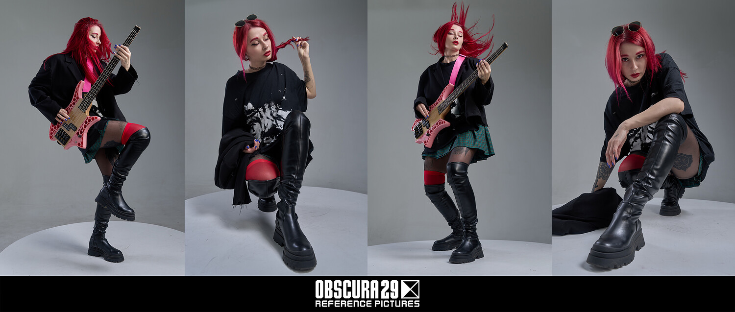 This reference pack features over 1200 high-quality photos of a modern young woman captured in a studio setting. The collection explores a wide range of urban-inspired looks — from casual streetwear and oversized jackets to edgy outfits with bold accessories, heels, guitars, and props like a bat or phone.