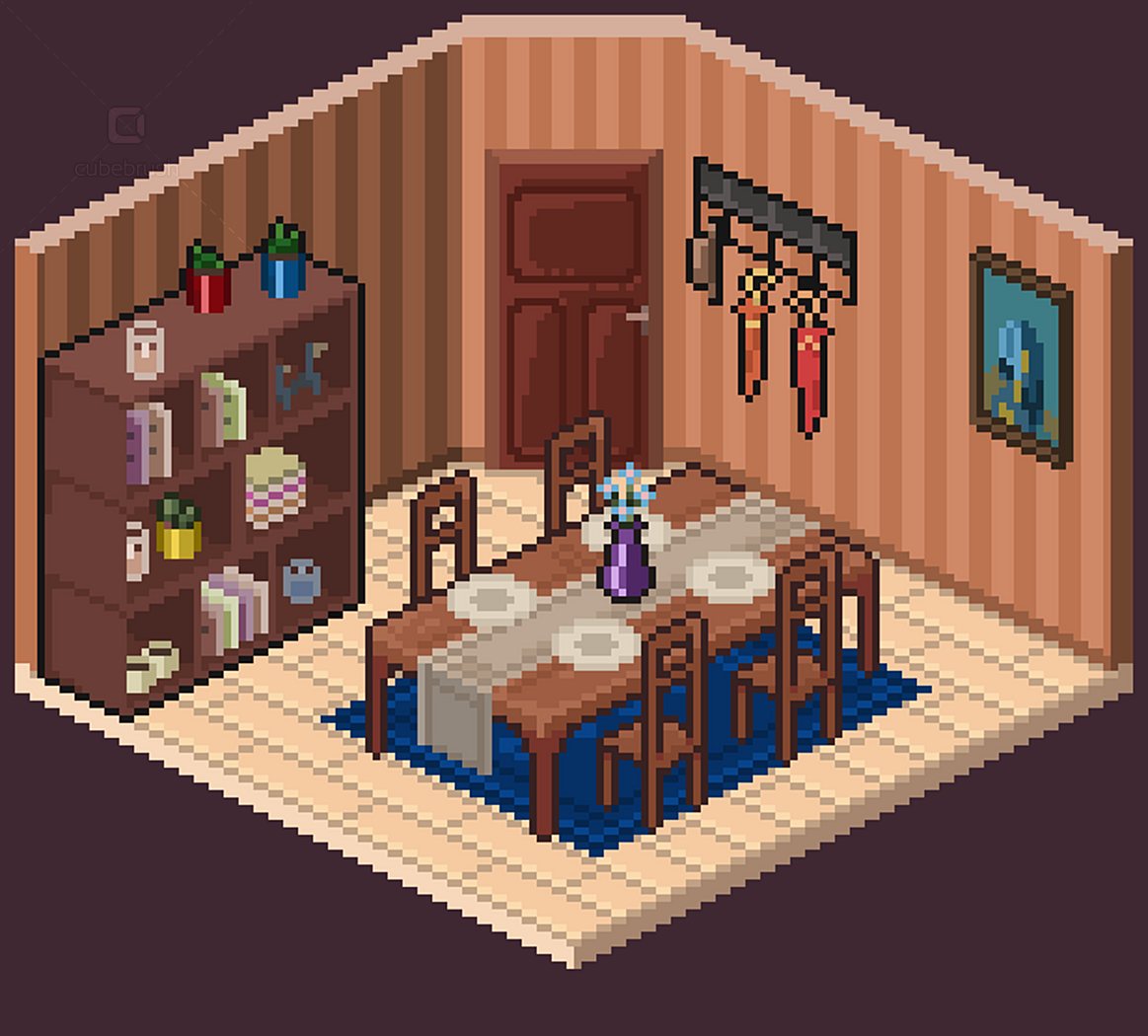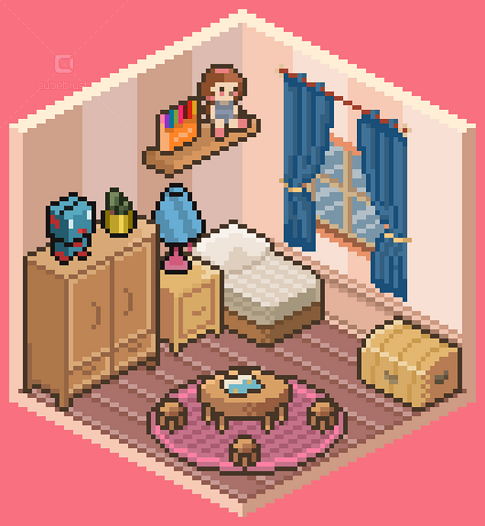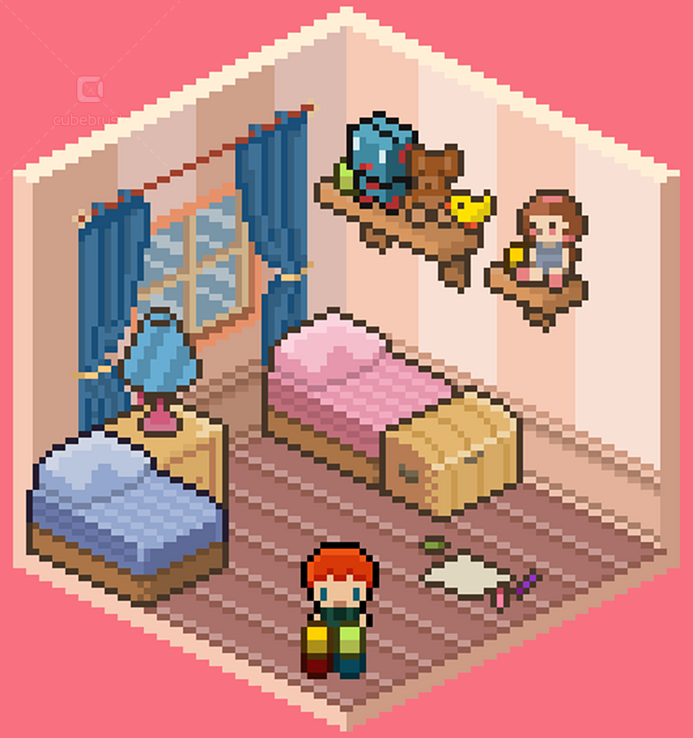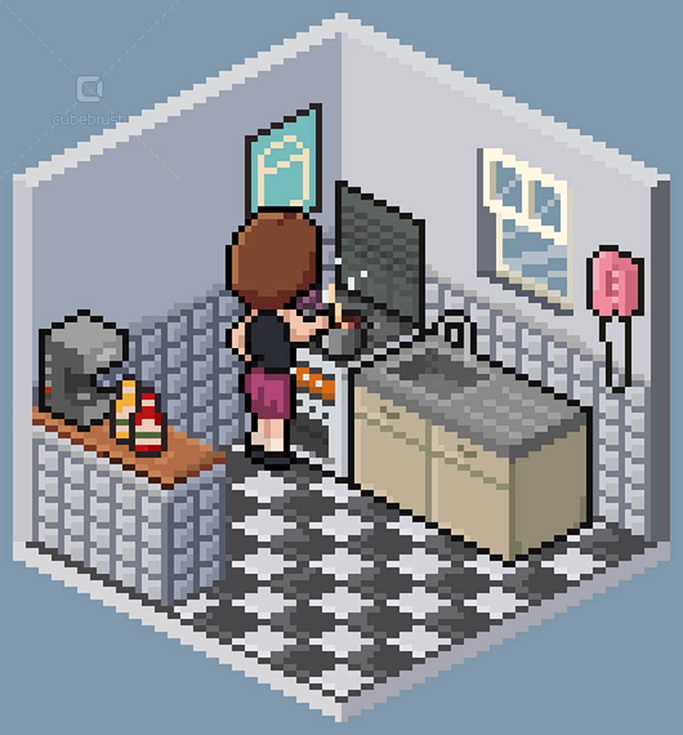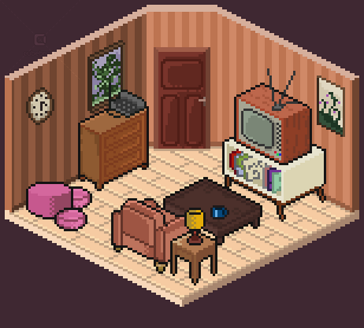 • Wall, floors, doors, windows modules; • Individually exported .png objects files; • Animations by theme - e.g. brushing teeth, watching tv, cooking etc (.pngs and aseprite files);