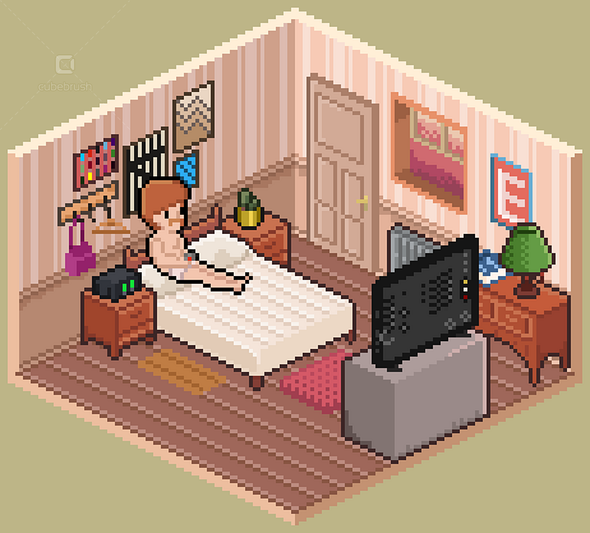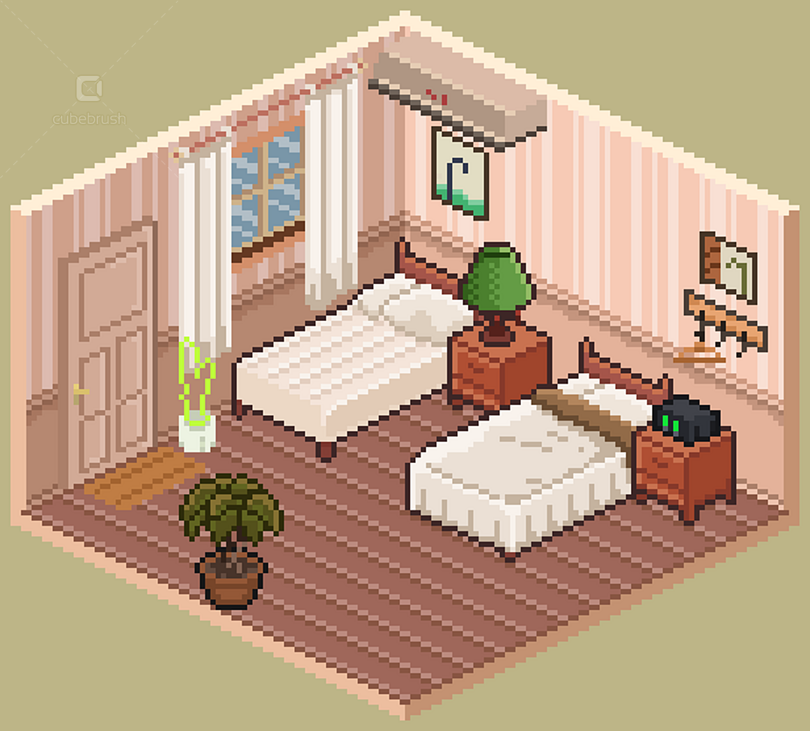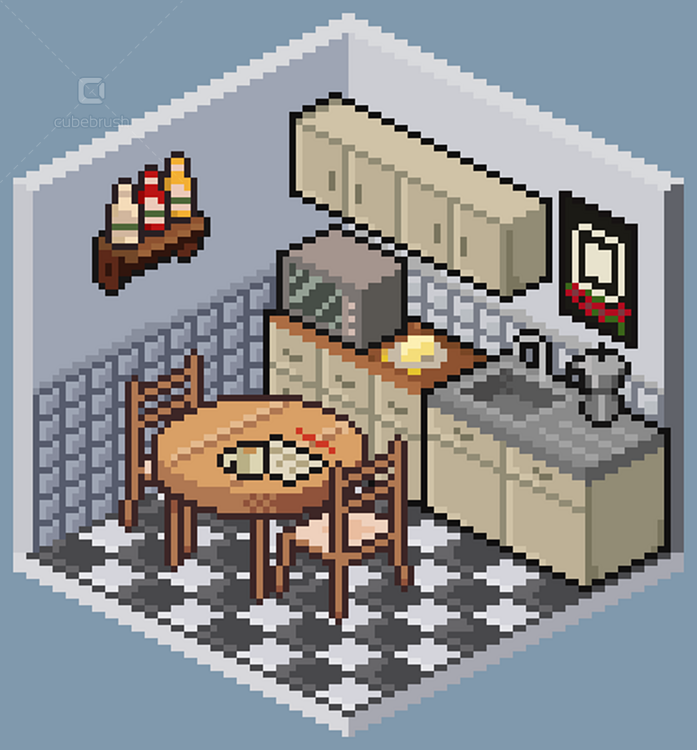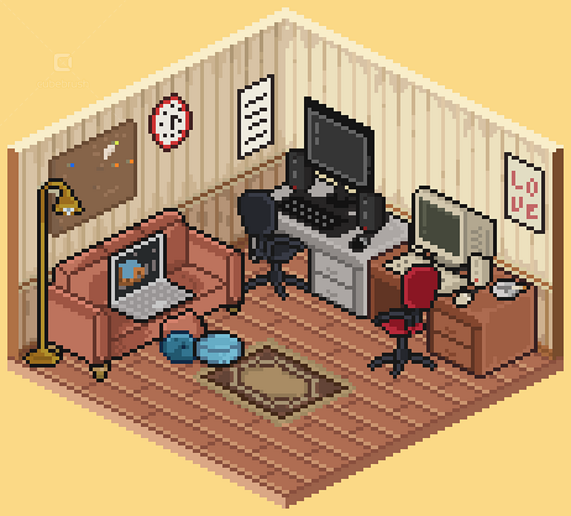 • Wall, floors, doors, windows modules; • Individually exported .png objects files; • Animations by theme - e.g. brushing teeth, watching tv, cooking etc (.pngs and aseprite files);