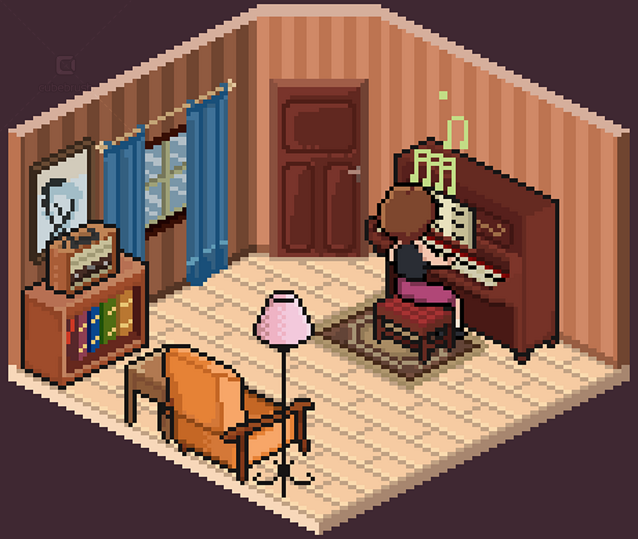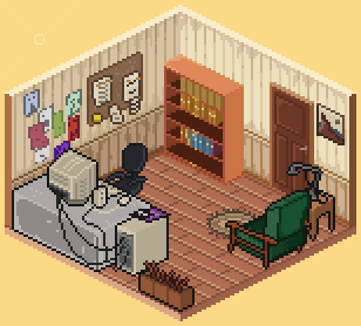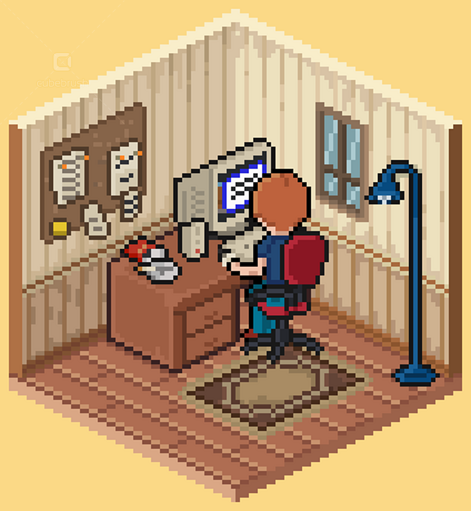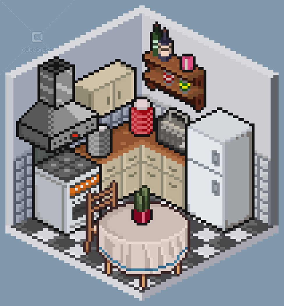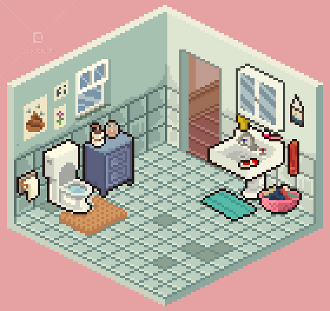 • Wall, floors, doors, windows modules; • Individually exported .png objects files; • Animations by theme - e.g. brushing teeth, watching tv, cooking etc (.pngs and aseprite files);