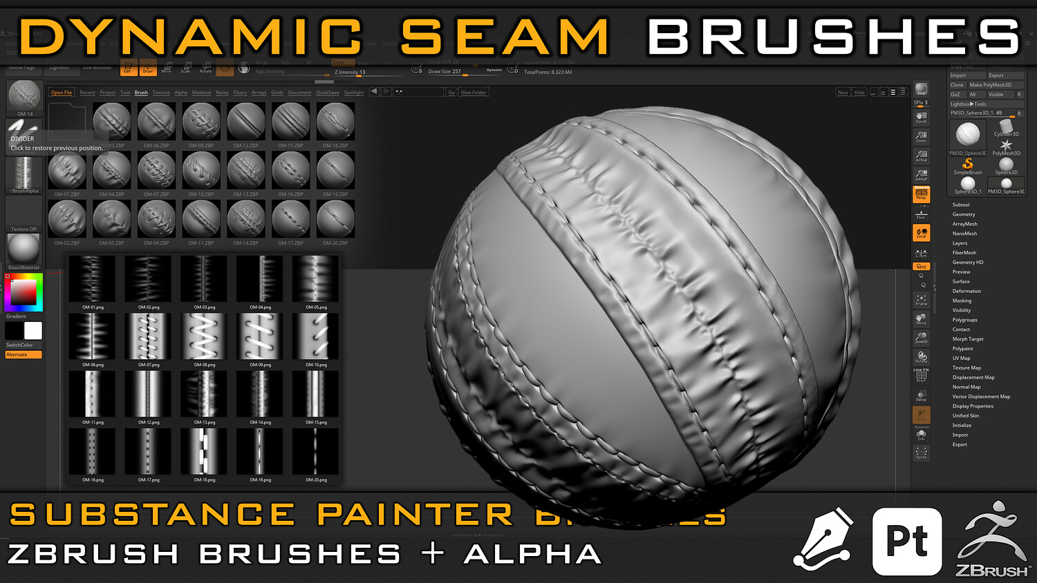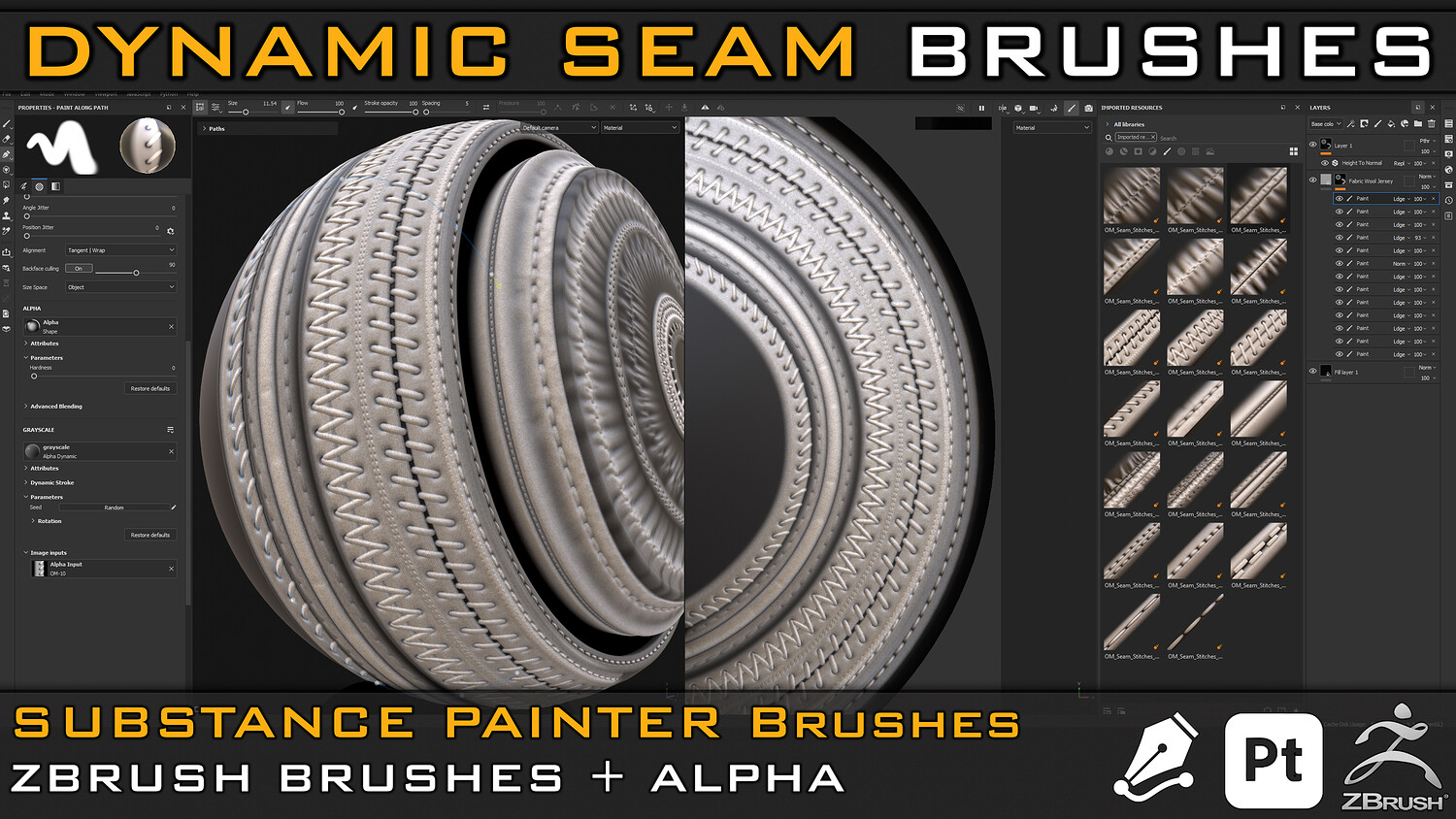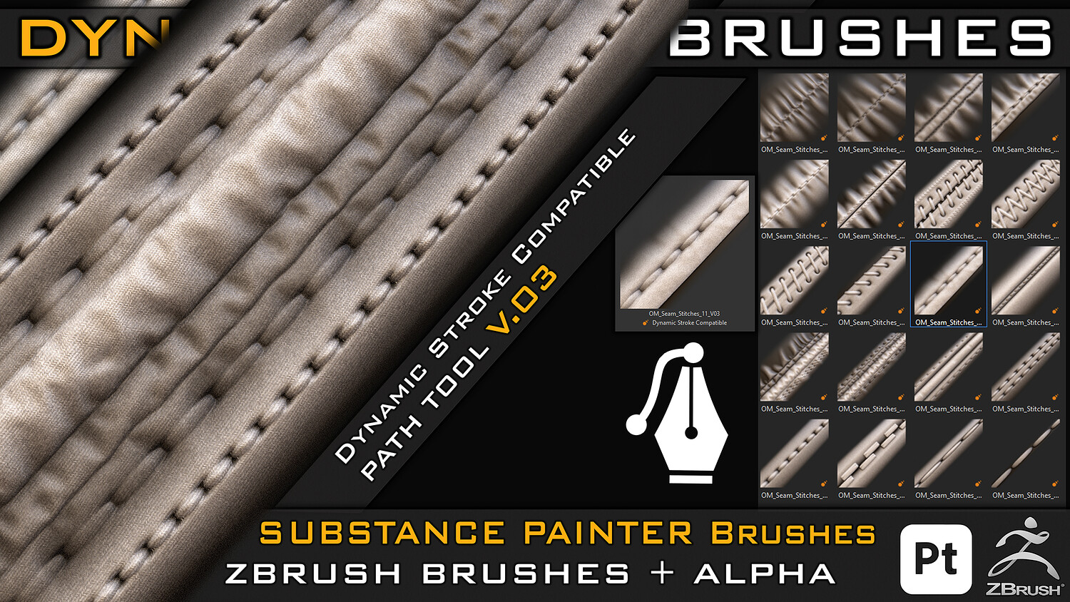 Dynamic Seam and Stitches, Sewing Brushes For Substance Painter (Path Tool )& Zbrush with Alpha + Video Tutorial V-03