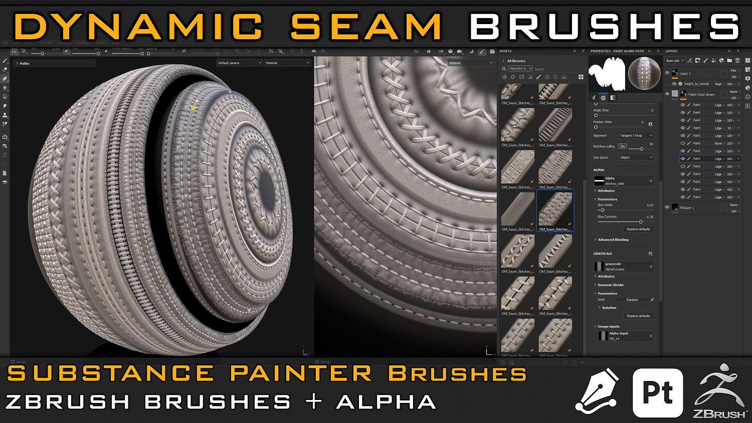 Dynamic Seam and Stitches, Sewing Brushes For Substance Painter (Path Tool )& Zbrush with Alpha + Video Tutorial V-02