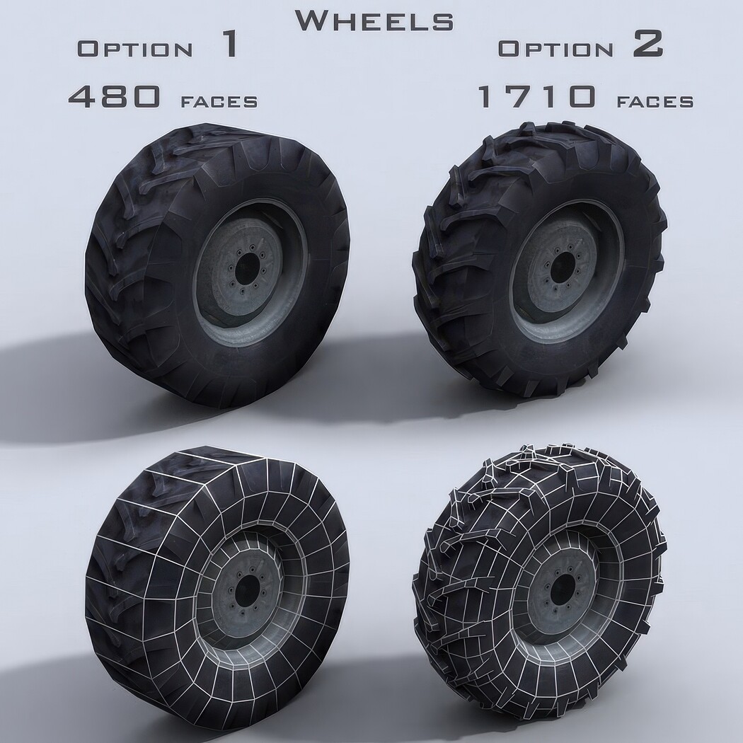Includes 2 optional sets of wheels, one of them at lower resolution and the other one much more detailed. (see pics)