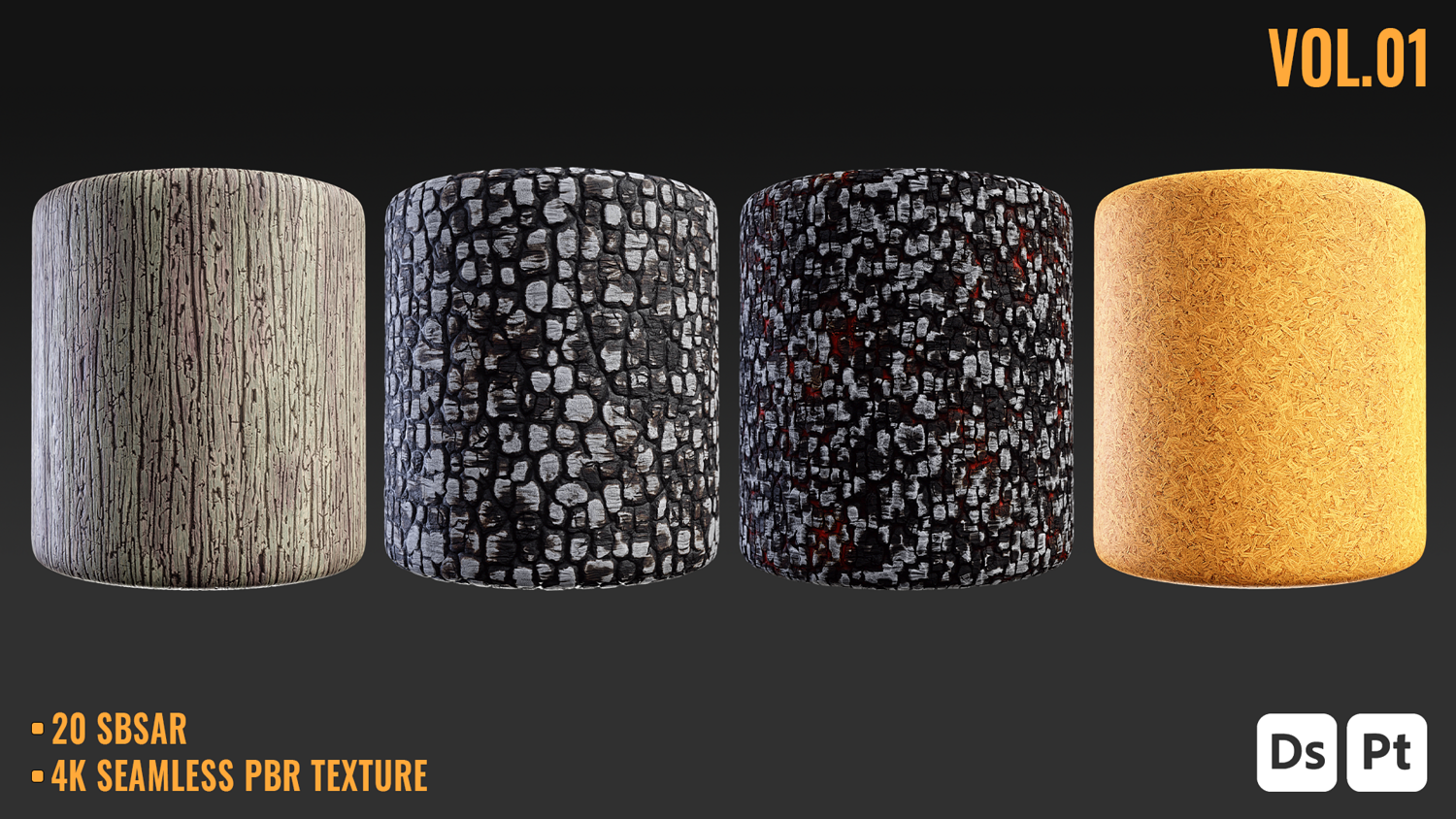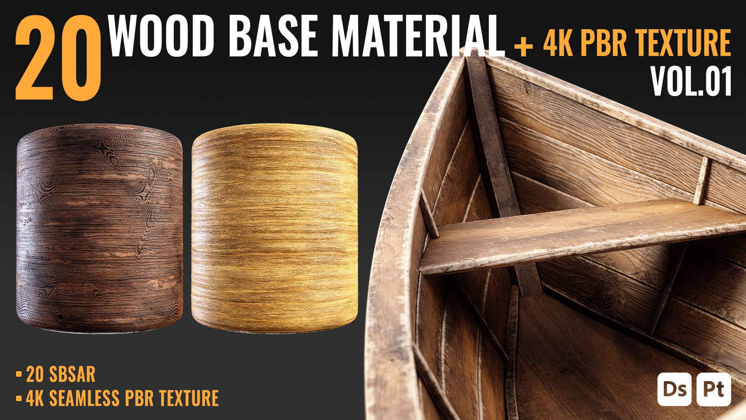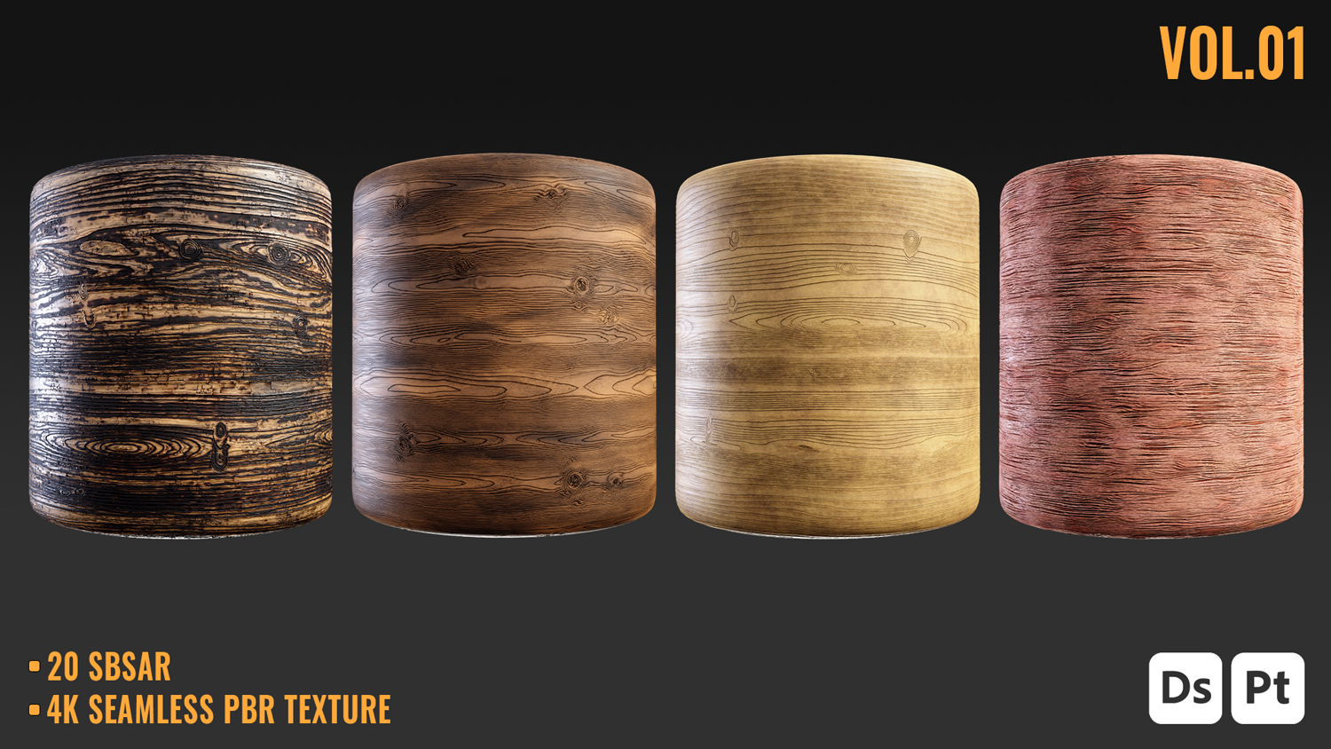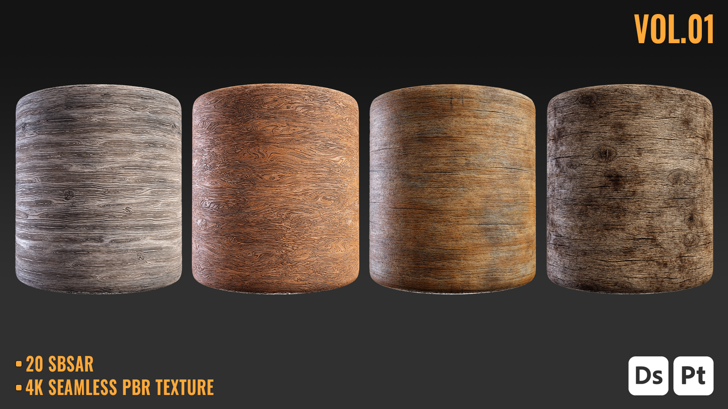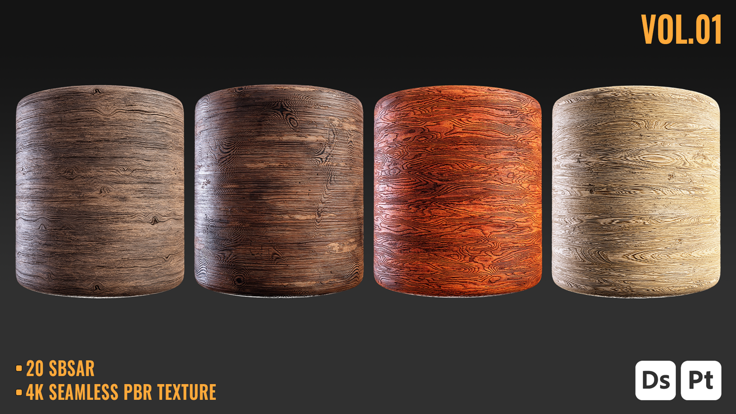 Here's a collection of 20 wood base materials (Sbsar) and 4K seamless PBR texture sets. You can use the PBR Textures for any program that works with PBR workflow. Also you can change the parameters in each sbsar file such as base Color, roughness, height, normal and AO. Bring reality to your work!