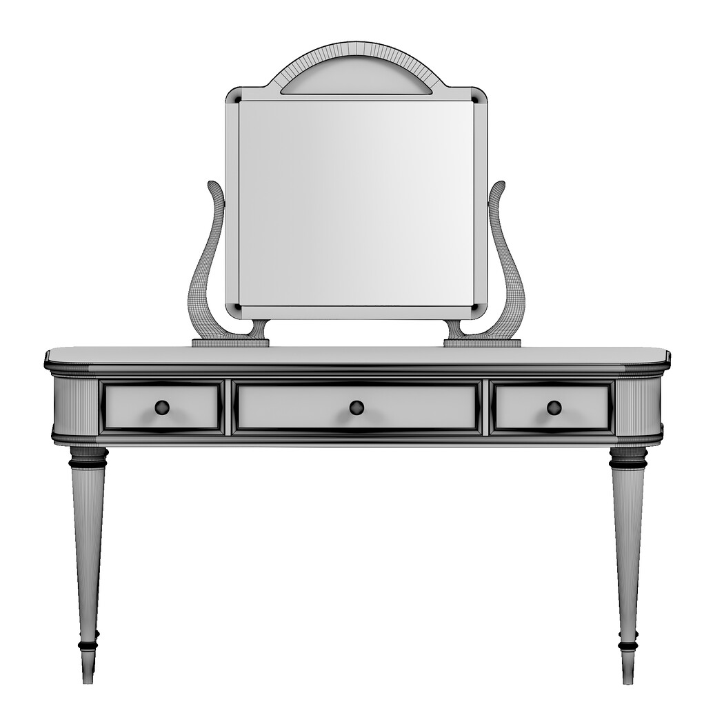 Name: dressing table 02 Type: model Format: 3Ds Max 2013 Export: FBX, OBJ, MAT Render: VRay (4.x), Corona (6) Polys: 170996 Verts: 171539 Matclasses: Multimaterial,VRayMtl,CoronaMtl Units: Centimeters Dimension: 138.53 x 49.62 x 139.84 Date: 2025.6.14