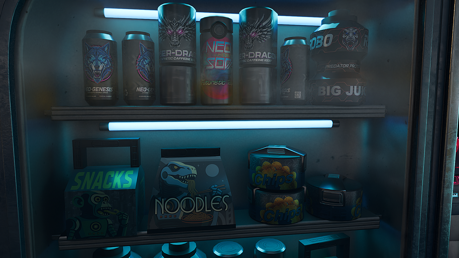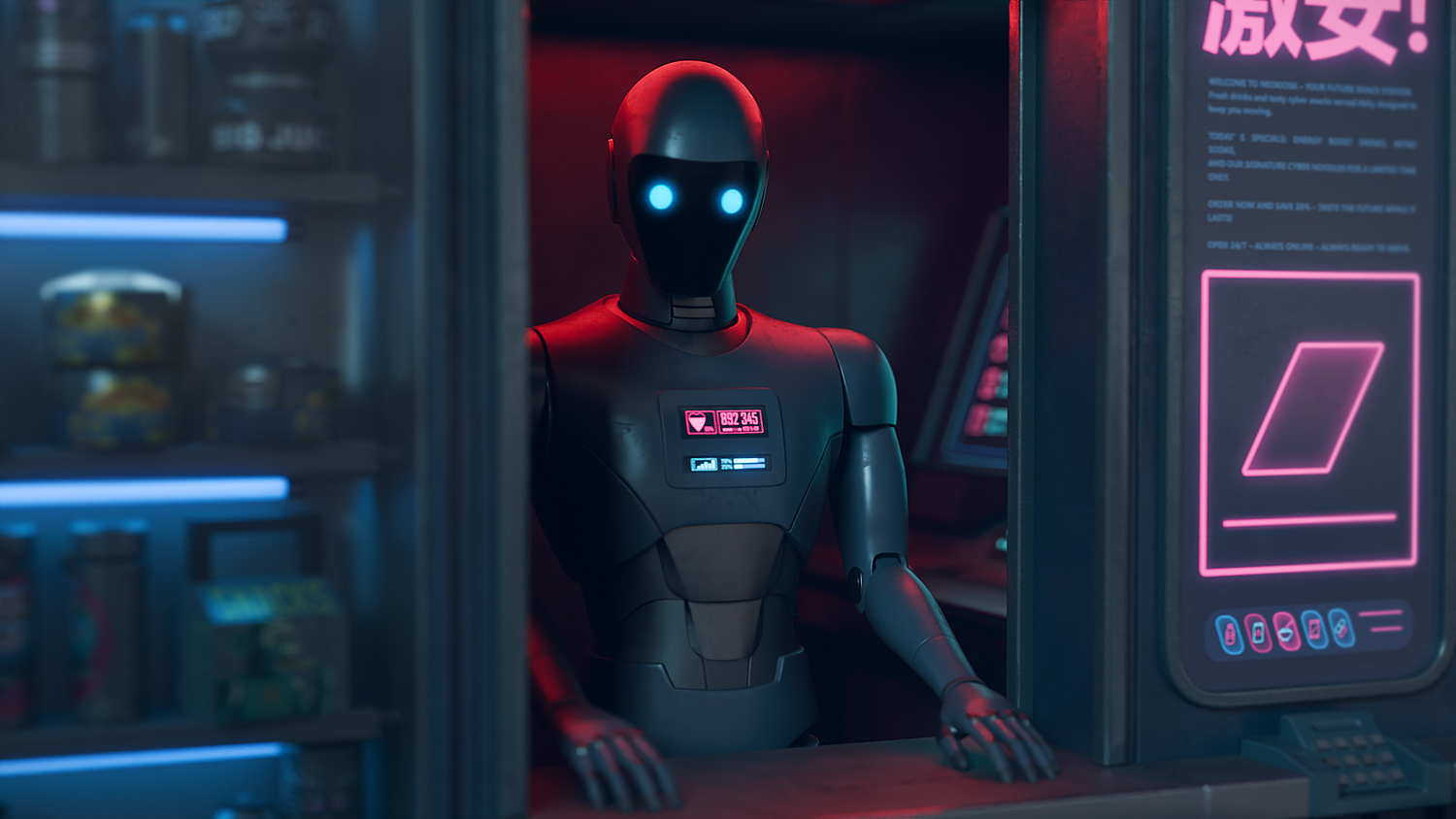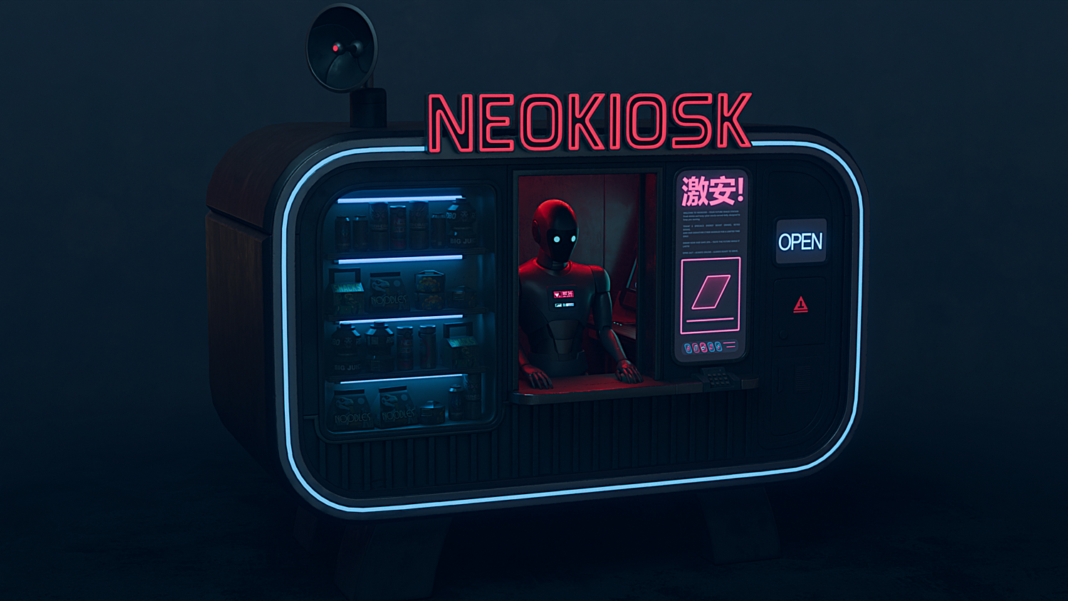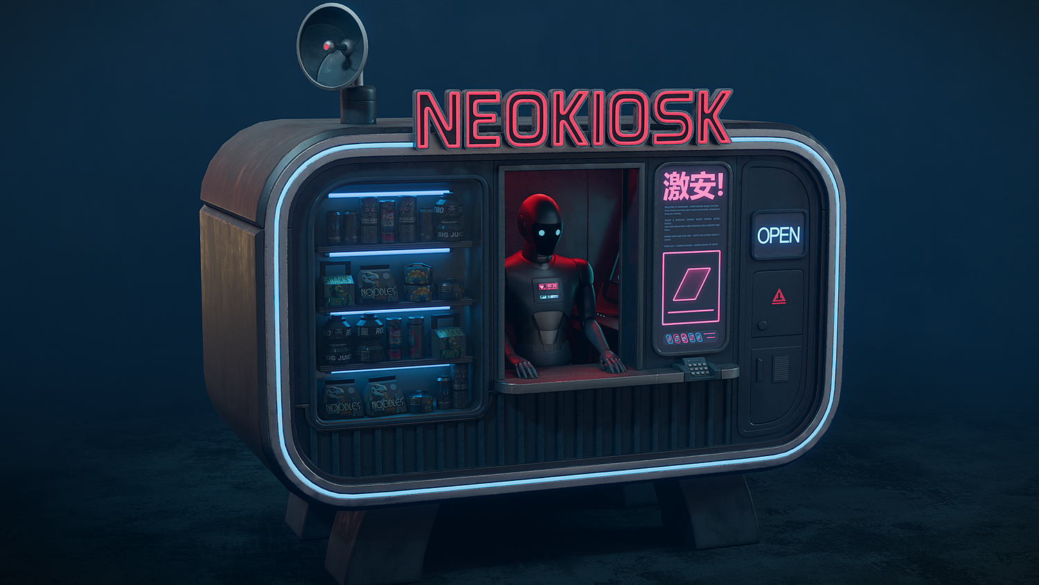 NEOKIOSK is a 3D model of an automated kiosk in a cyberpunk/futuristic style. Featuring neon signs, LED lights, a showcase filled with snacks and drinks, and the presence of an android. Perfect for bringing sci-fi scenes, video games, and futuristic urban environments to life. The model is optimized and ready to use.