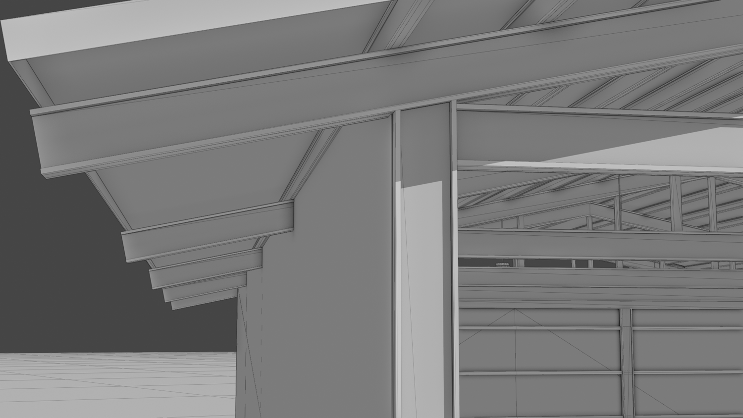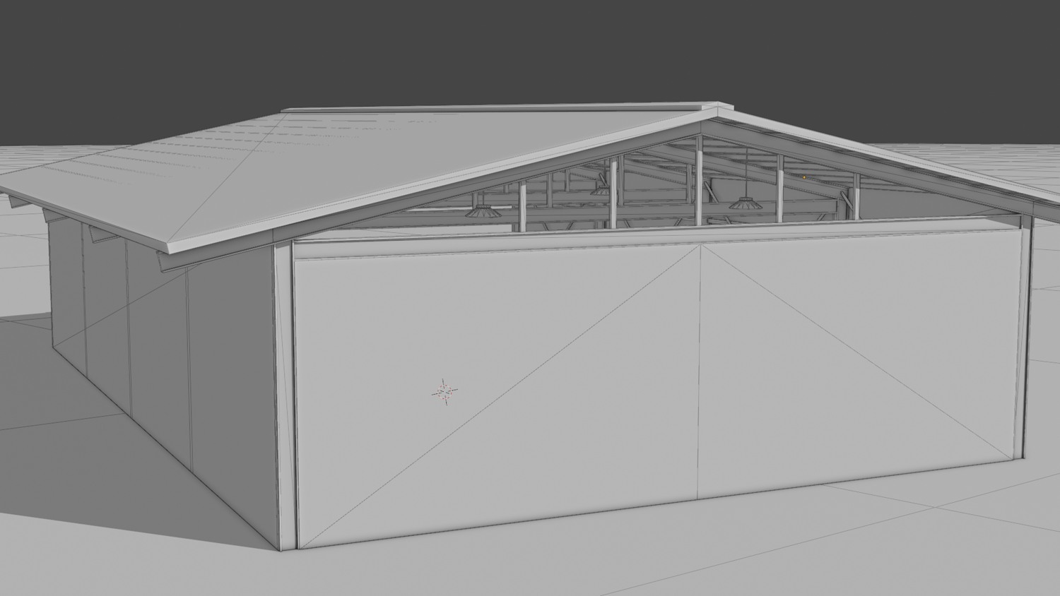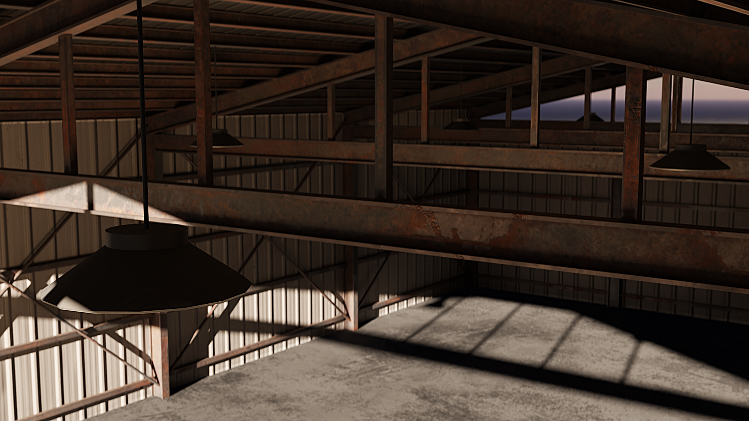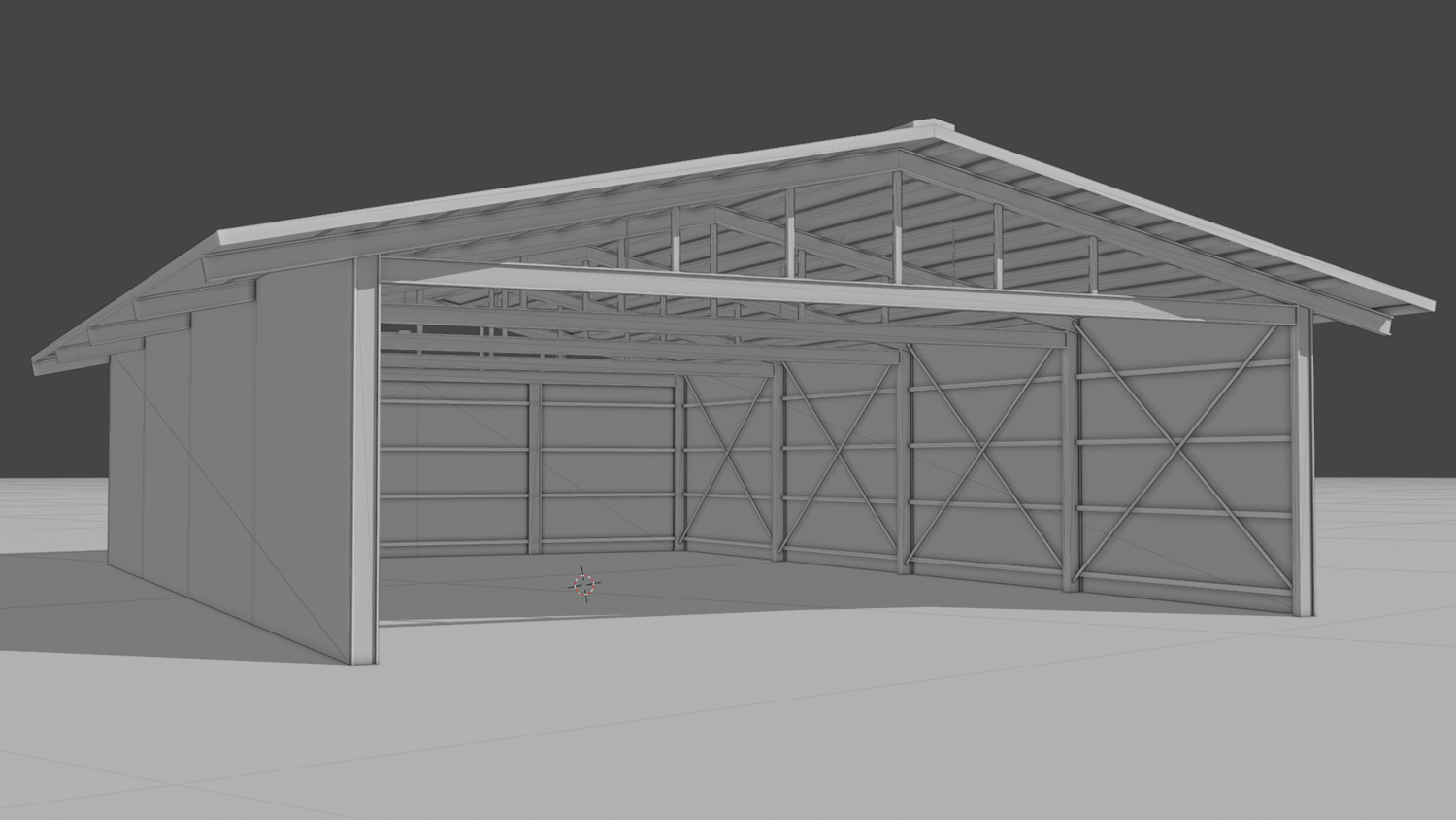 Industrial metal hangar, lowpoly model optimized for games and animations, composed of metal sheets and steel beams. The textures feature light wear, with rust and dirt details, making it suitable for industrial, rural, or post-apocalyptic environments.