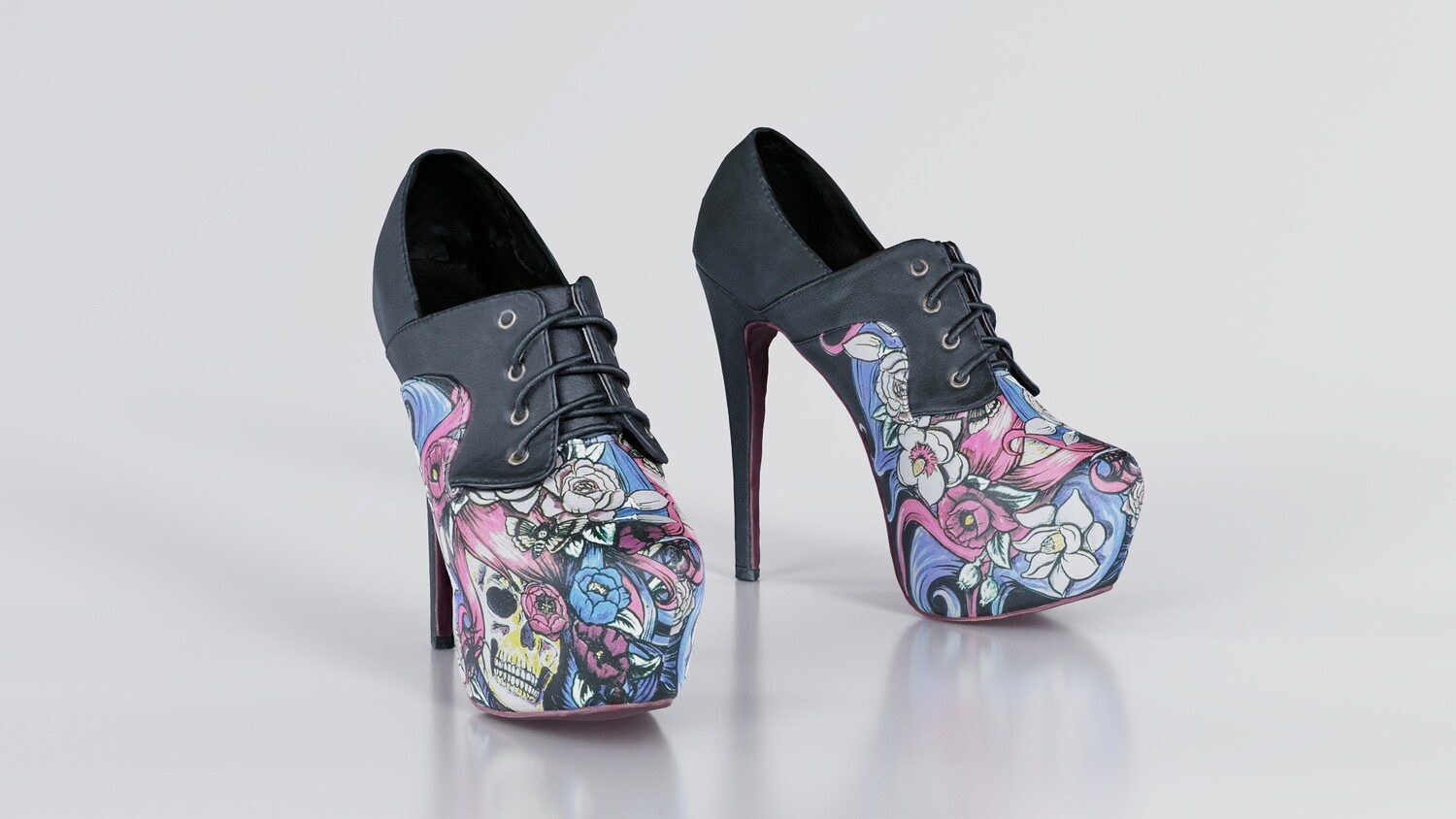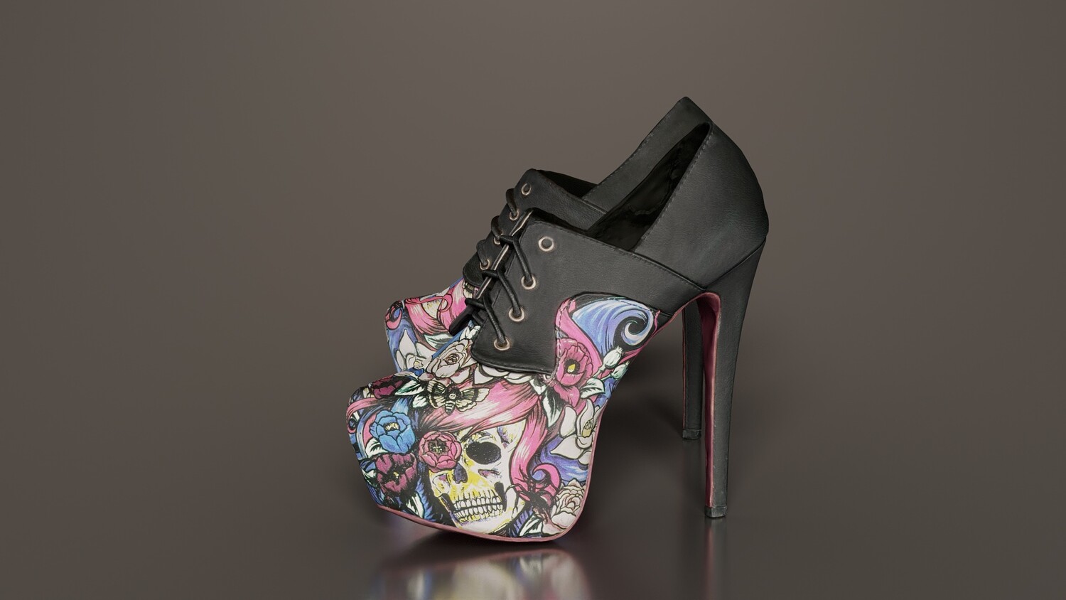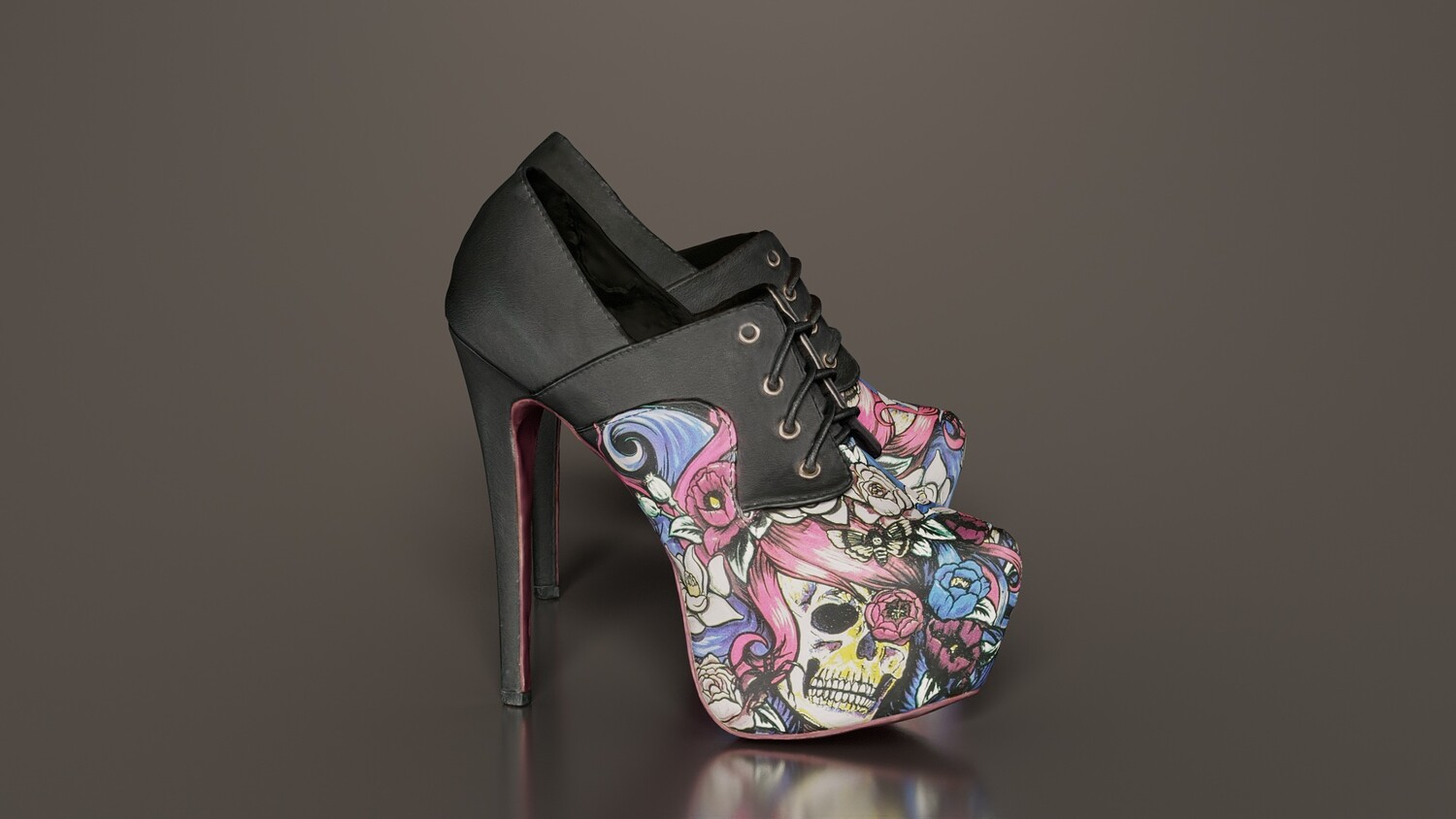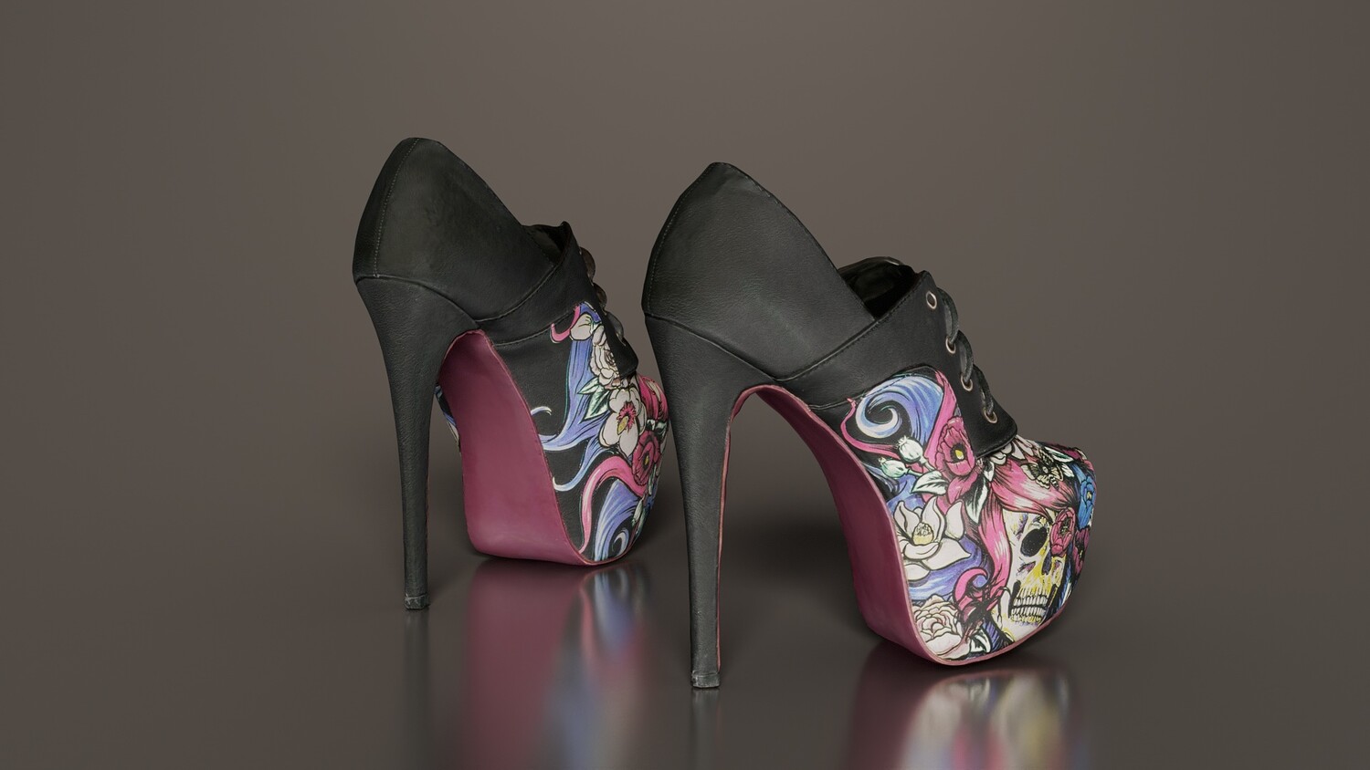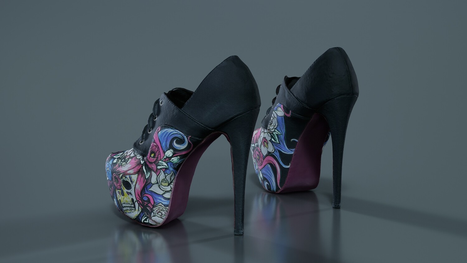 This model, decorated leather heels, has been created using photogrammetry from a real world object. It is featuring a pair of high heels with colorful skulls on them. The 3D Model is part of the Polygonal Miniatures Remastered collection, which has been optimized with better shaders, correct scaling (meters) and centered position. We use multi camera capturing in the 3D scanning process. The scan data is cleaned and processed in Zbrush and Photoshop. In the end, the low poly product contains unwrapped UV's, textures and normals maps. Detailed specifications can be found below:
