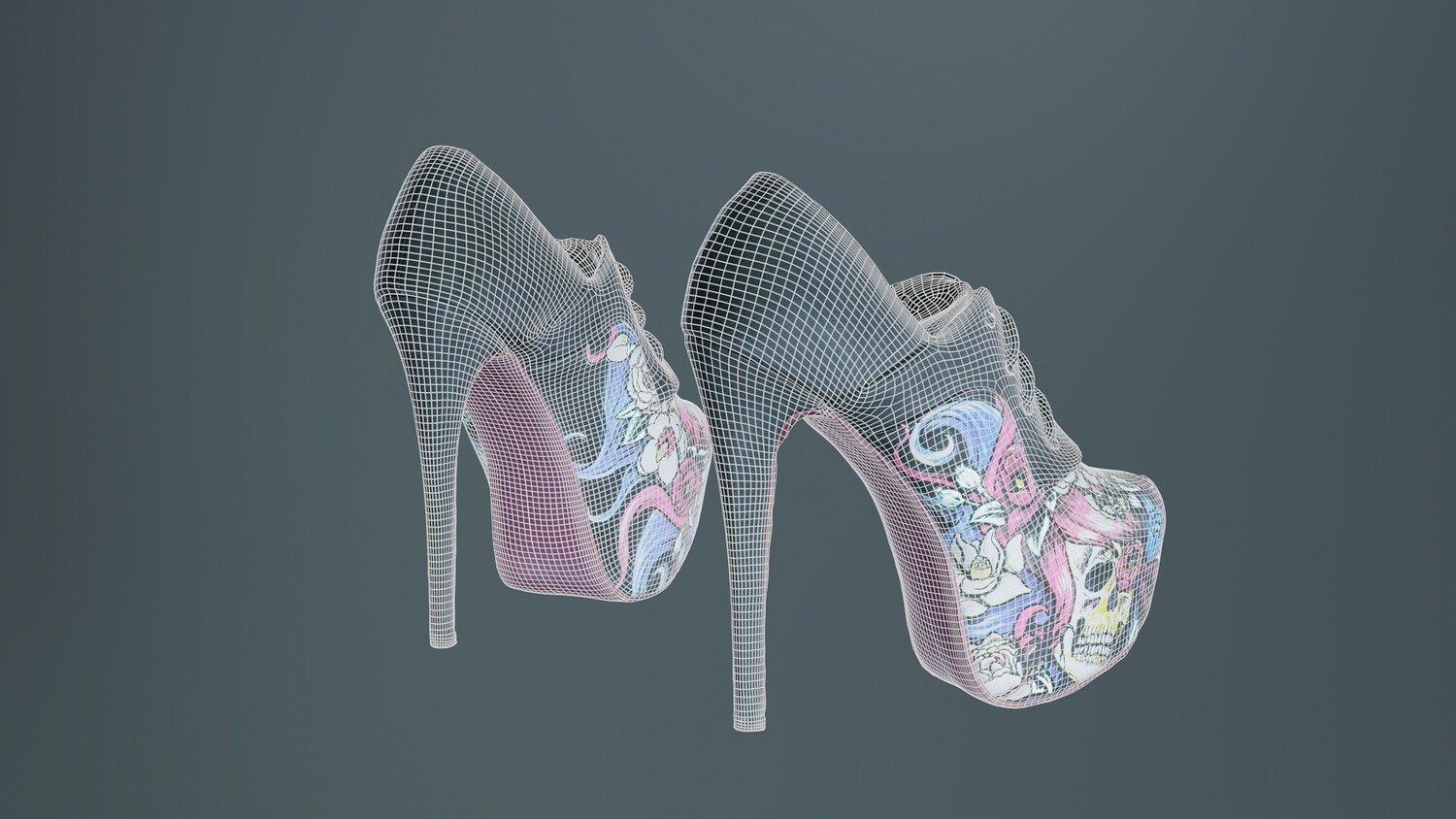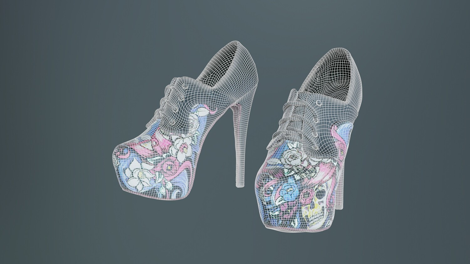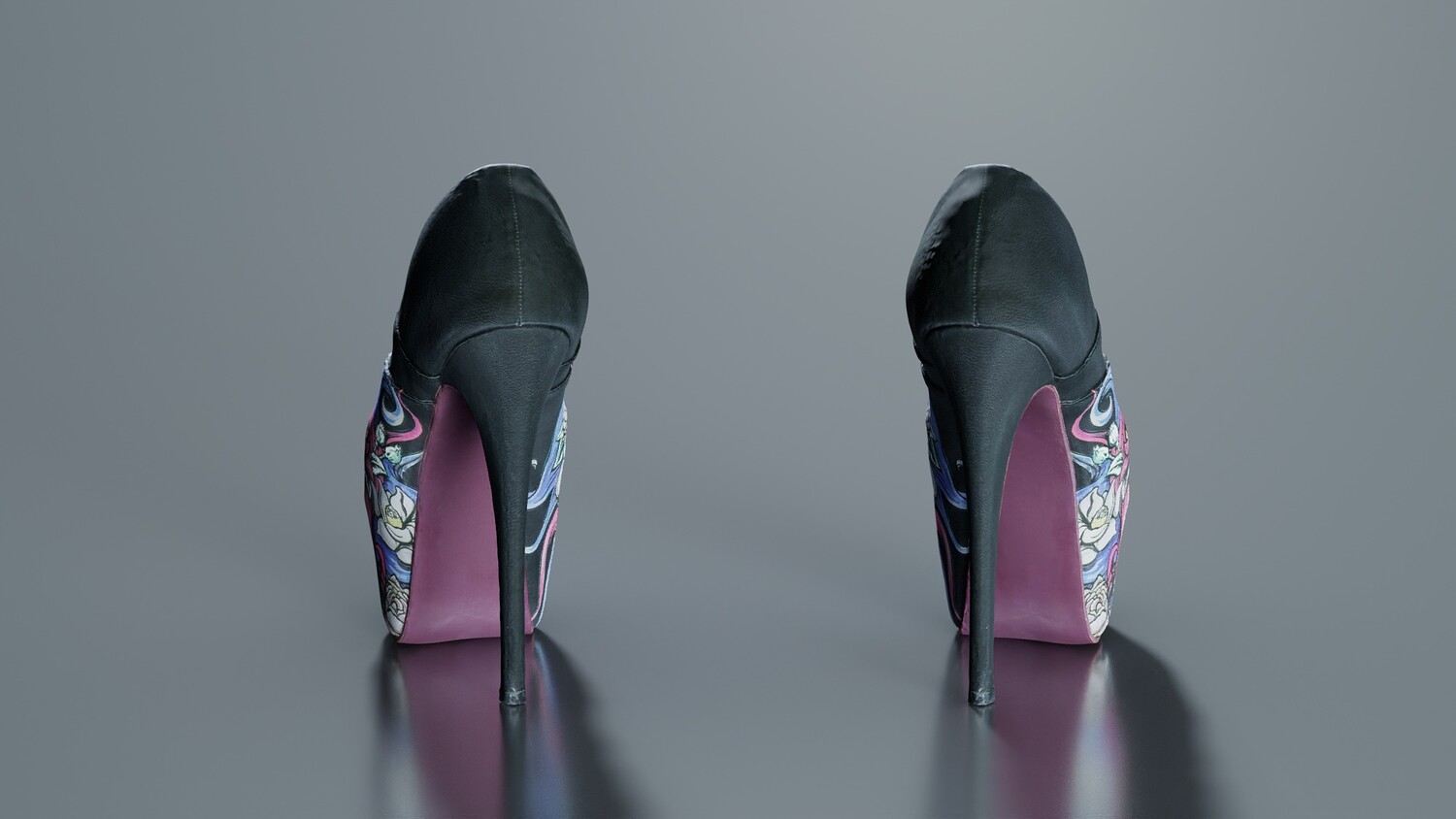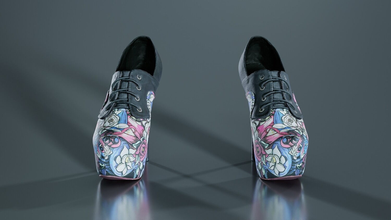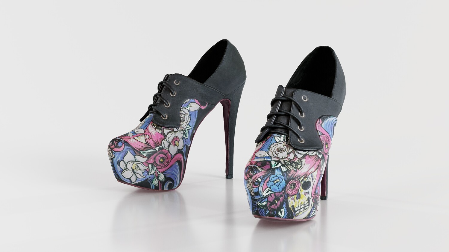 This model, decorated leather heels, has been created using photogrammetry from a real world object. It is featuring a pair of high heels with colorful skulls on them. The 3D Model is part of the Polygonal Miniatures Remastered collection, which has been optimized with better shaders, correct scaling (meters) and centered position. We use multi camera capturing in the 3D scanning process. The scan data is cleaned and processed in Zbrush and Photoshop. In the end, the low poly product contains unwrapped UV's, textures and normals maps. Detailed specifications can be found below: