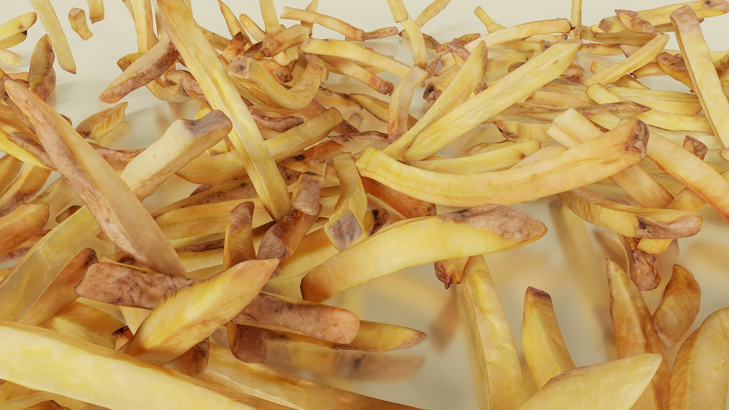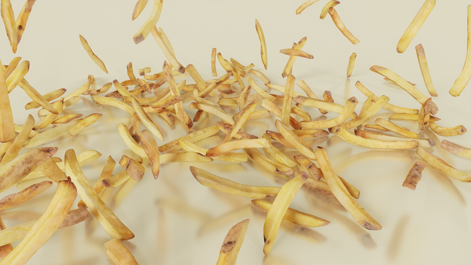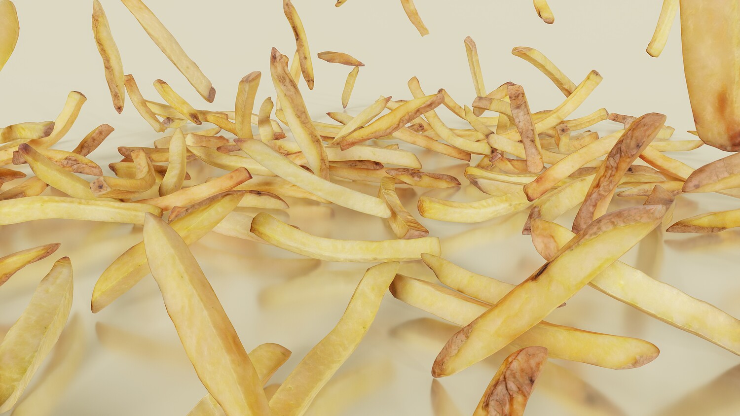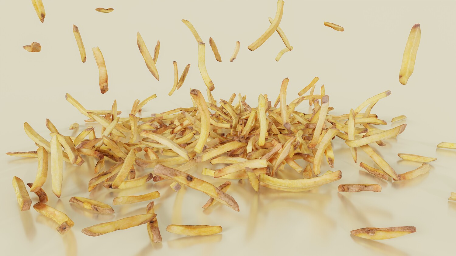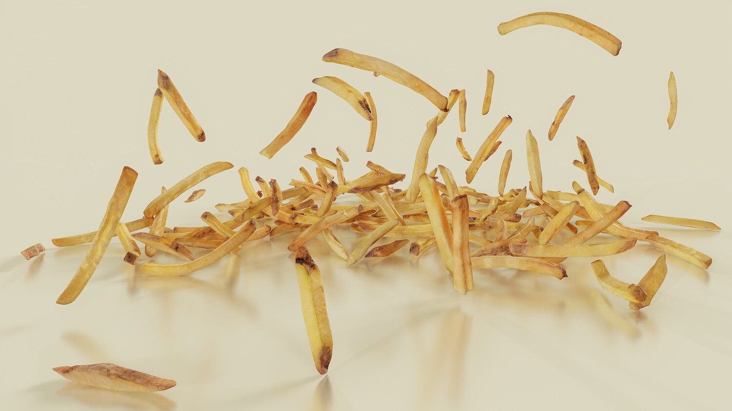 A Blender File with Python Script is included that drops sets of fries from a height. Can be used for simulation animation or stills.