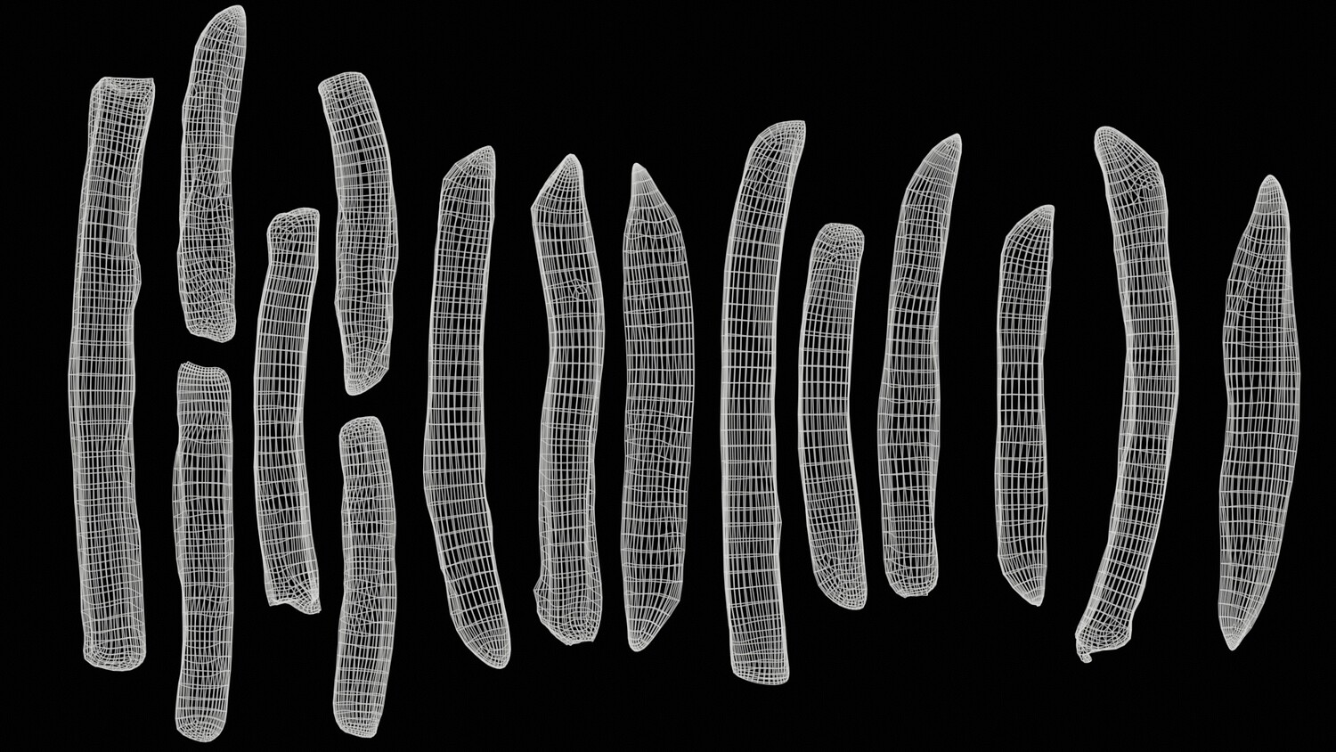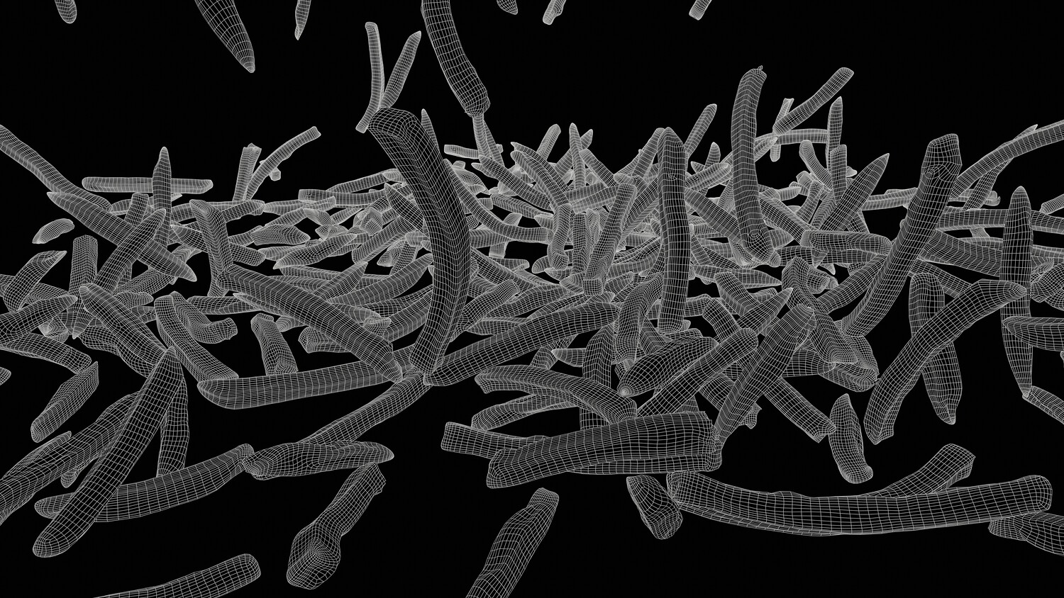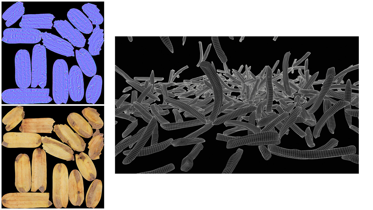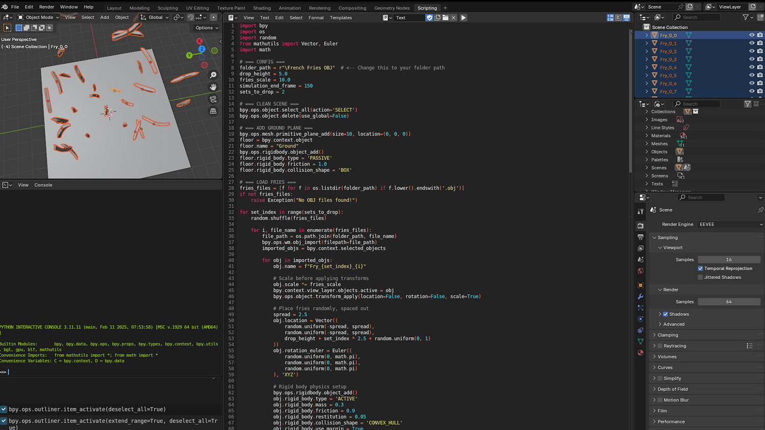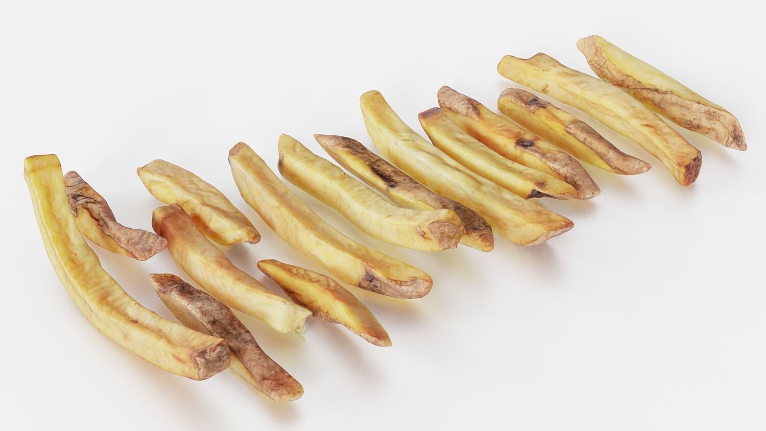 A Blender File with Python Script is included that drops sets of fries from a height. Can be used for simulation animation or stills.