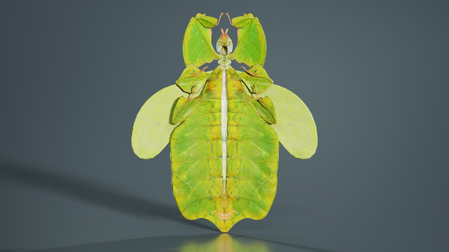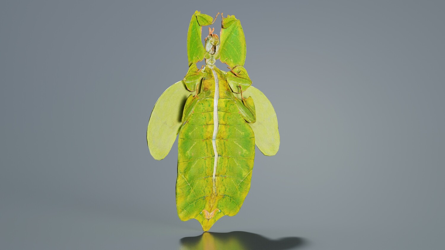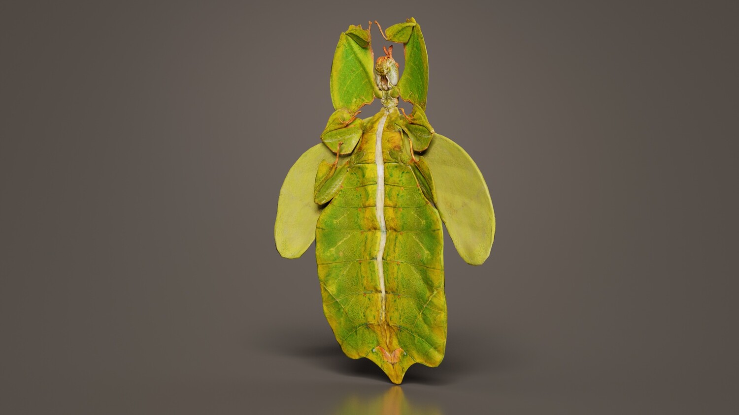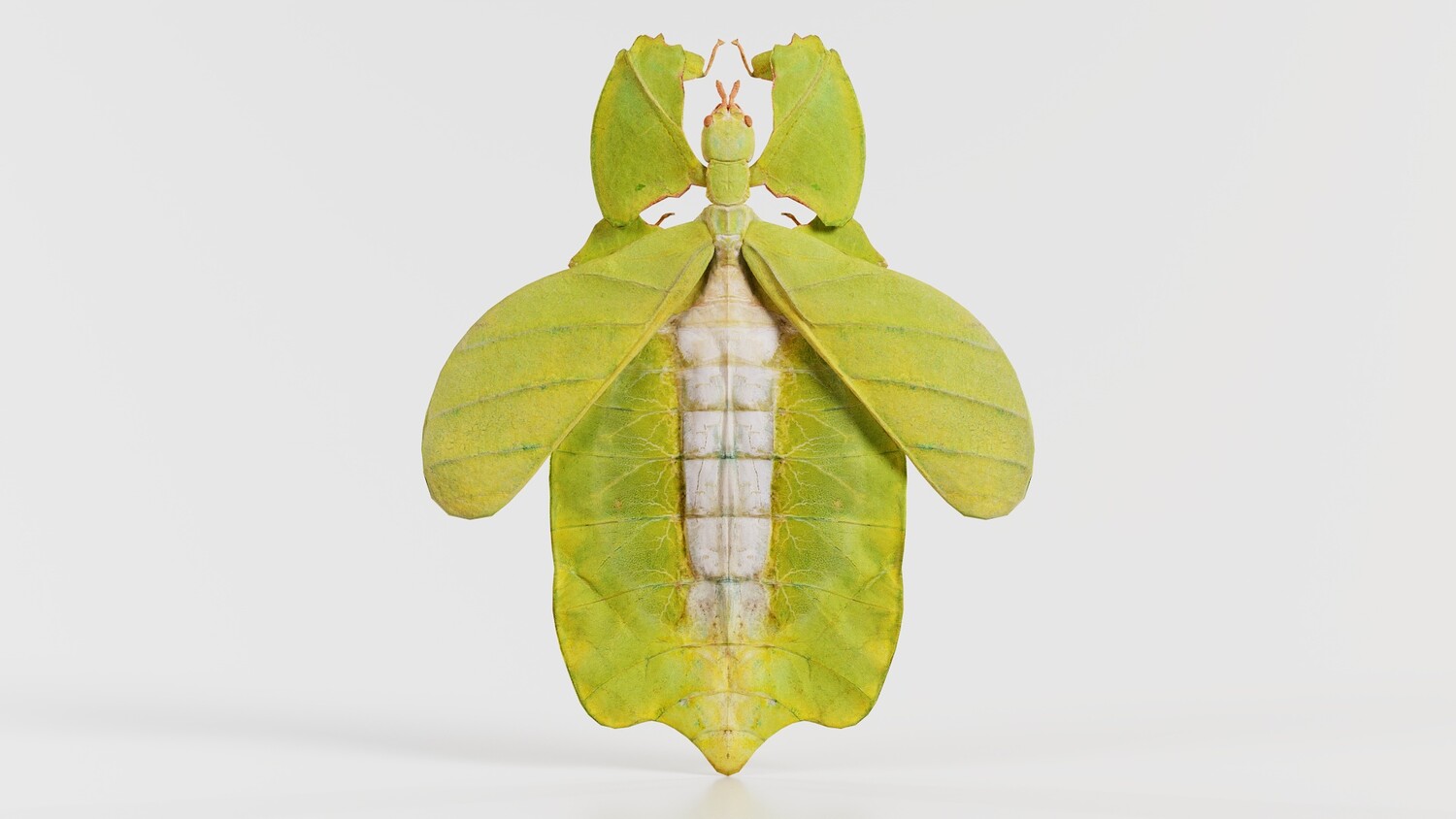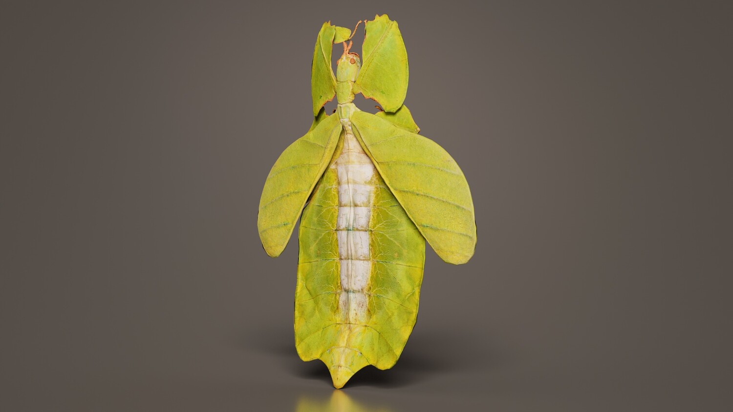 3D scanned model featuring a green insect with a white body and a head. This model, walking leaf phylliidae leaf insect, has been created using photogrammetry from a real world object. The raw scan data has been cleaned, retopologized and UV-unwrapped using Zbrush. The result is a low poly mesh with baked maps. The .obj and .mtl are configured so that maps will load automatically in the shader (tested in Blender). In addition, a Blender scene is provided with the model and shader already set up for rendering and export. Detailed information below: