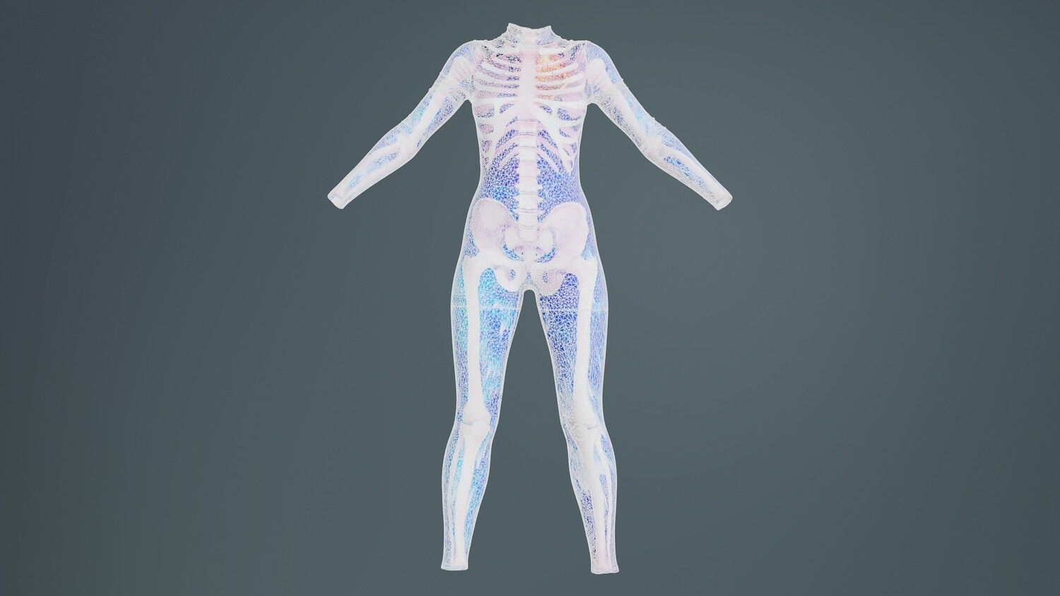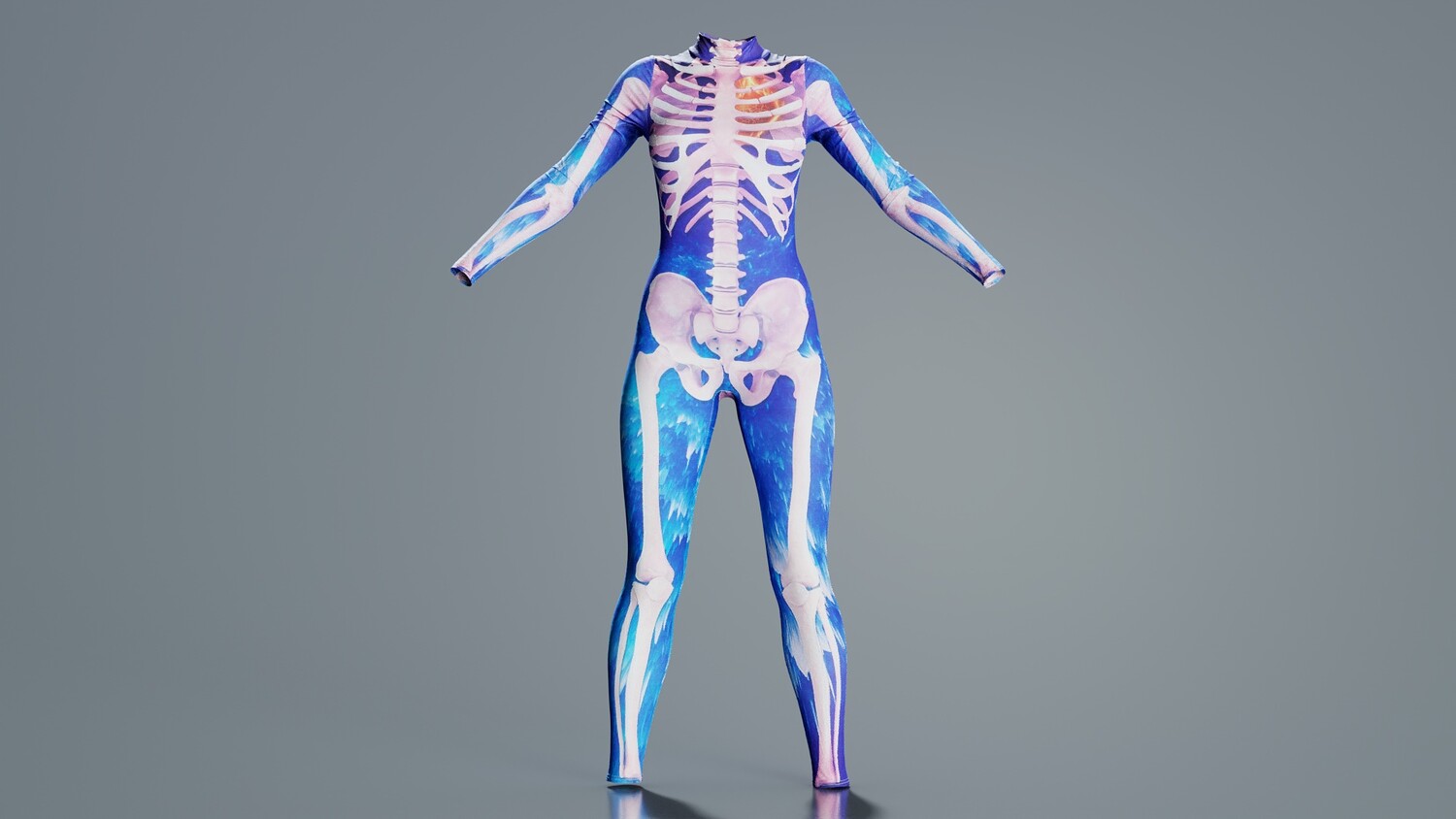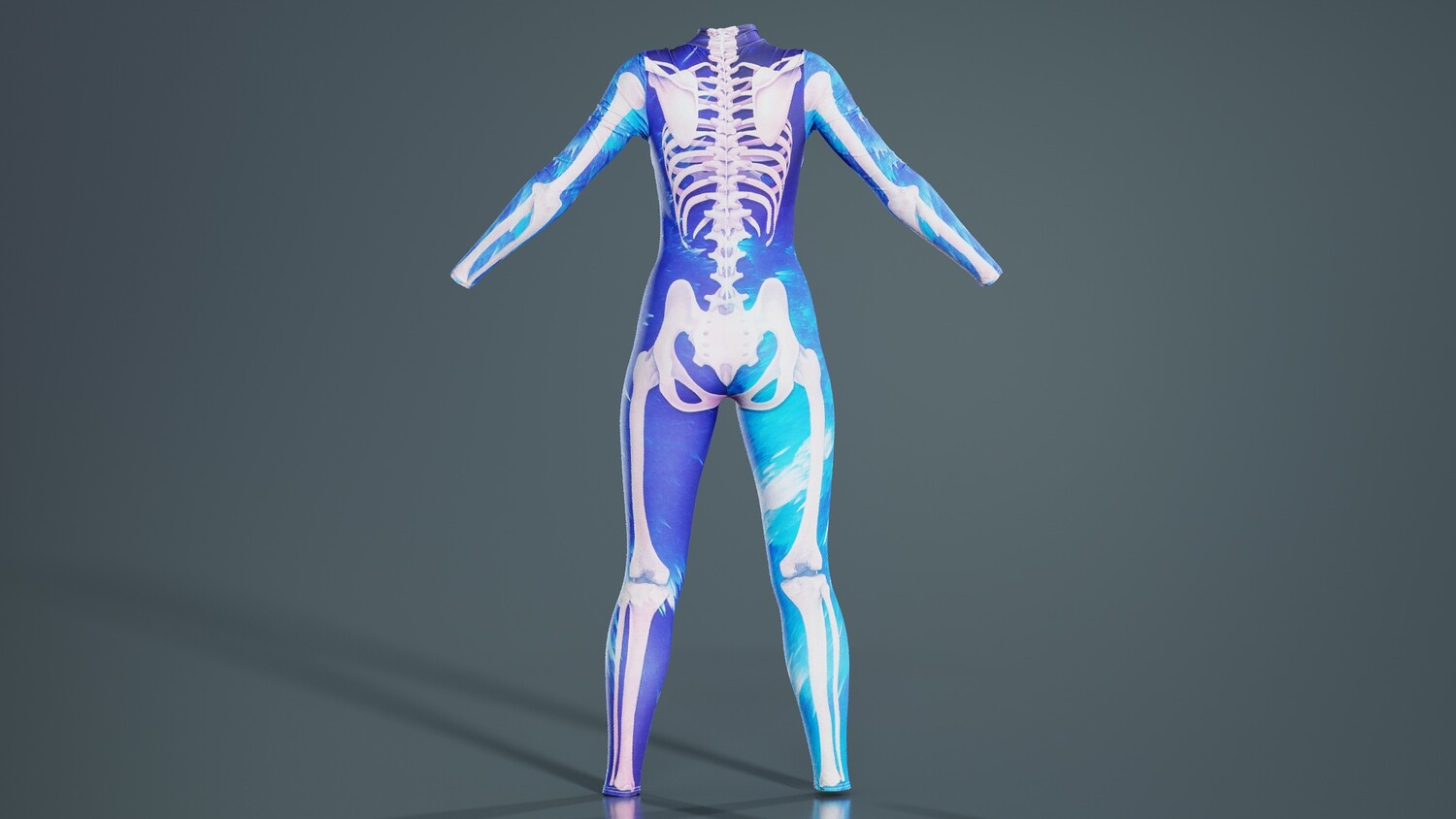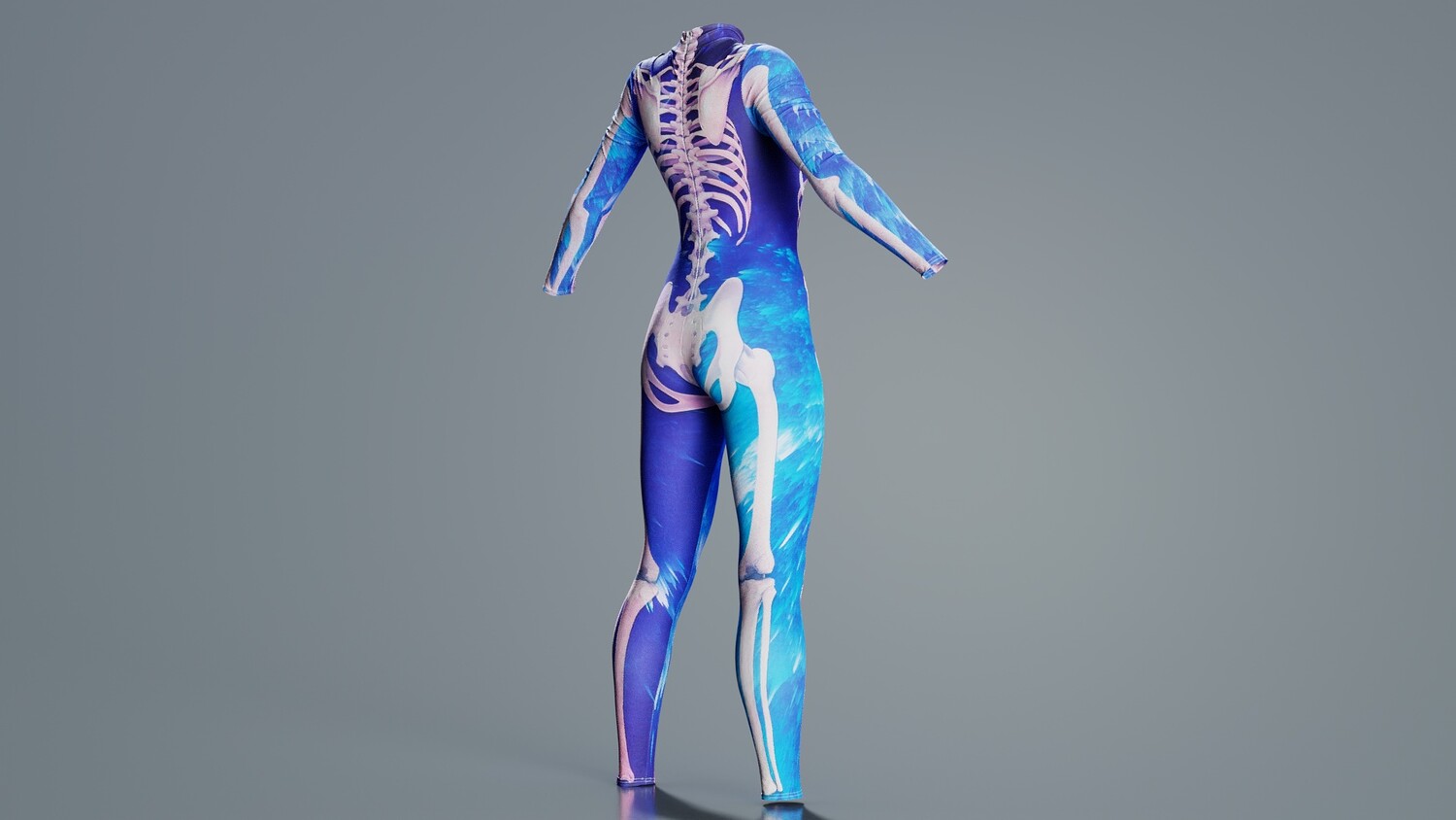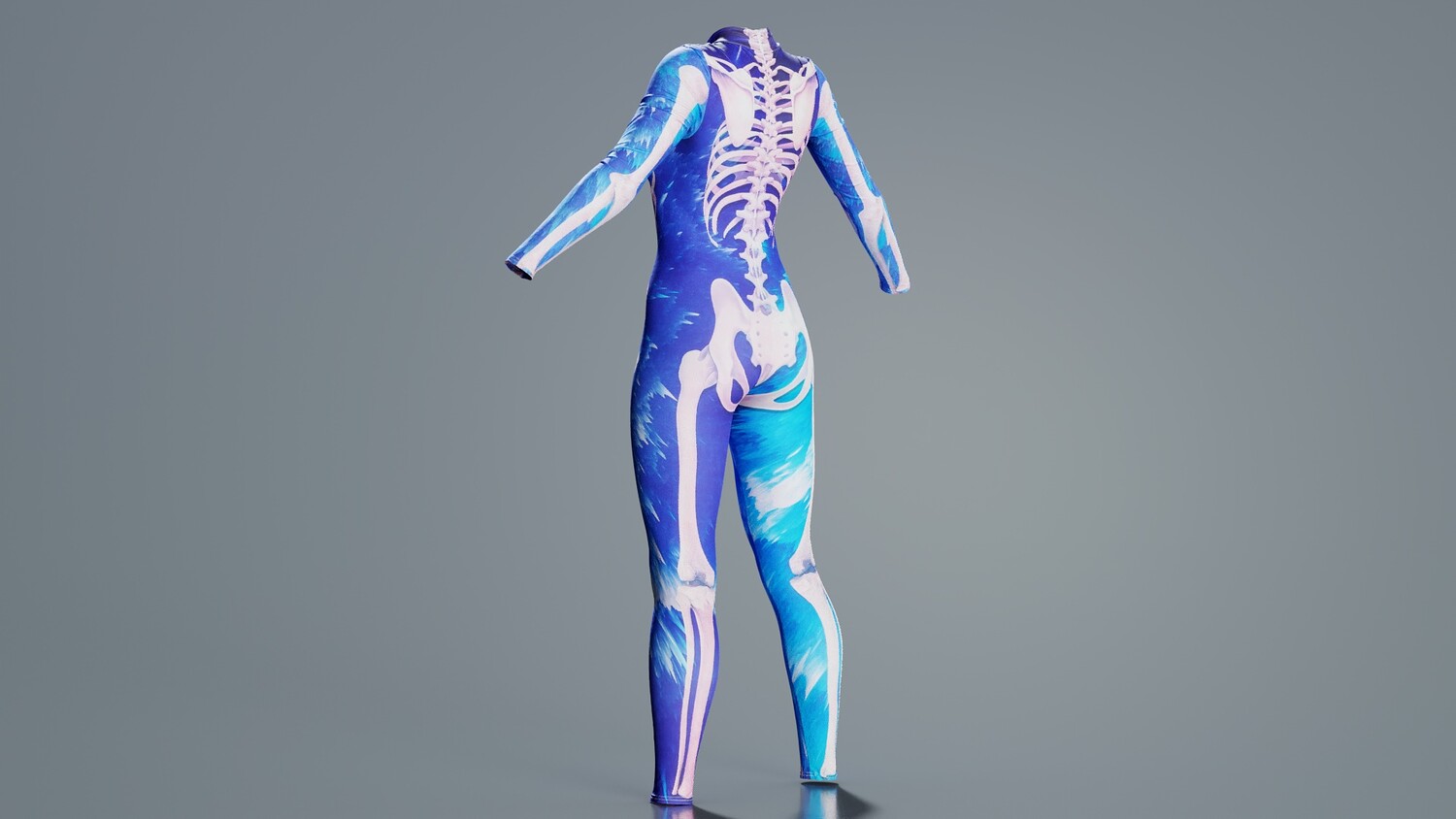 Model Tags: apparel, blue, body, bodysuit, catsuit, character, clothes, clothing, colors, designer, female, flaming, full, girl, heart, human, lady, outfit, pink, skeleton