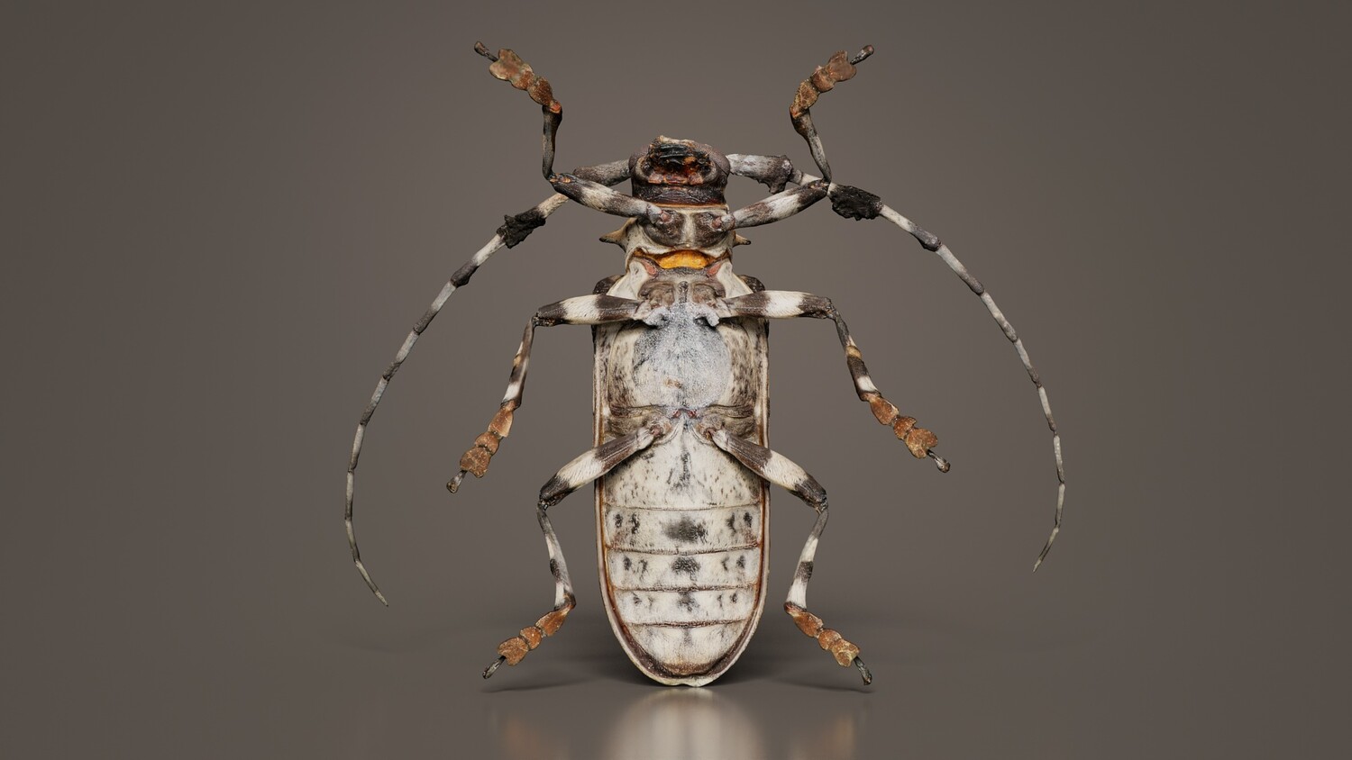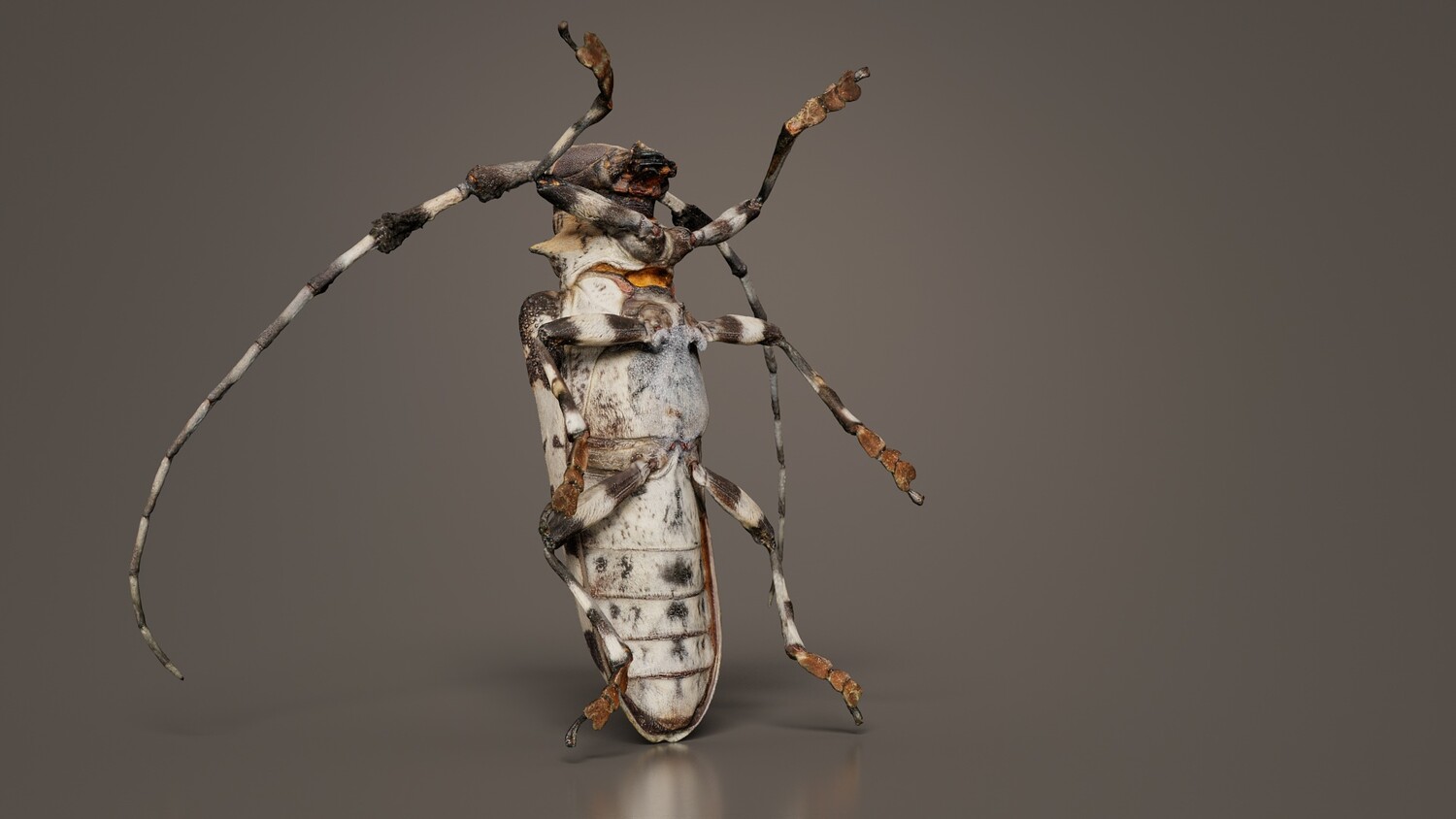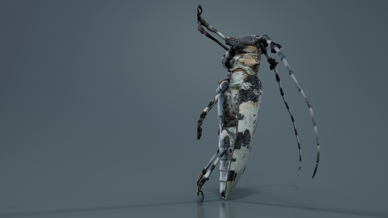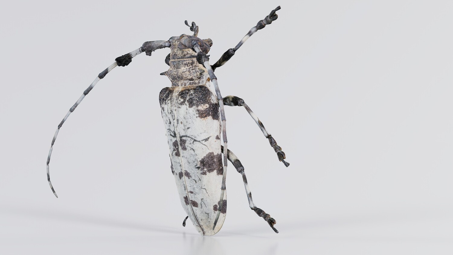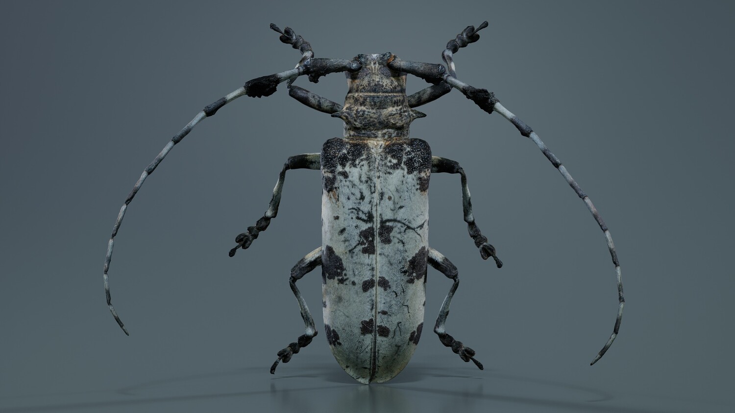 Polygonal Miniatures presents longhorn beetle cerambycidae, a model from our 3D scanned catalogue. The model, a large bug with black and white spots, is obtained by photogrammetry, and scanned using SLR camera's. Processing takes place in Zbrush and Photoshop and the resulting 3D model has unwrapped, non overlapping UV's, and a texture and normal map. Before publishing, we make sure the model has real world scale (meters), correct shader setup and is centered at the origin. Apart from the various file formats, we also offer a Blender file with material and textures set-up, ready for export and rendering. More info can be found below: